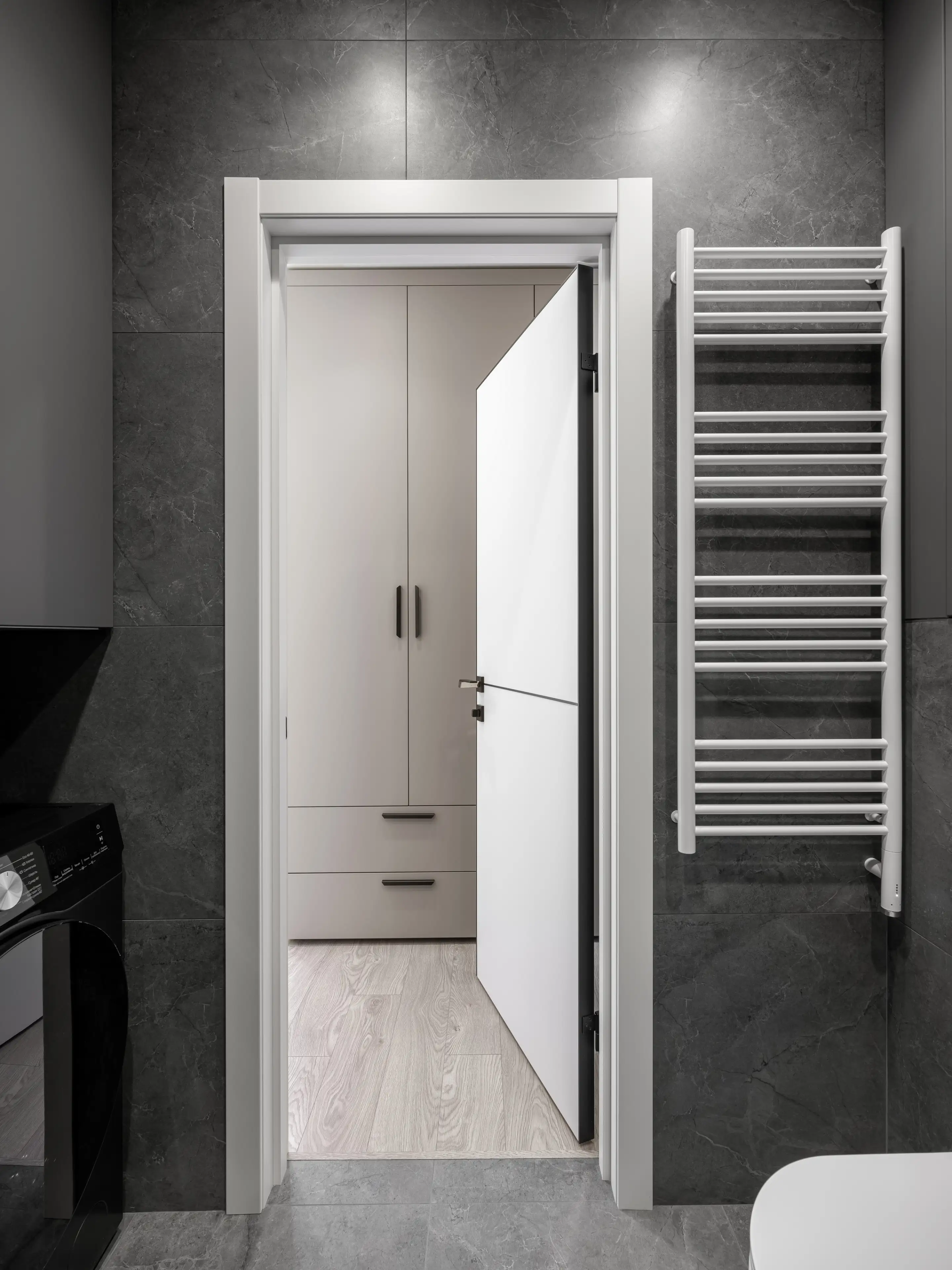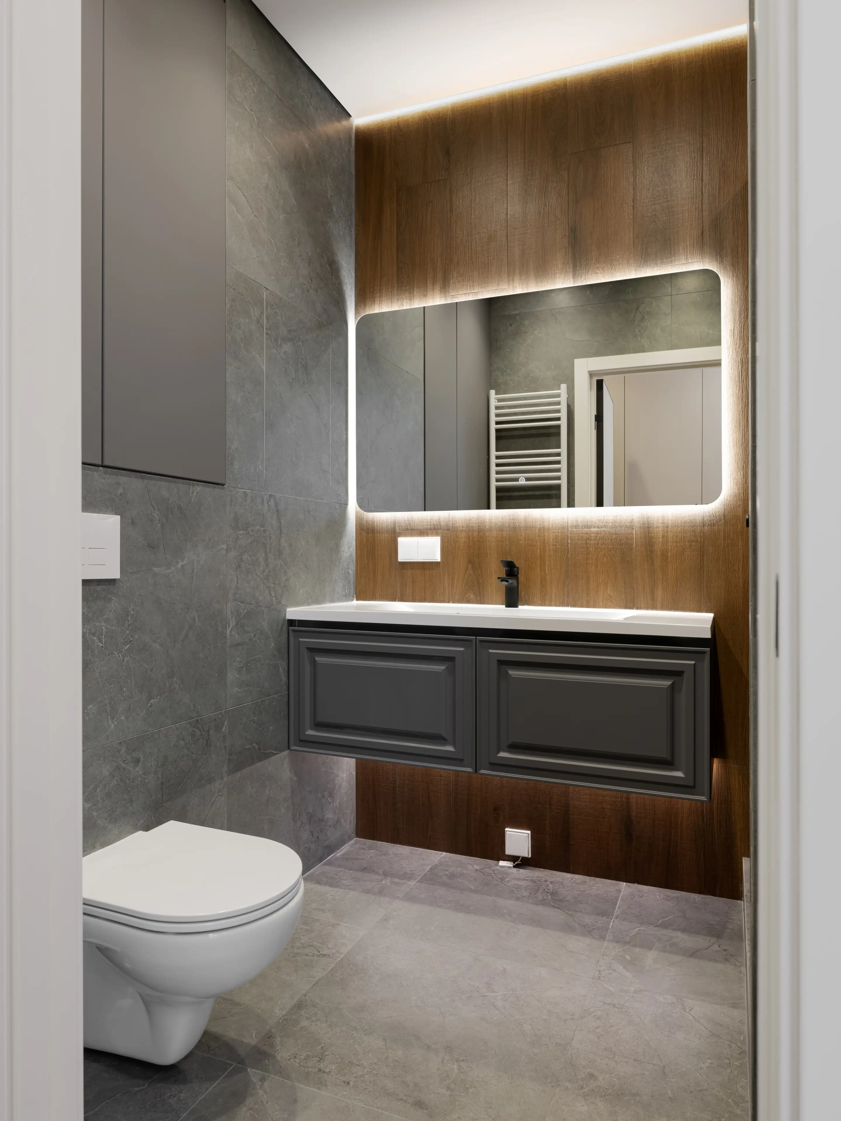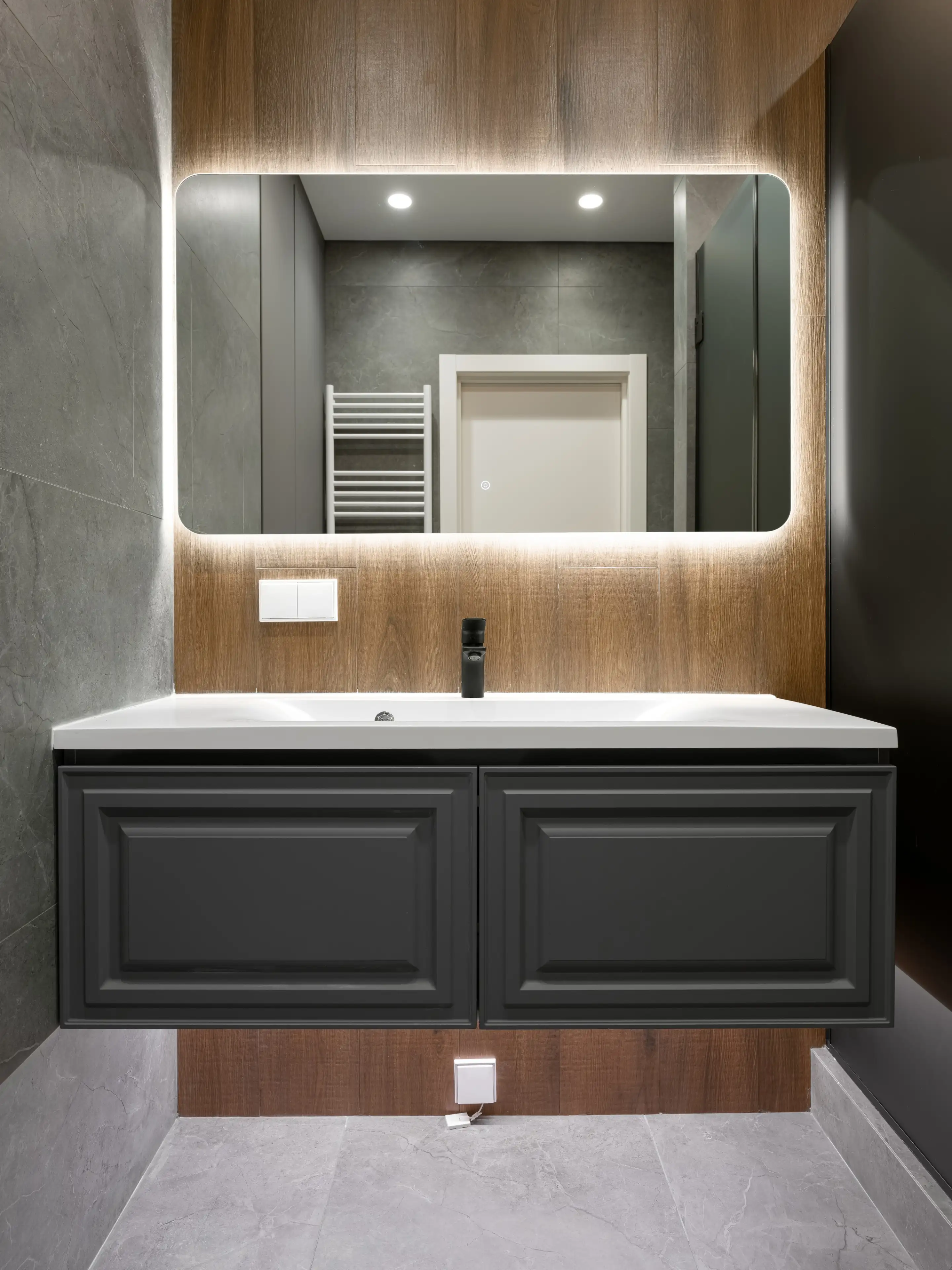 Фоновой плиткой служит керамогранит серого цвета с фактурой микроцемента. А корпусная мебель выполнена в серых и чёрных тонах.
