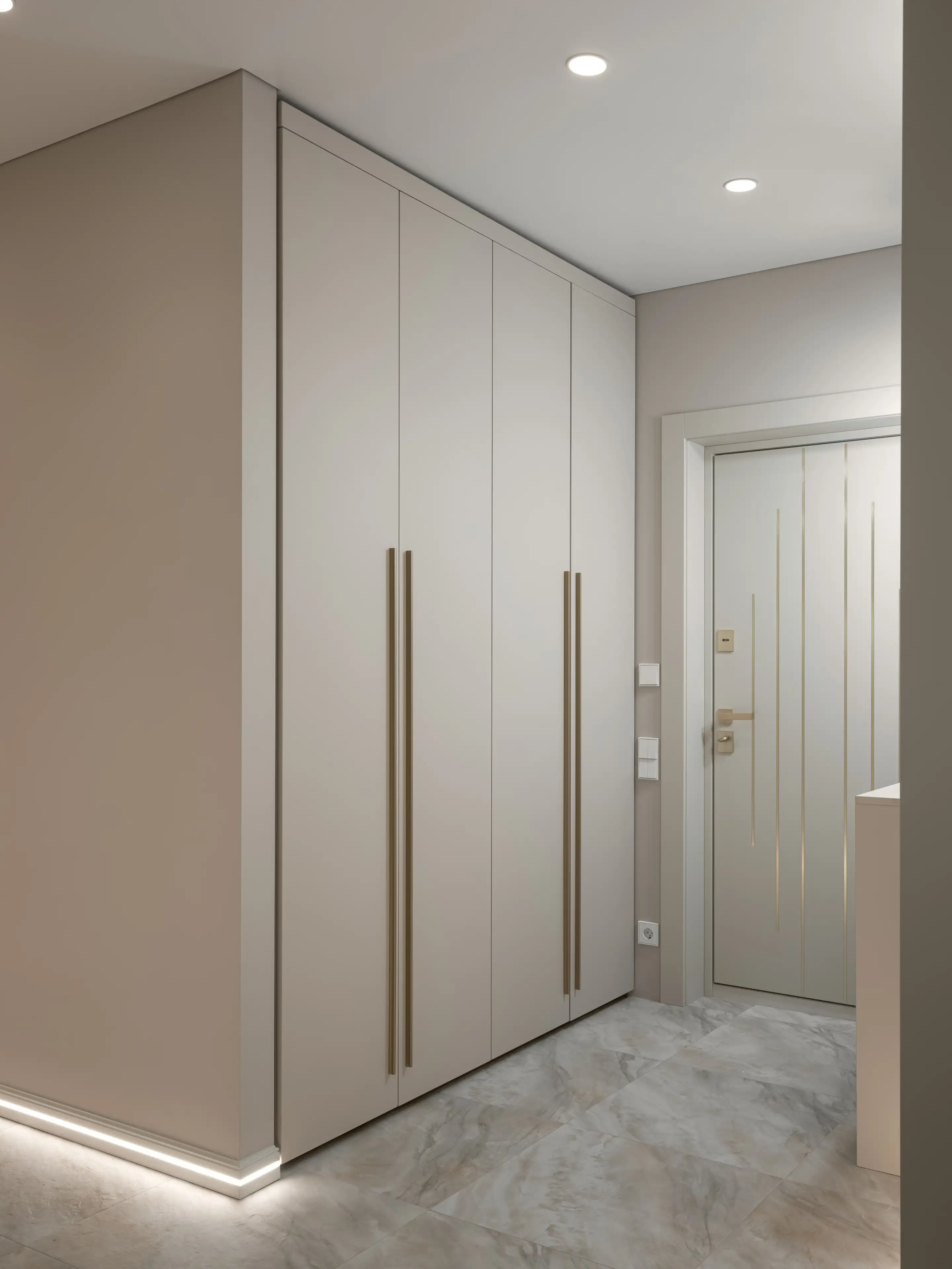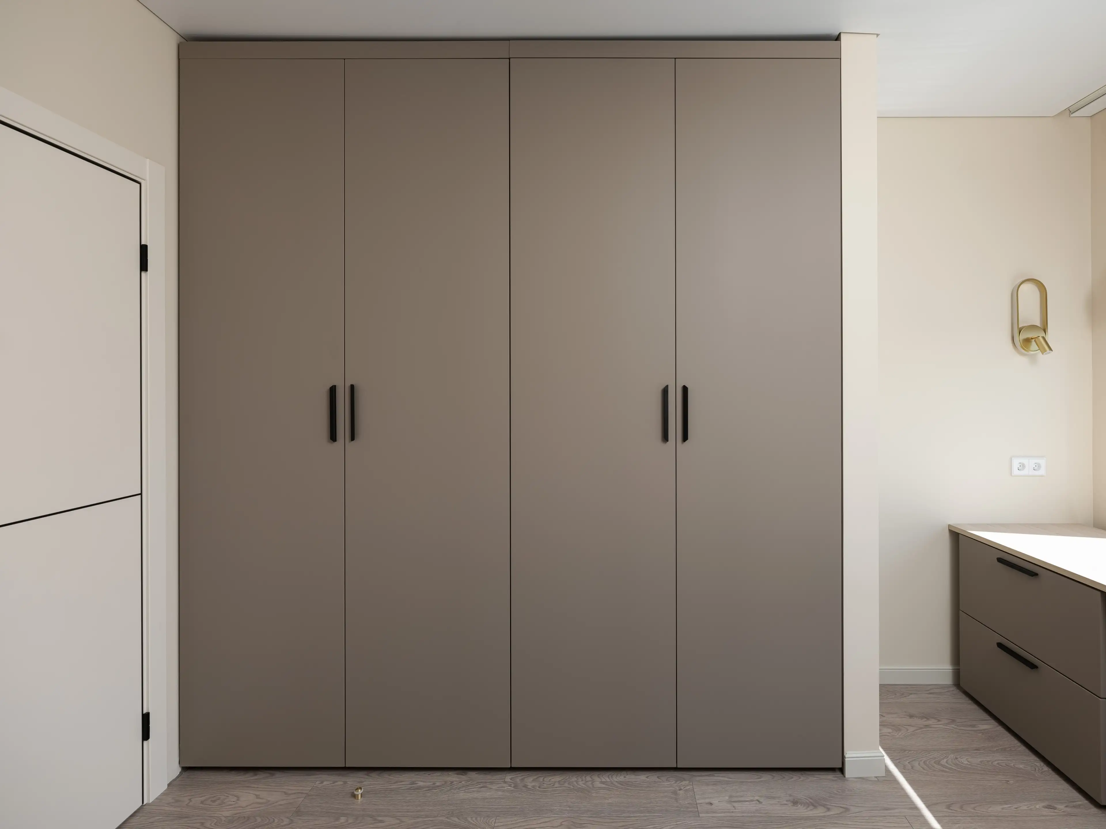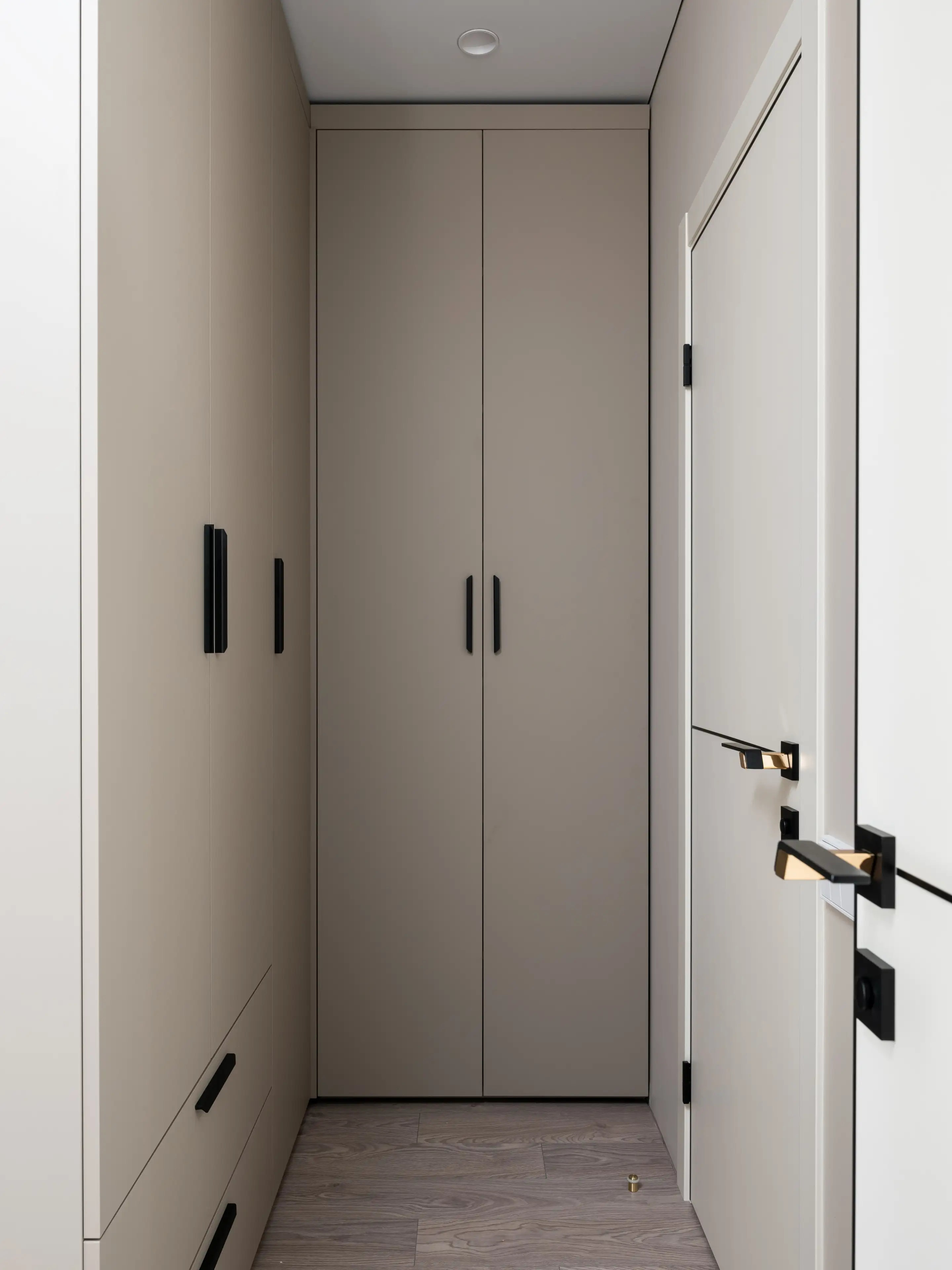 Спрятанный в нише высокий шкаф с лаконичными фасадами и с выразительными ручками из золотистого металла вмещает все необходимые вещи.