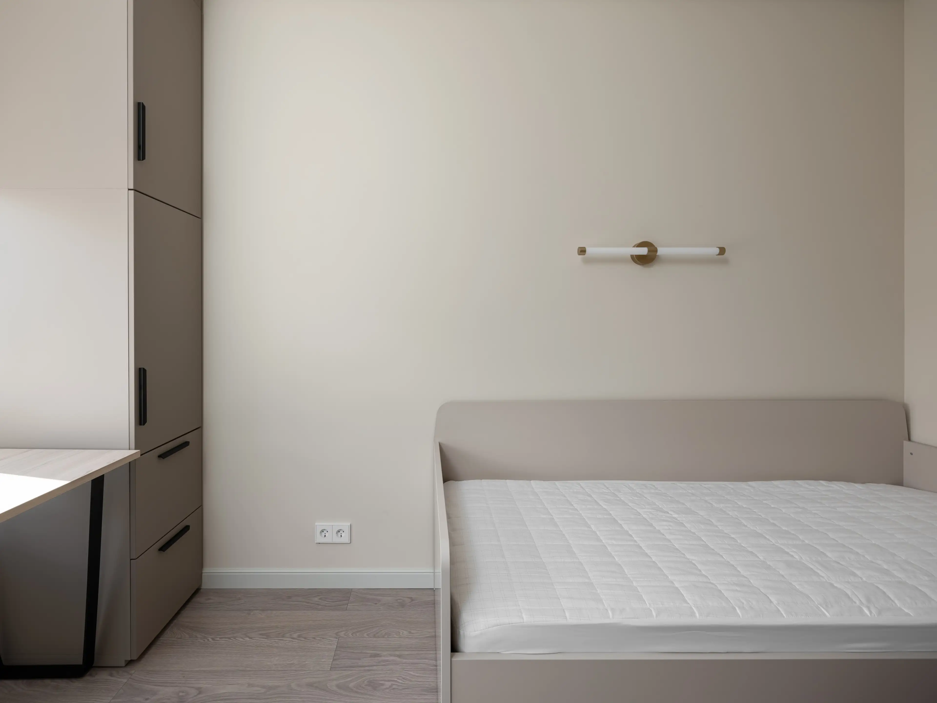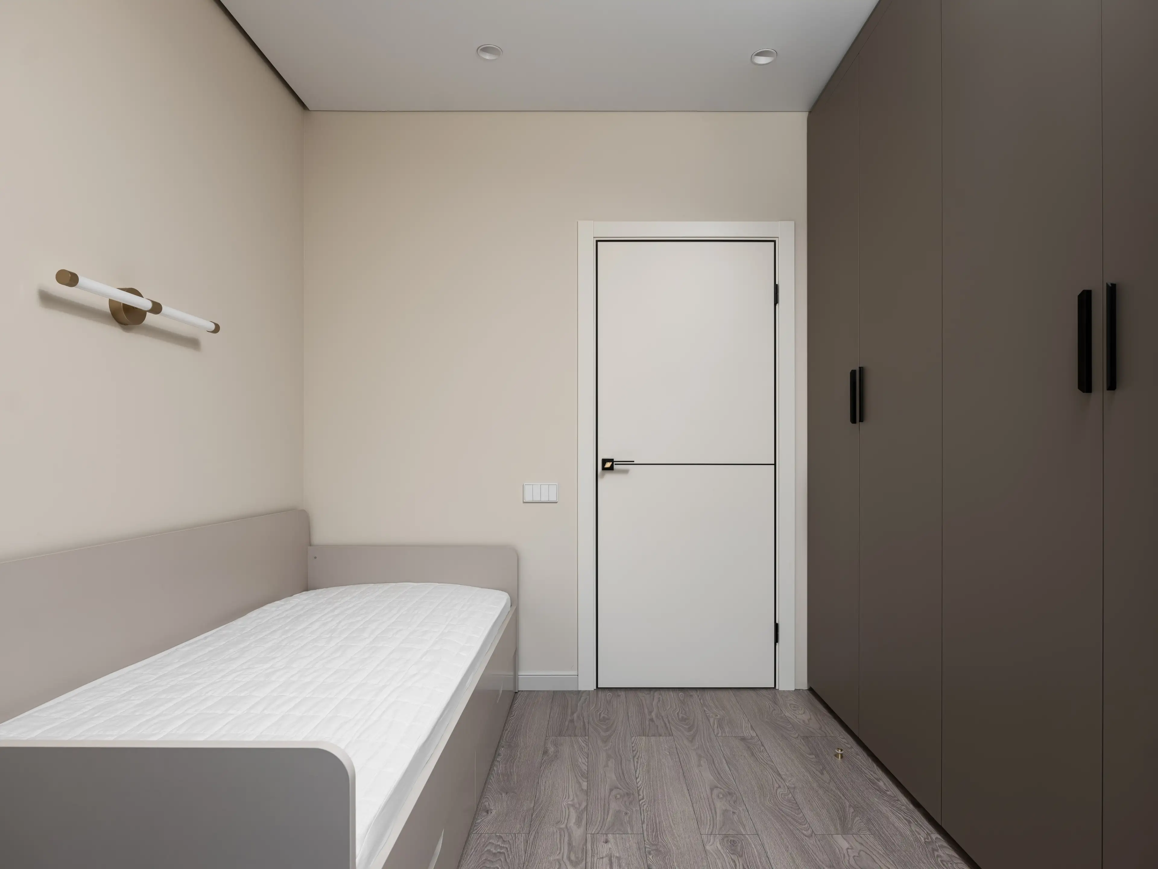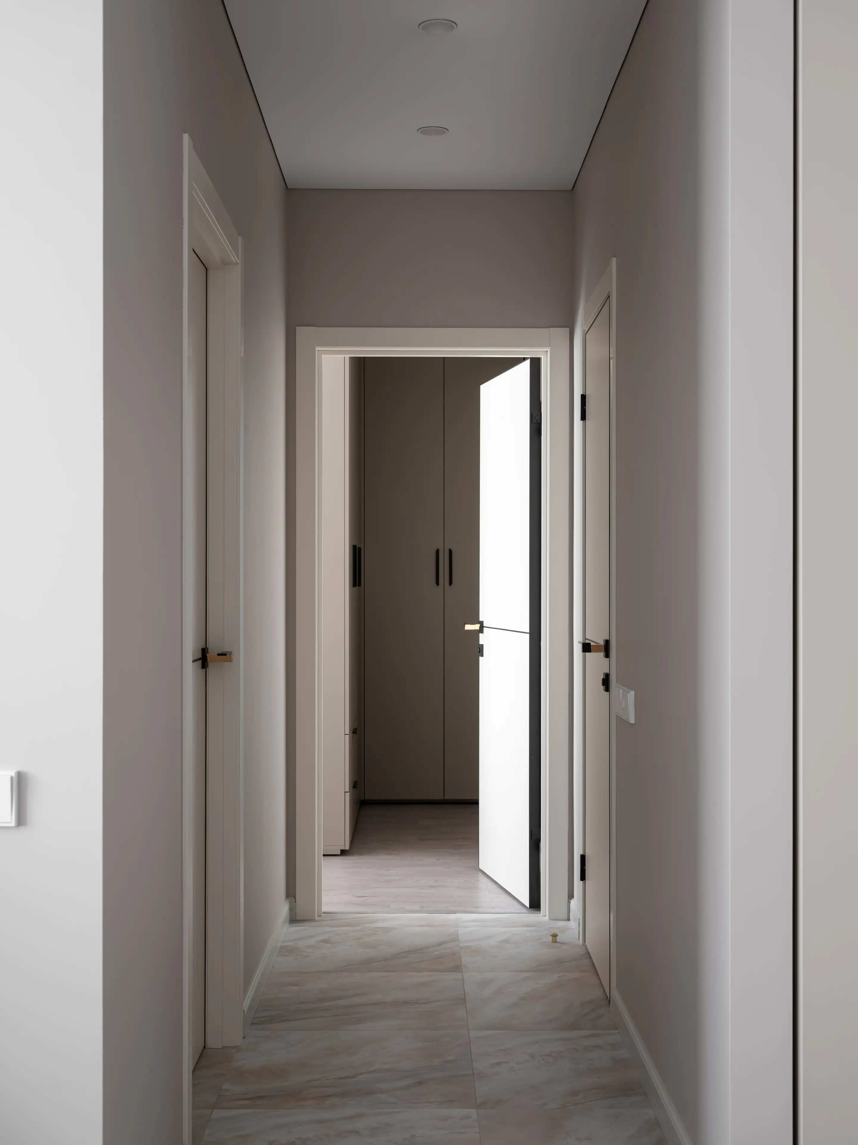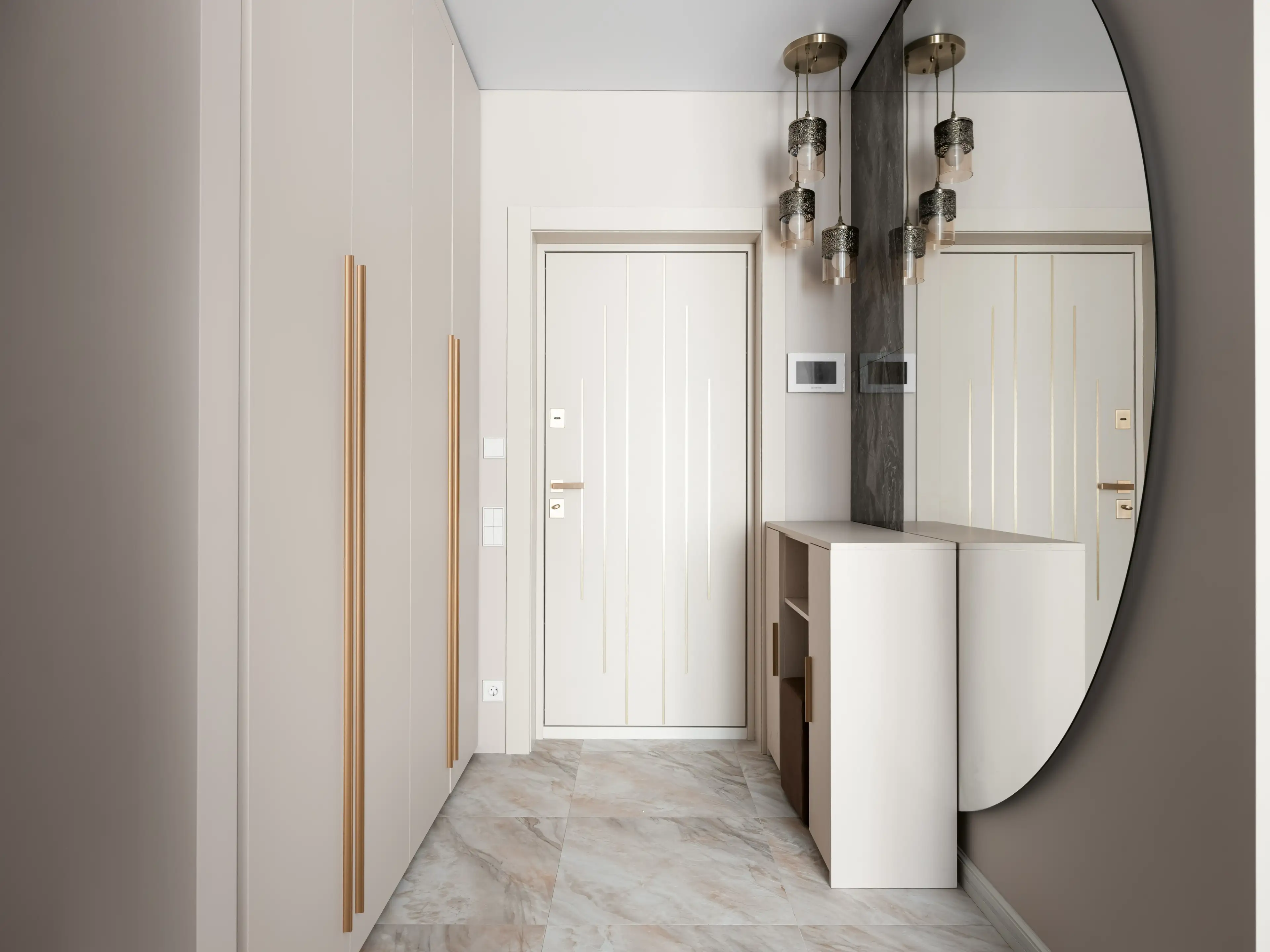 Спрятанный в нише высокий шкаф с лаконичными фасадами и с выразительными ручками из золотистого металла вмещает все необходимые вещи.