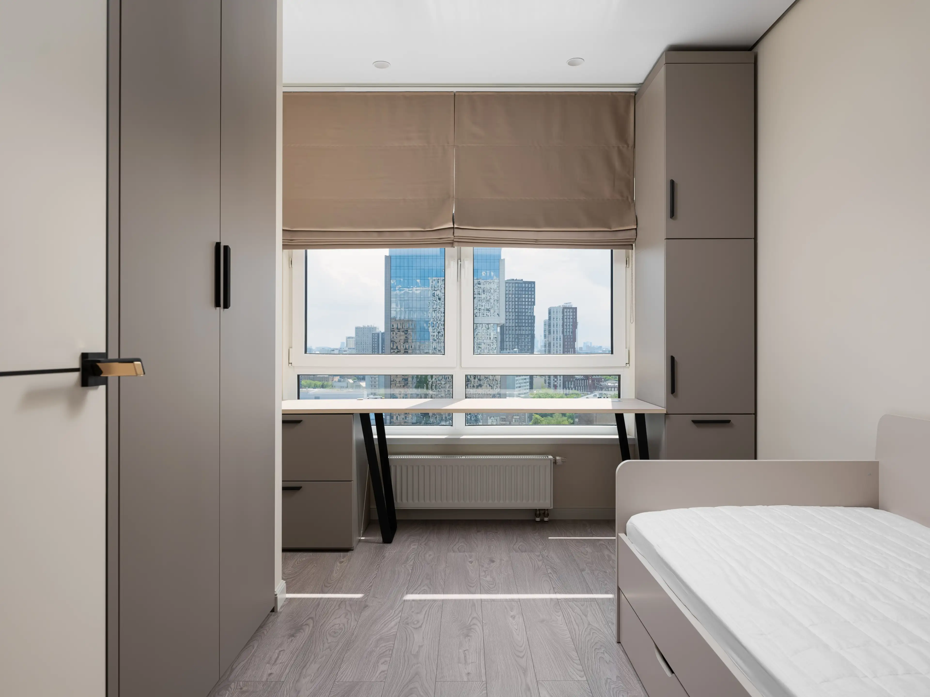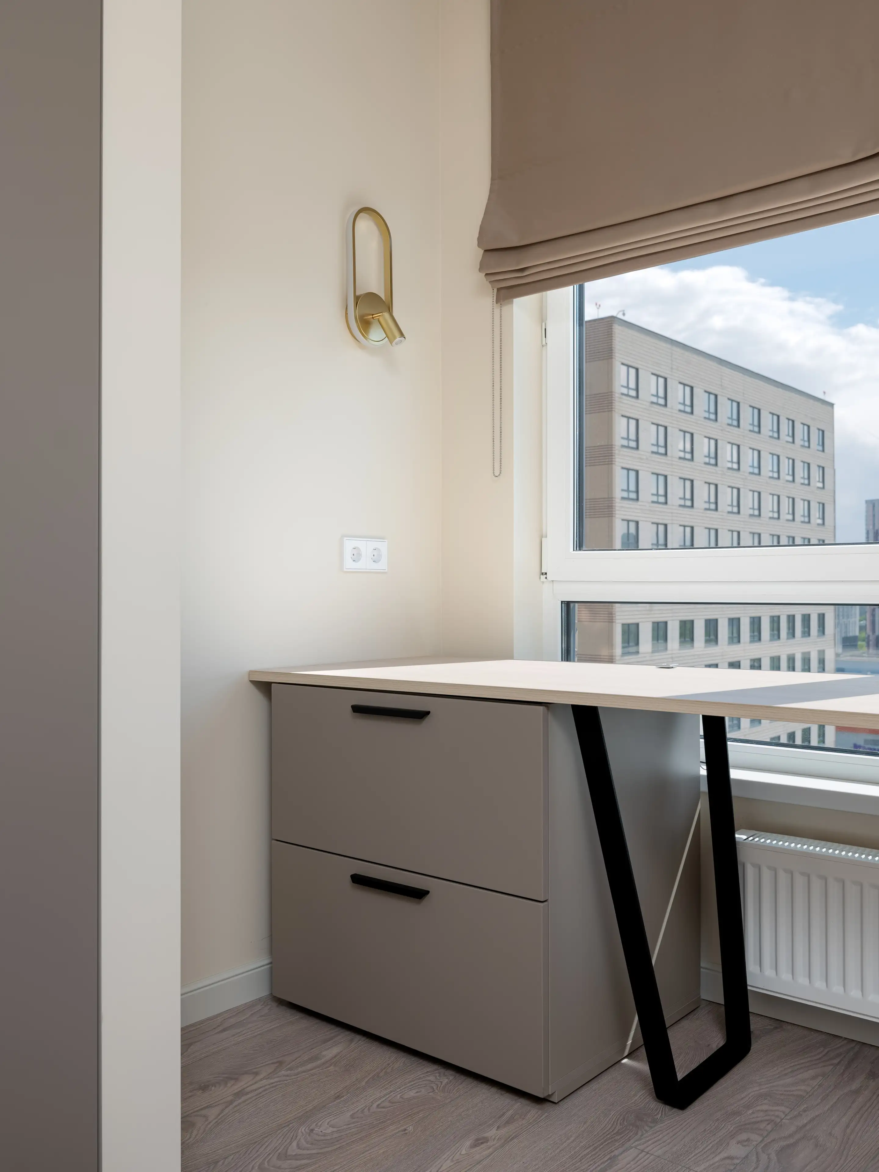 Мы расположили рабочий стол у большого окна с лаконичными римскими шторами в природных бежевых тонах. Здесь же разместили места хранения: шкафы и тумбу с ящиками.