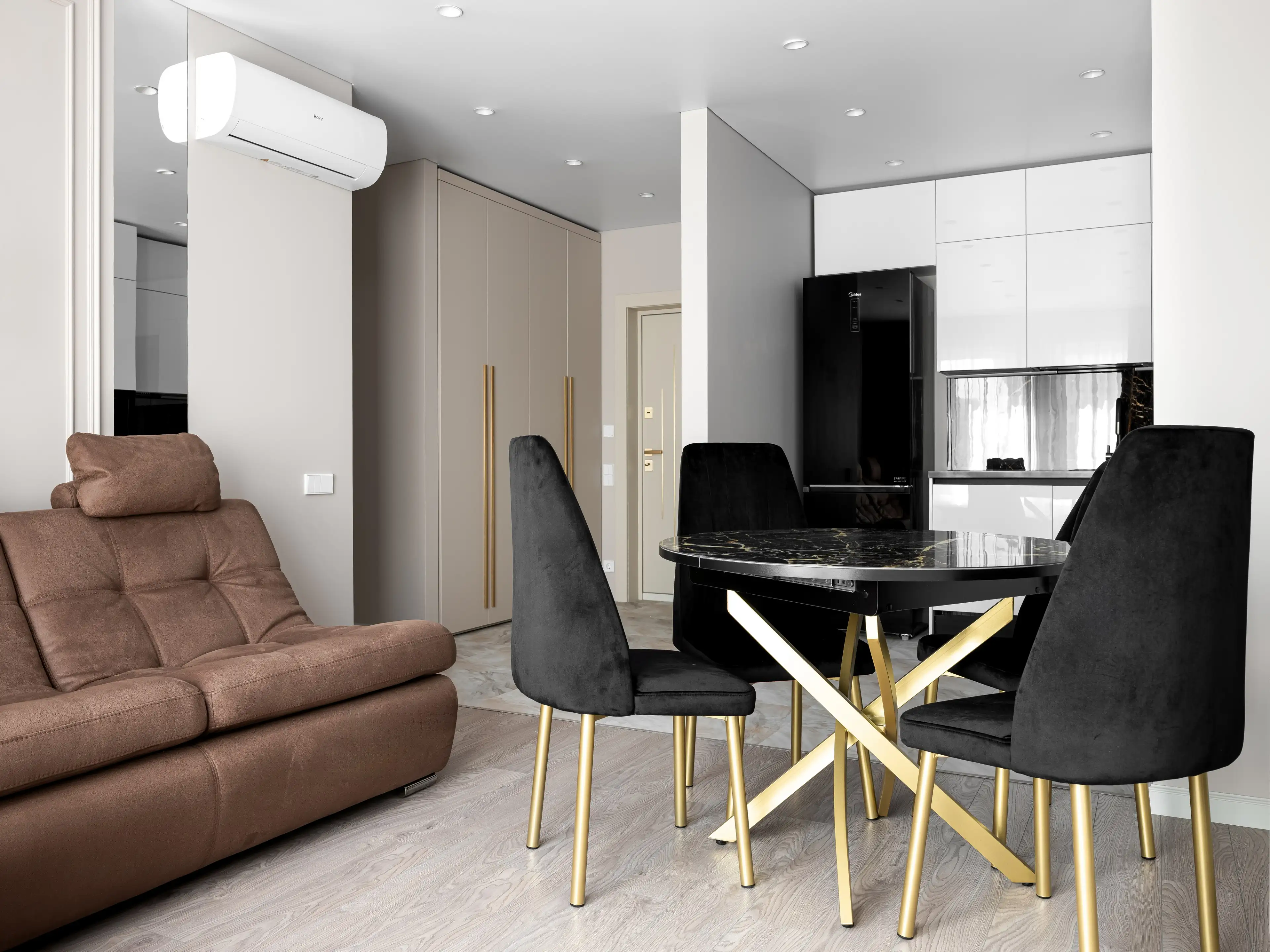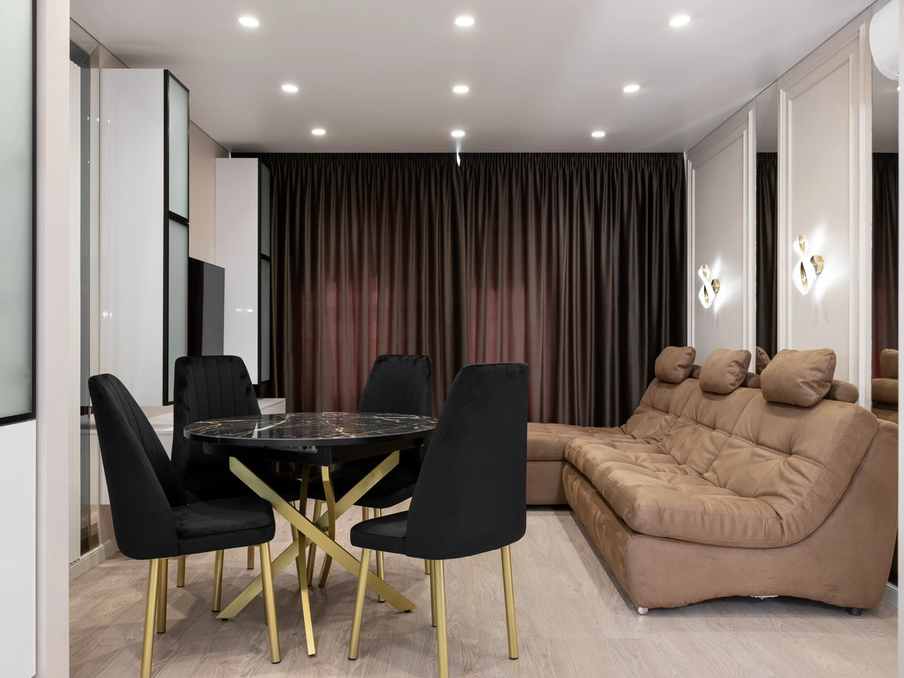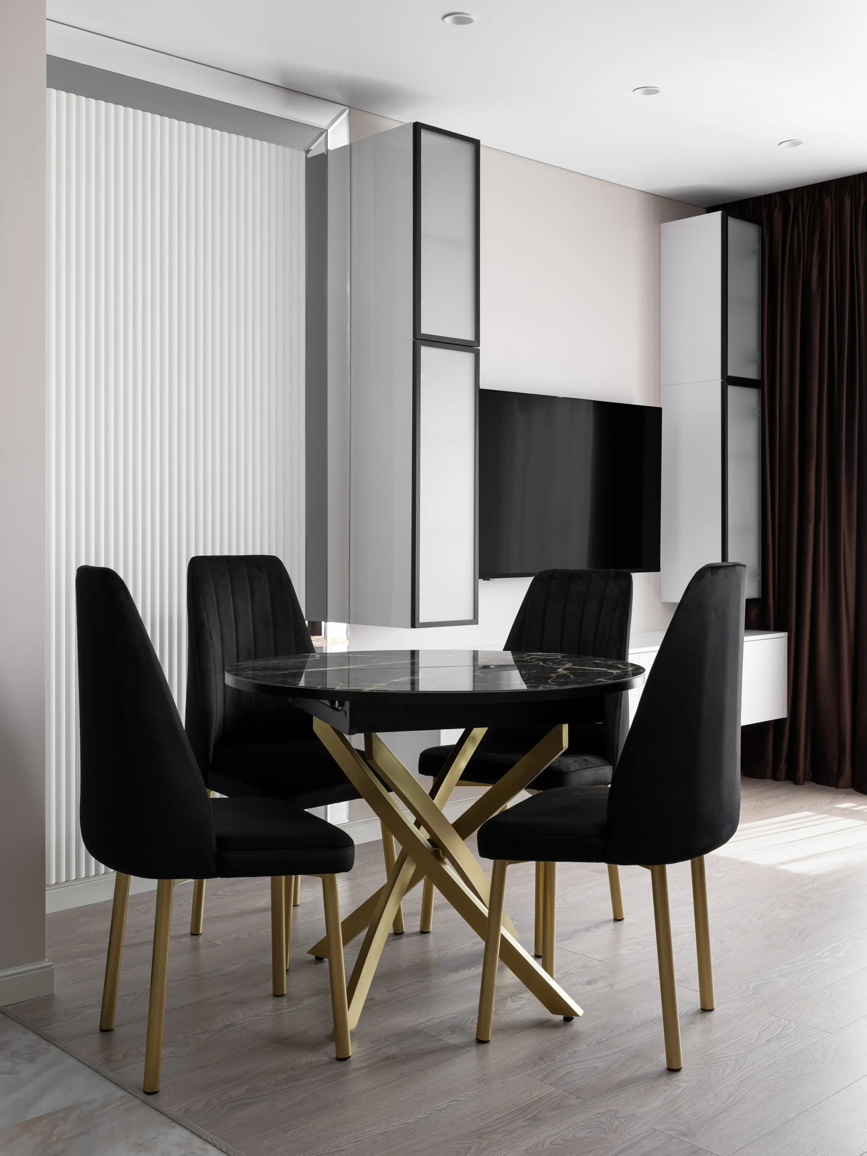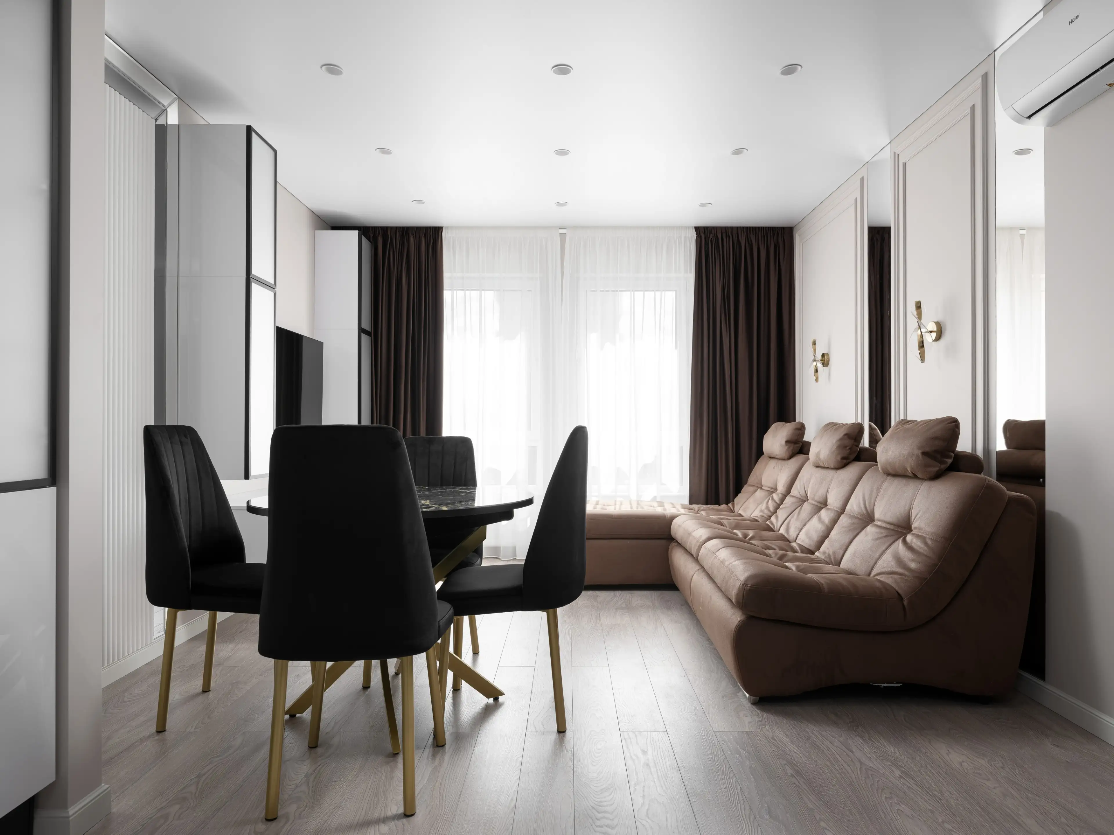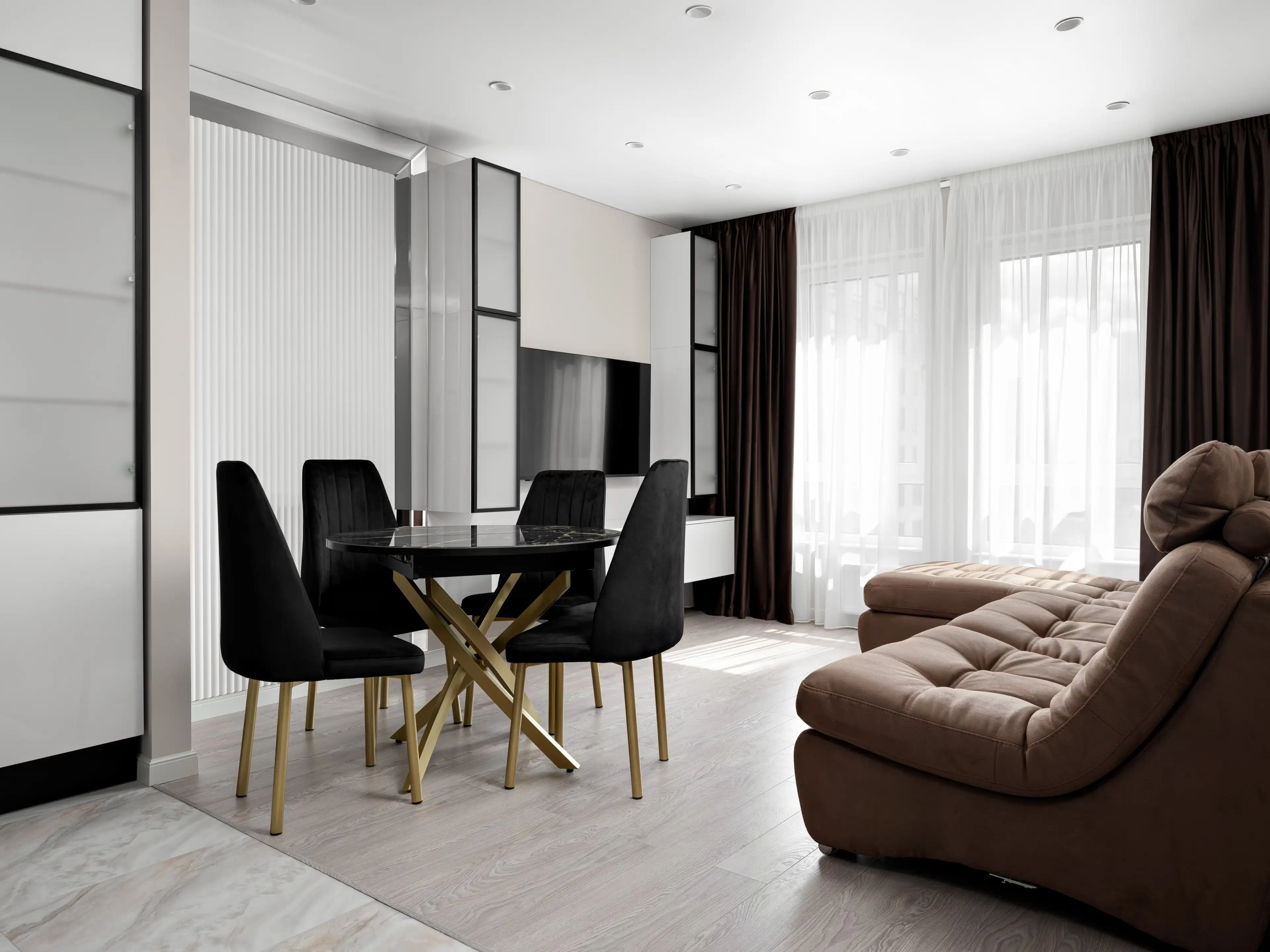 Контраст чёрных предметов мебели и тёмных штор на фоне базовой светлой отделки уравновешивает достаточно тёмный ламинат нейтрального светлого оттенка дерева.