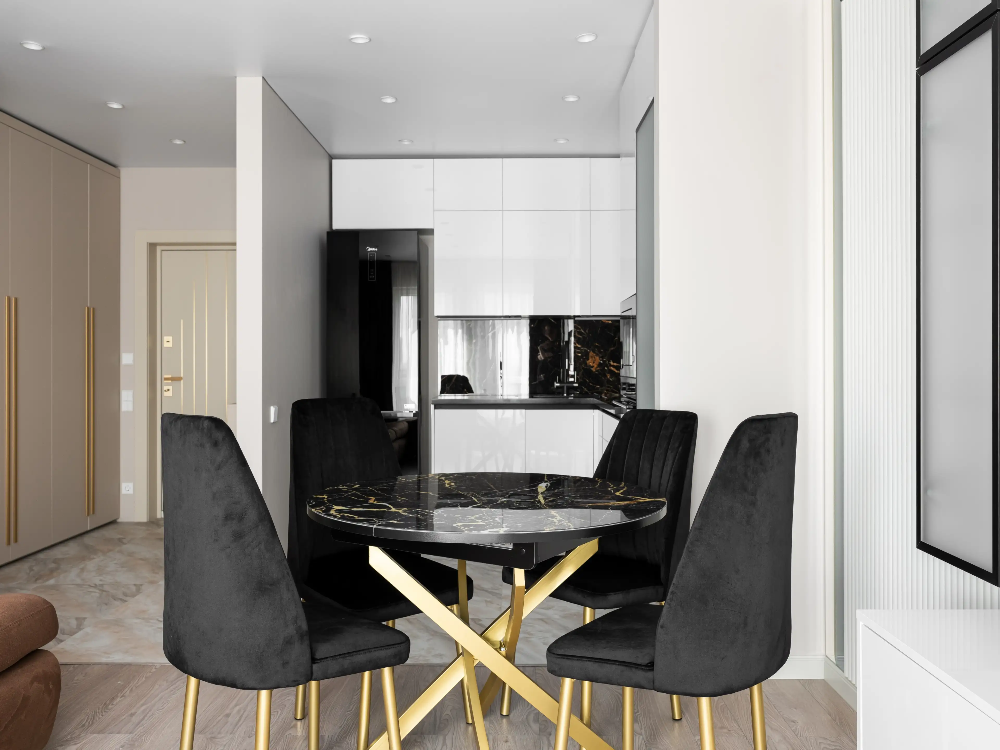Однако самодостаточная столовая группа притягивает к себе внимание за счёт контрастной чёрной обивки, позолоченных ножек кресел, подстолья и красивой текстуры камня.