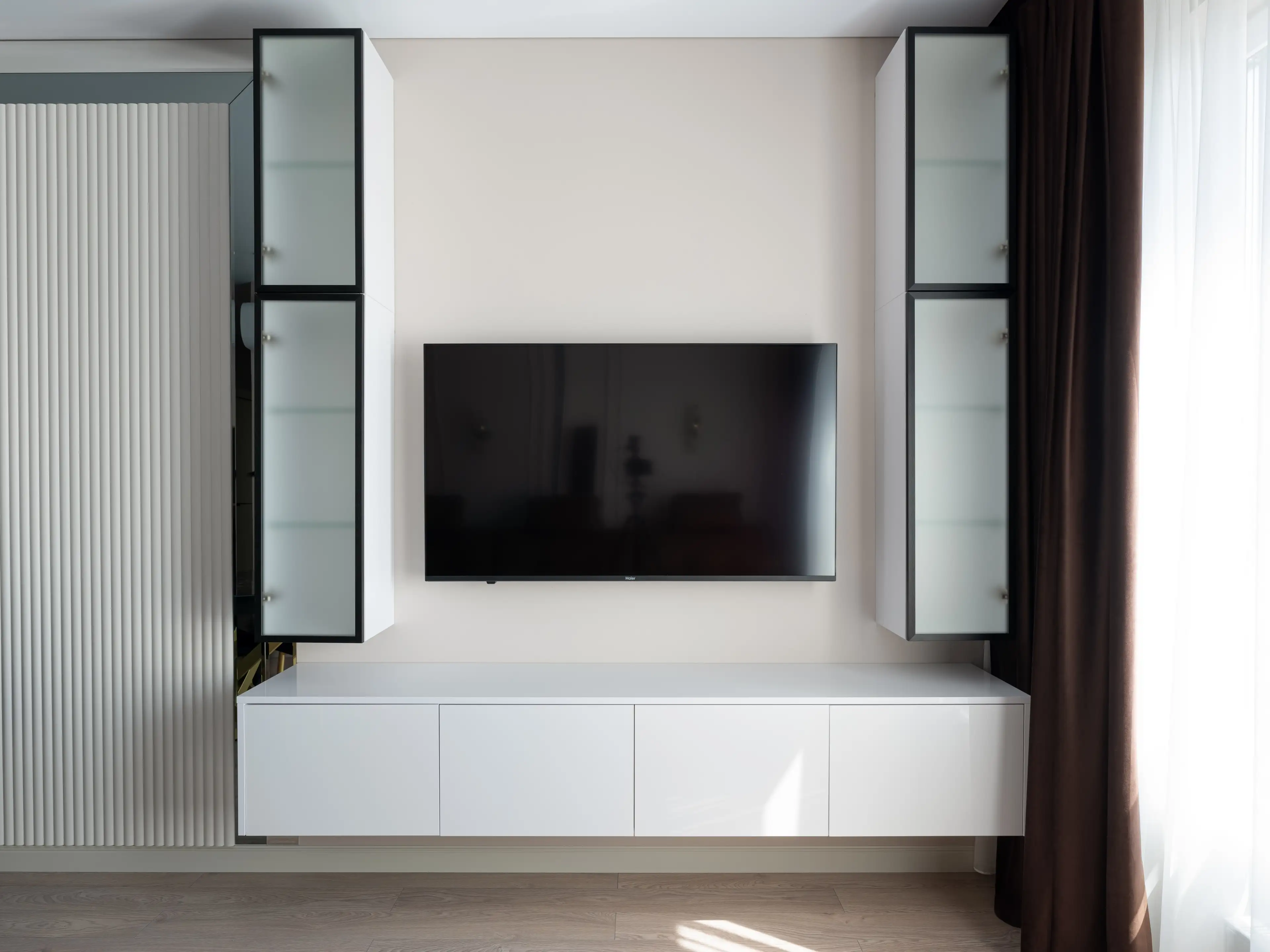 Напротив дивана дизайнеры расположили плазменную панель и лёгкую подвесную белую тумбу лаконичной формы, практически сливающуюся со светлой стеной.