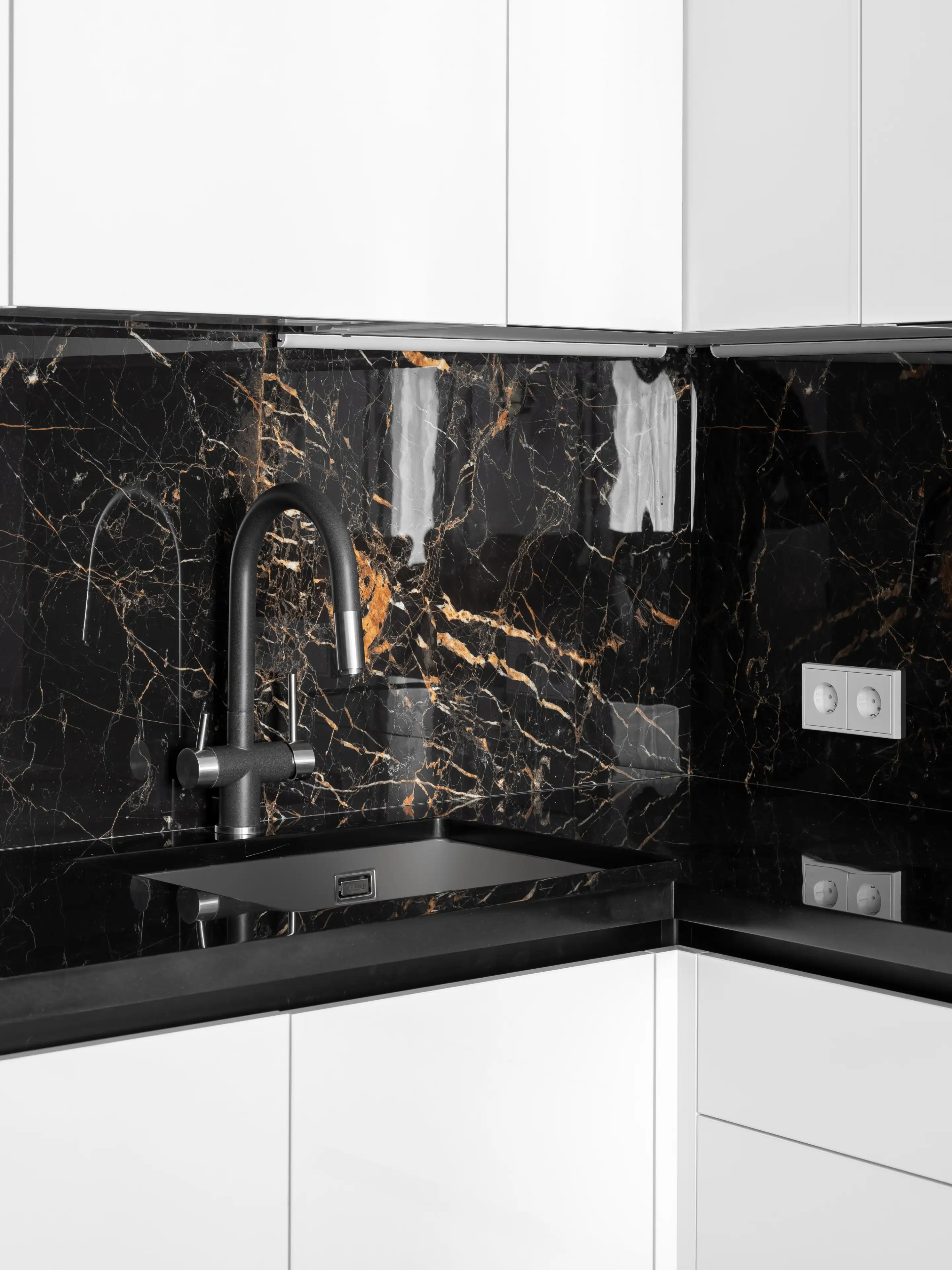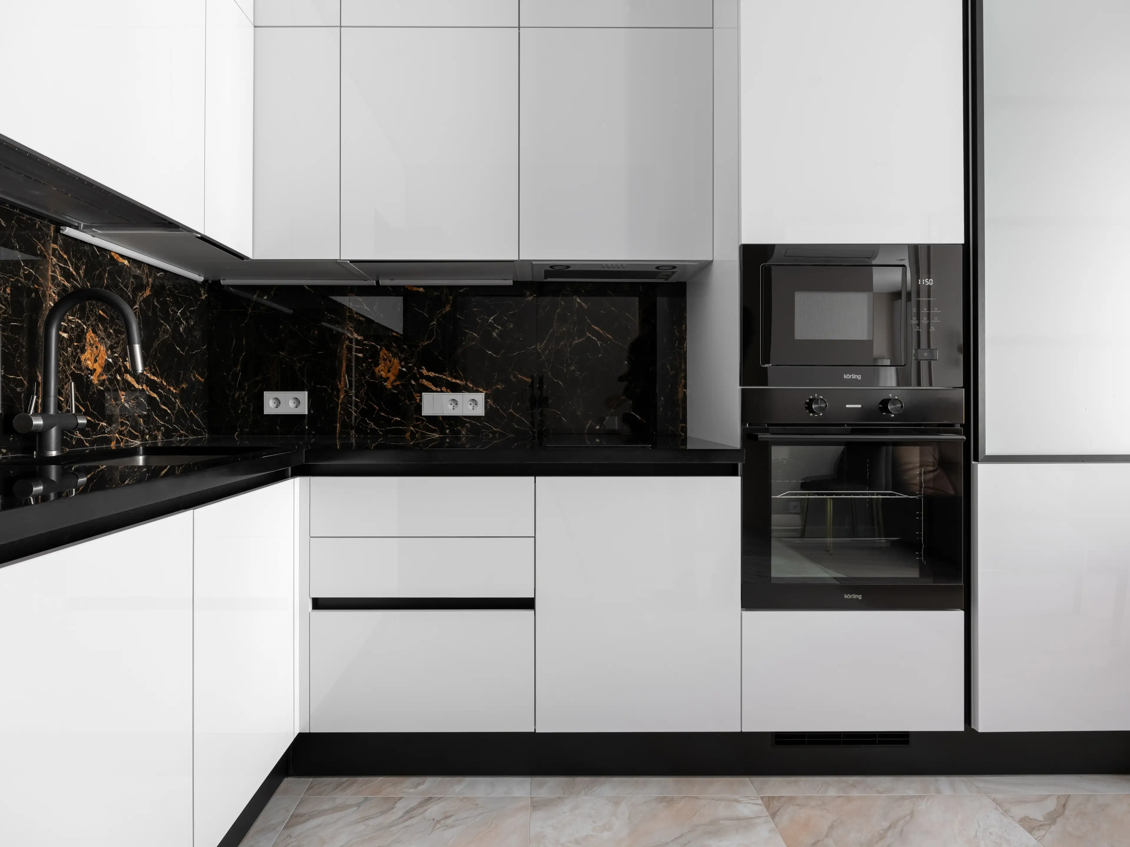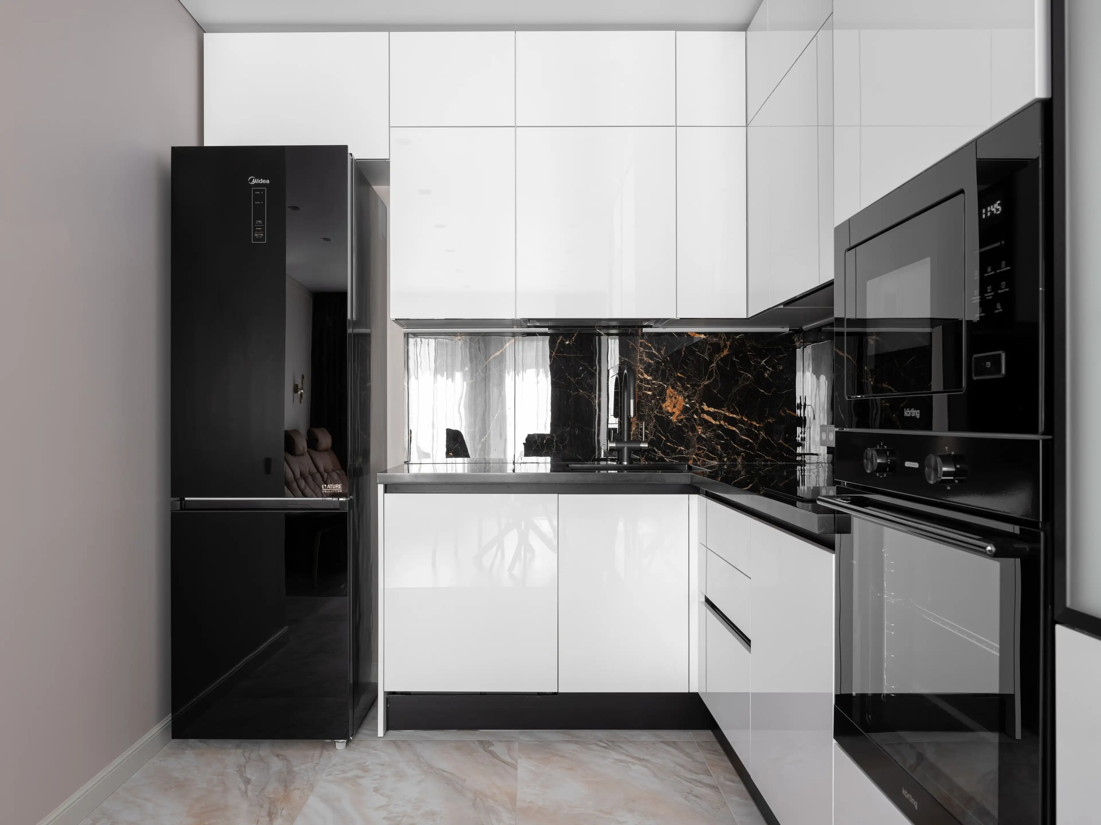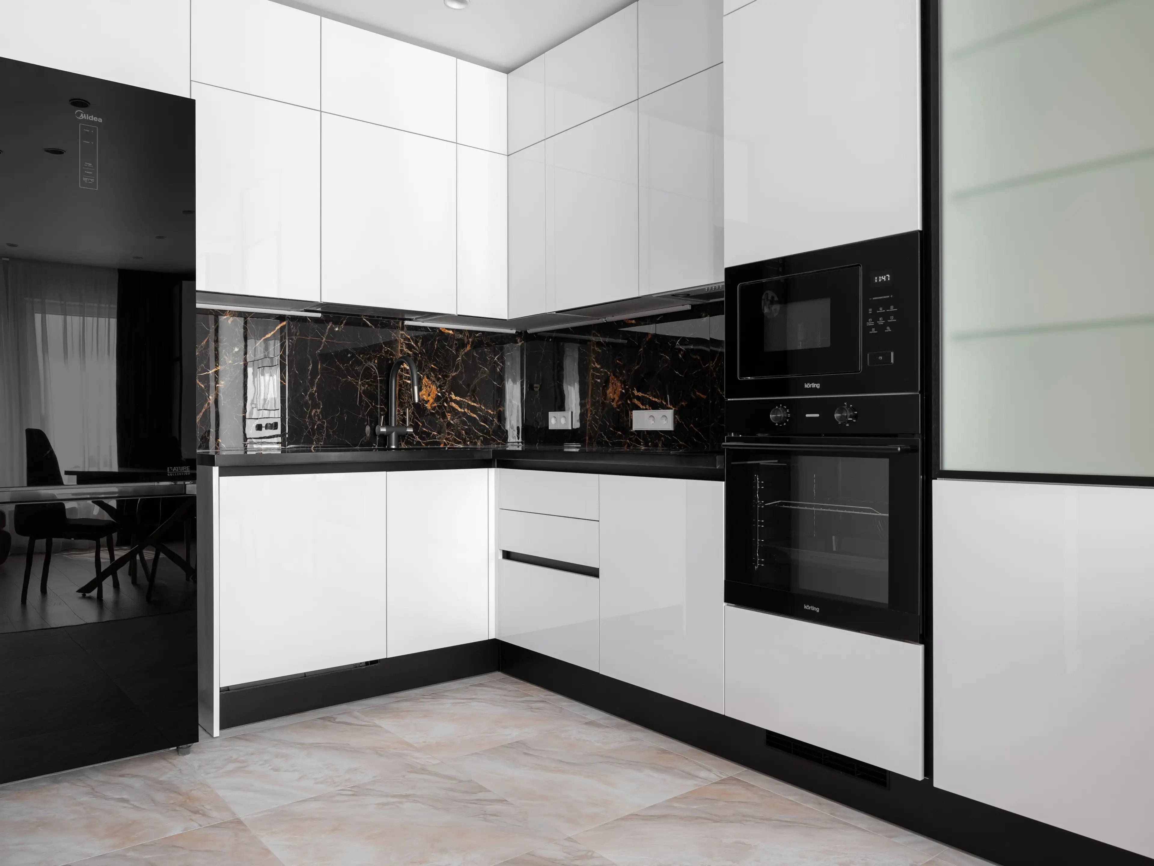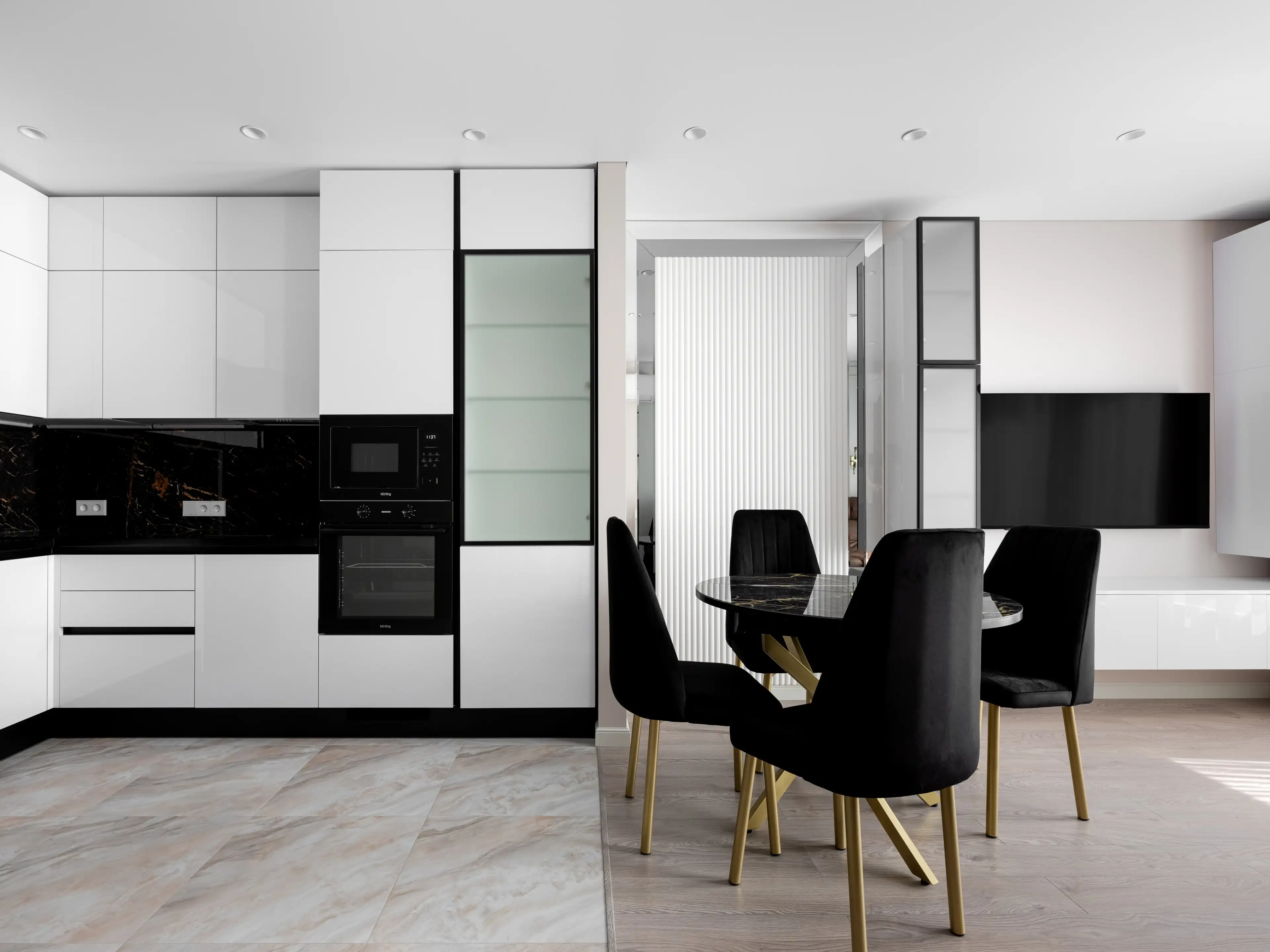 Кухонный гарнитур с белыми лаковыми фасадами и чёрной отделкой гармонично вписывается в общую концепцию интерьера кухни-гостиной, построенного на контрастах.