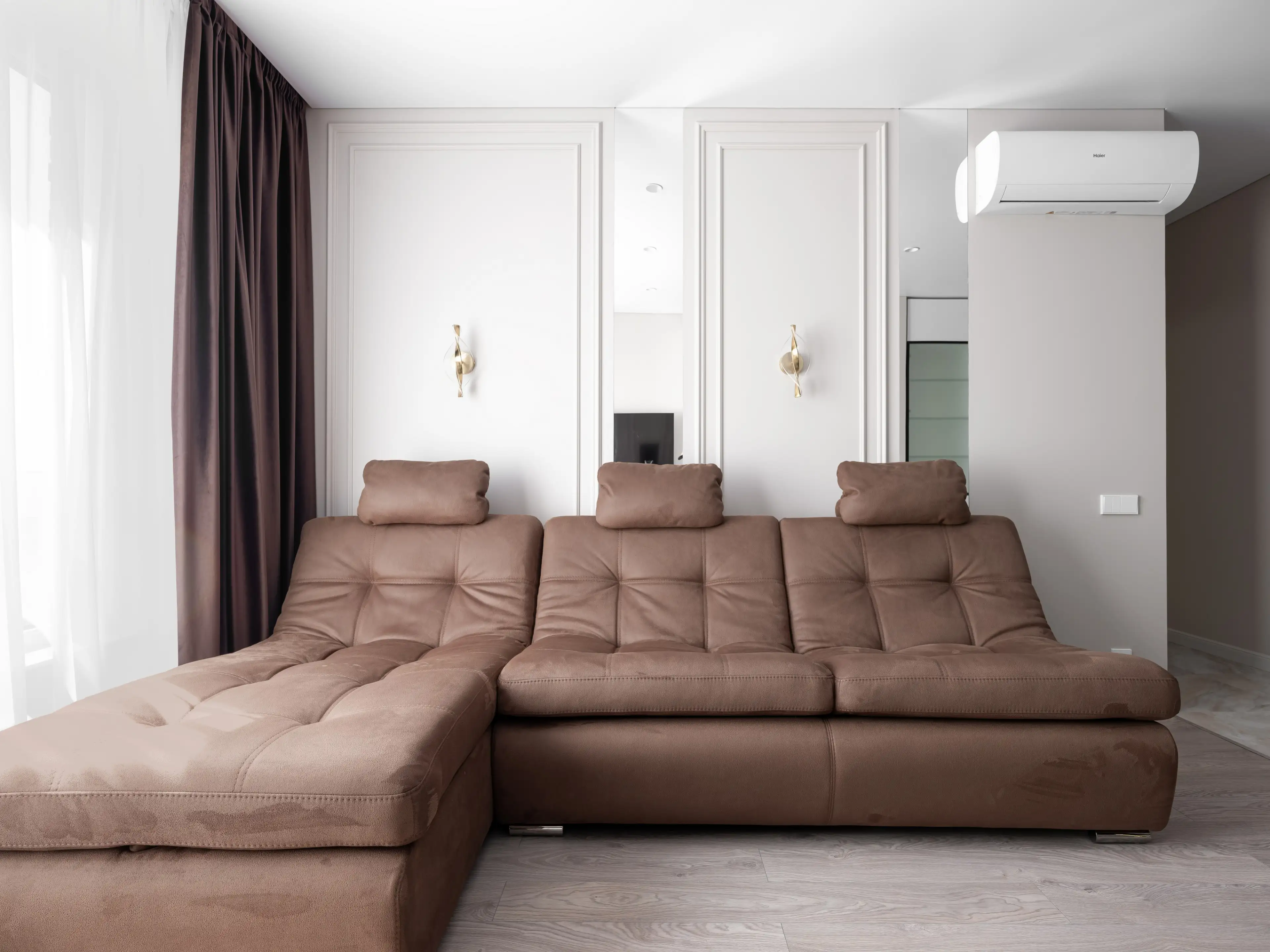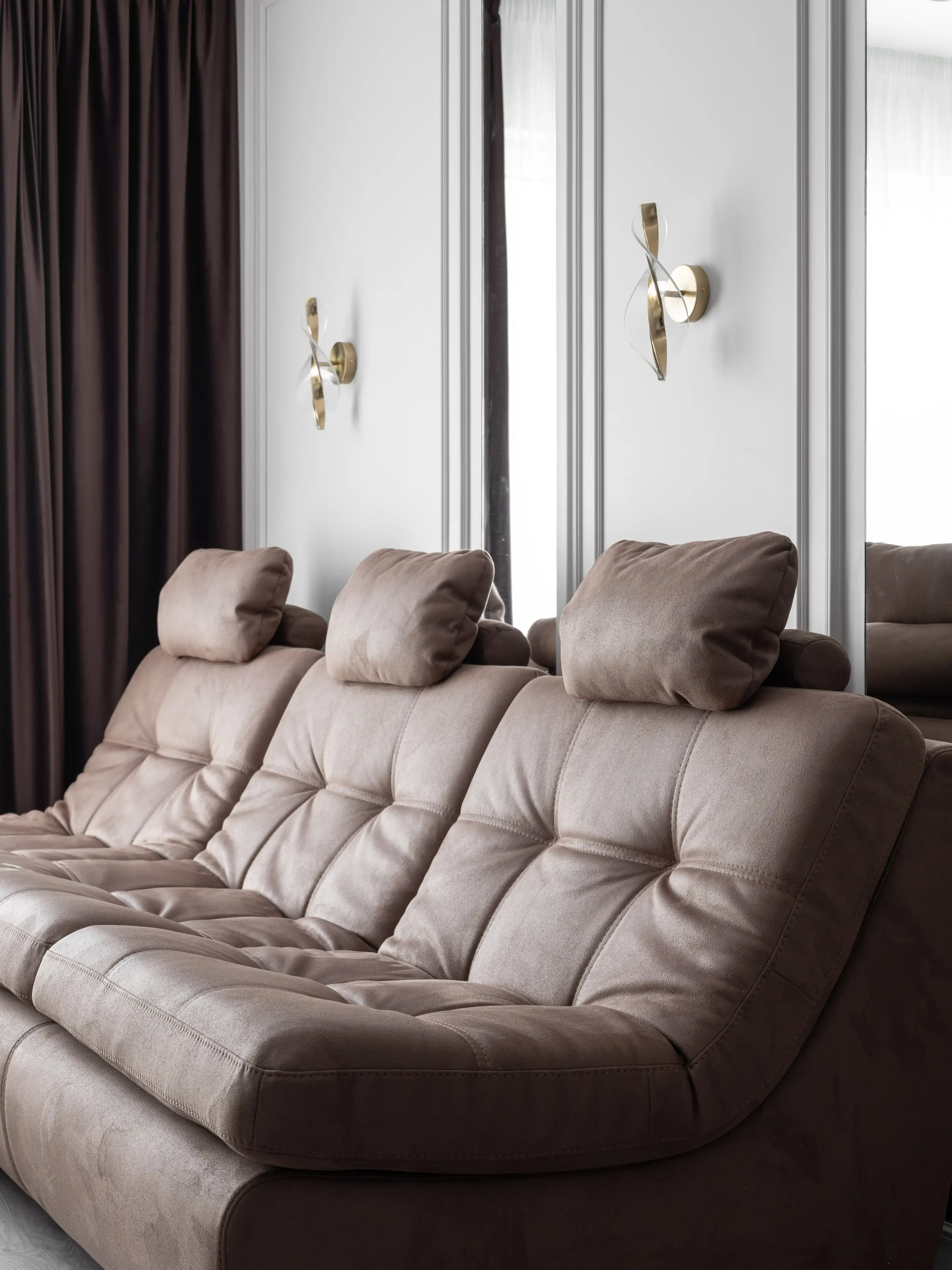 Напротив входной зоны дизайнеры расположили большой мягкий диван сложного припылённого розовато-коричневого оттенка, который служит центральным элементом зоны гостиной и буквально излучает ощущение комфорта и неги.