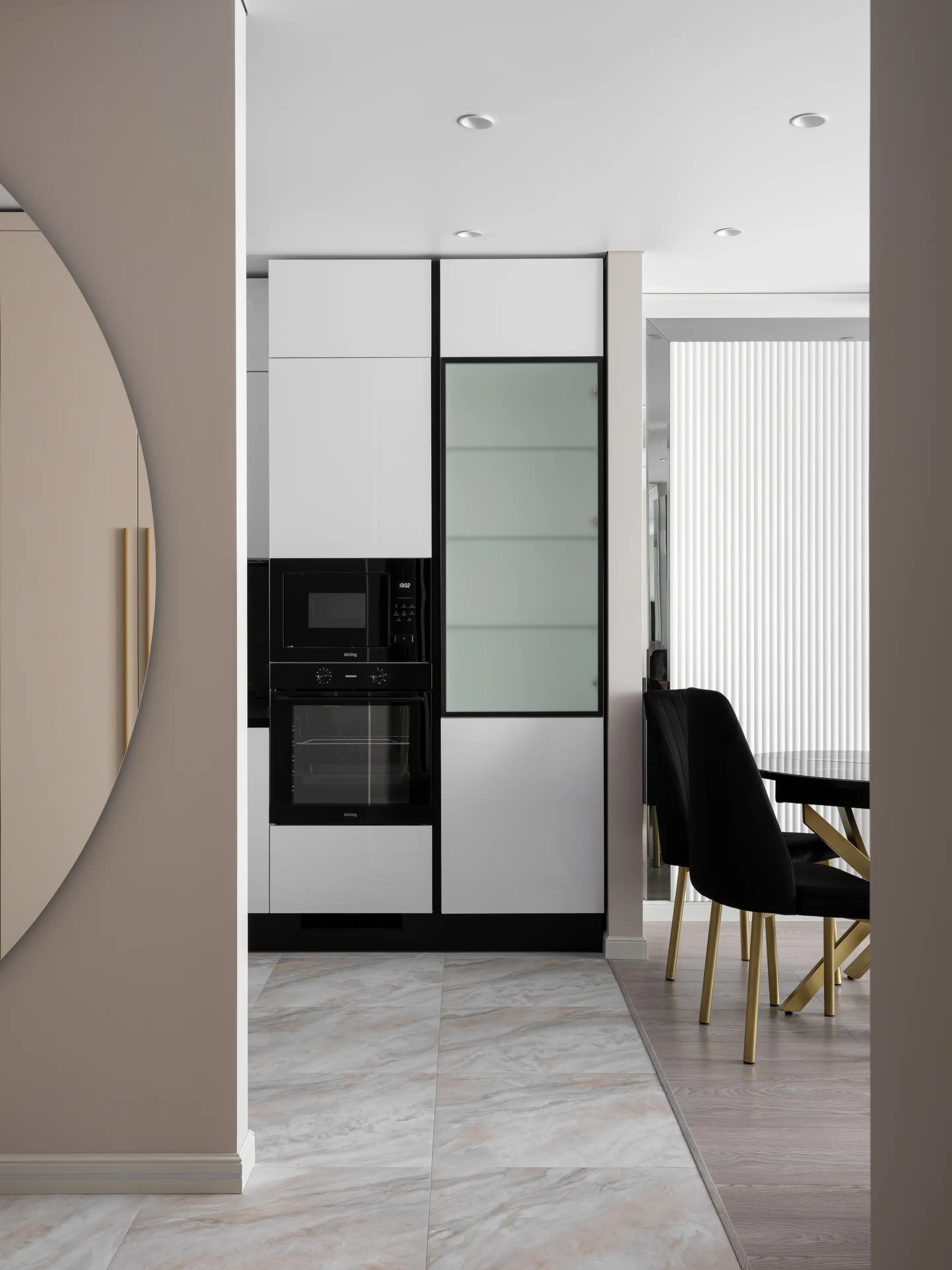 Керамогранит с текстурой под мрамор переходит из прихожей в зону кухни, базовый цвет стен также объединяет интерьер помещений в одно целое.
