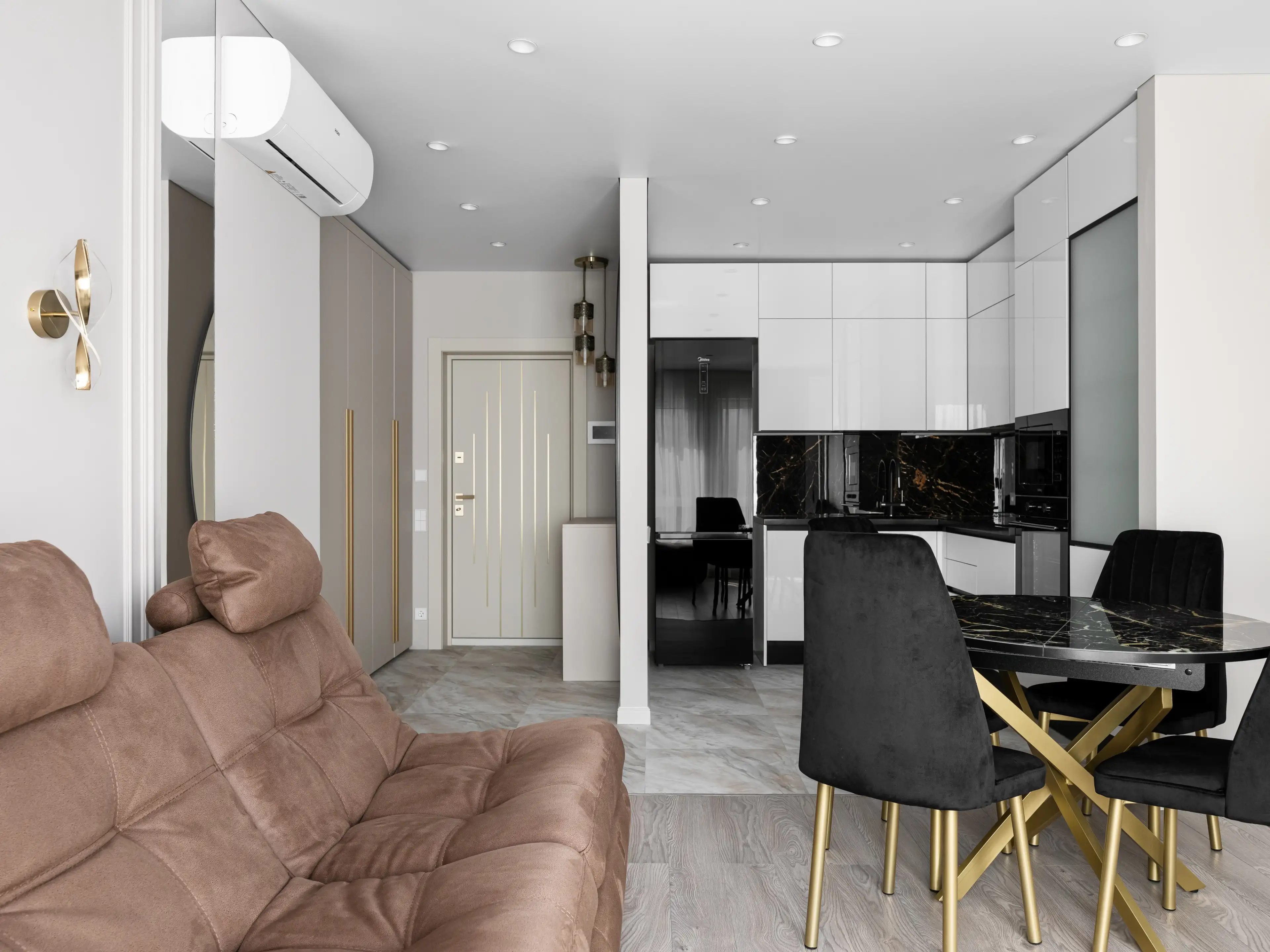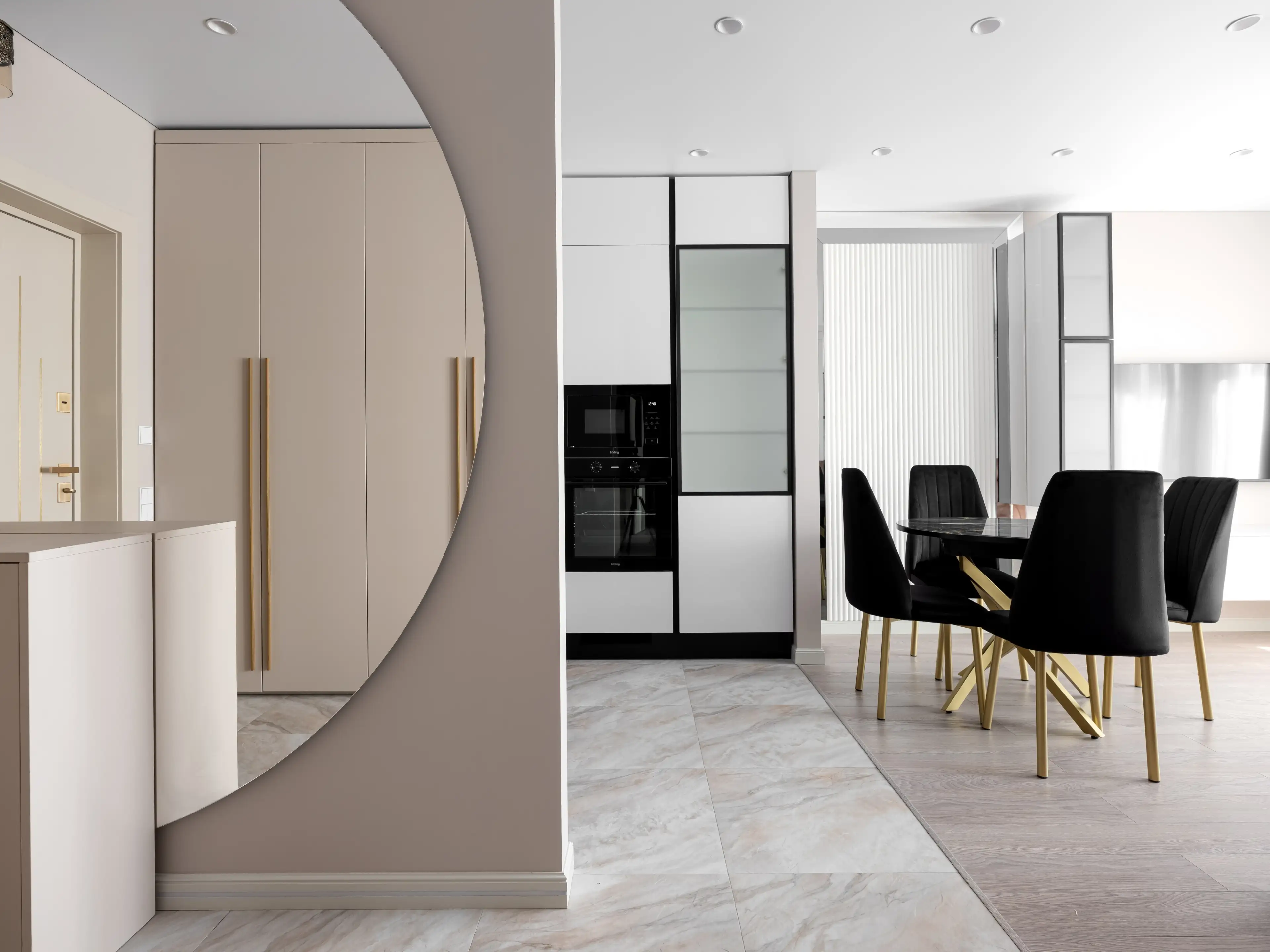 Весь интерьер квартиры выполнен в нежных белых и бежево-розовых тонах, дополнен акцентами золота и чёрного цвета, зеркалами, фактурами мрамора и дерева, отсылающими к стилистике современной классики.