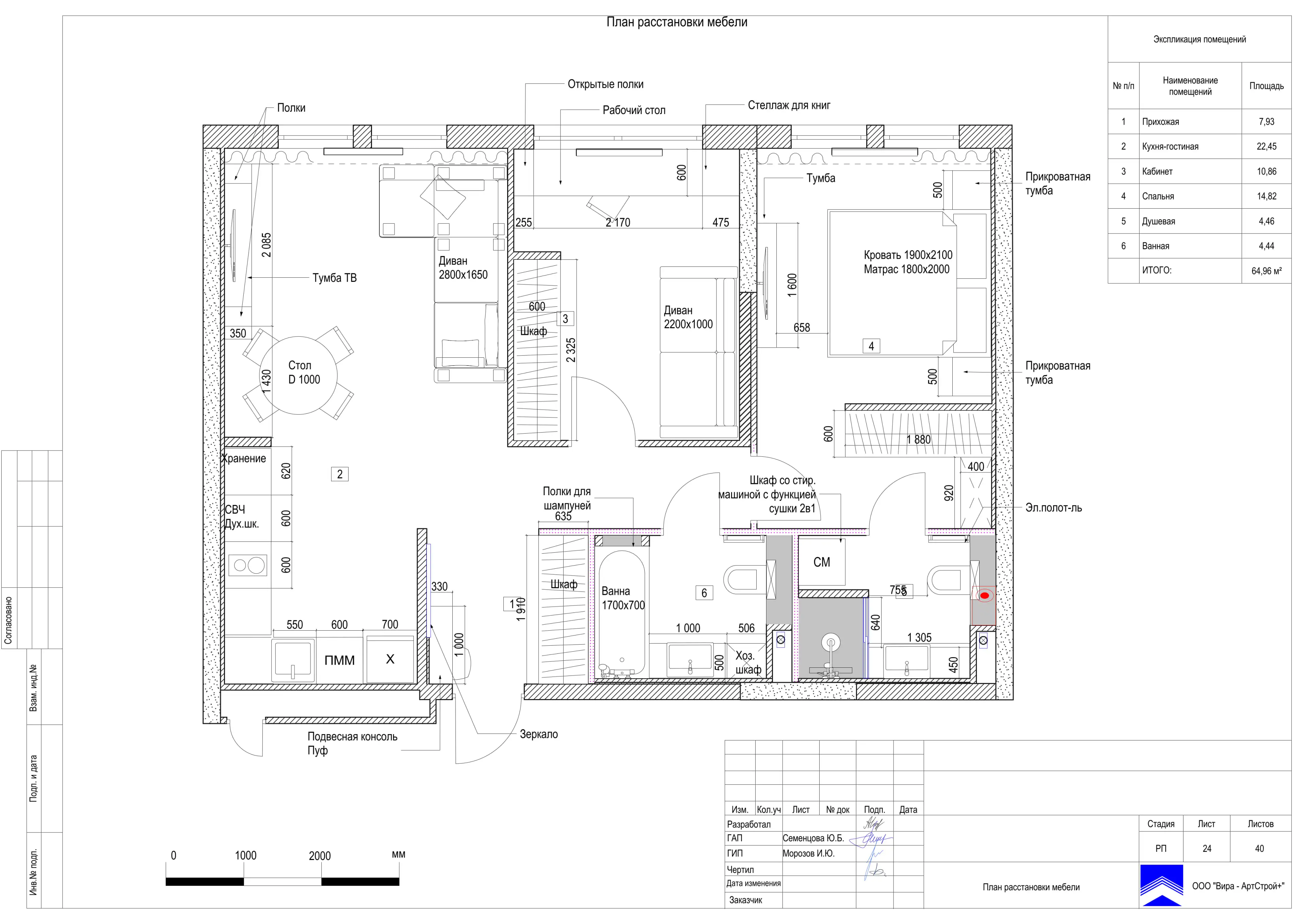 Так как стены уже были возведены застройщиком, а количество и конфигурация комнат полностью устраивала заказчика, перепланировка квартиры не потребовалась.