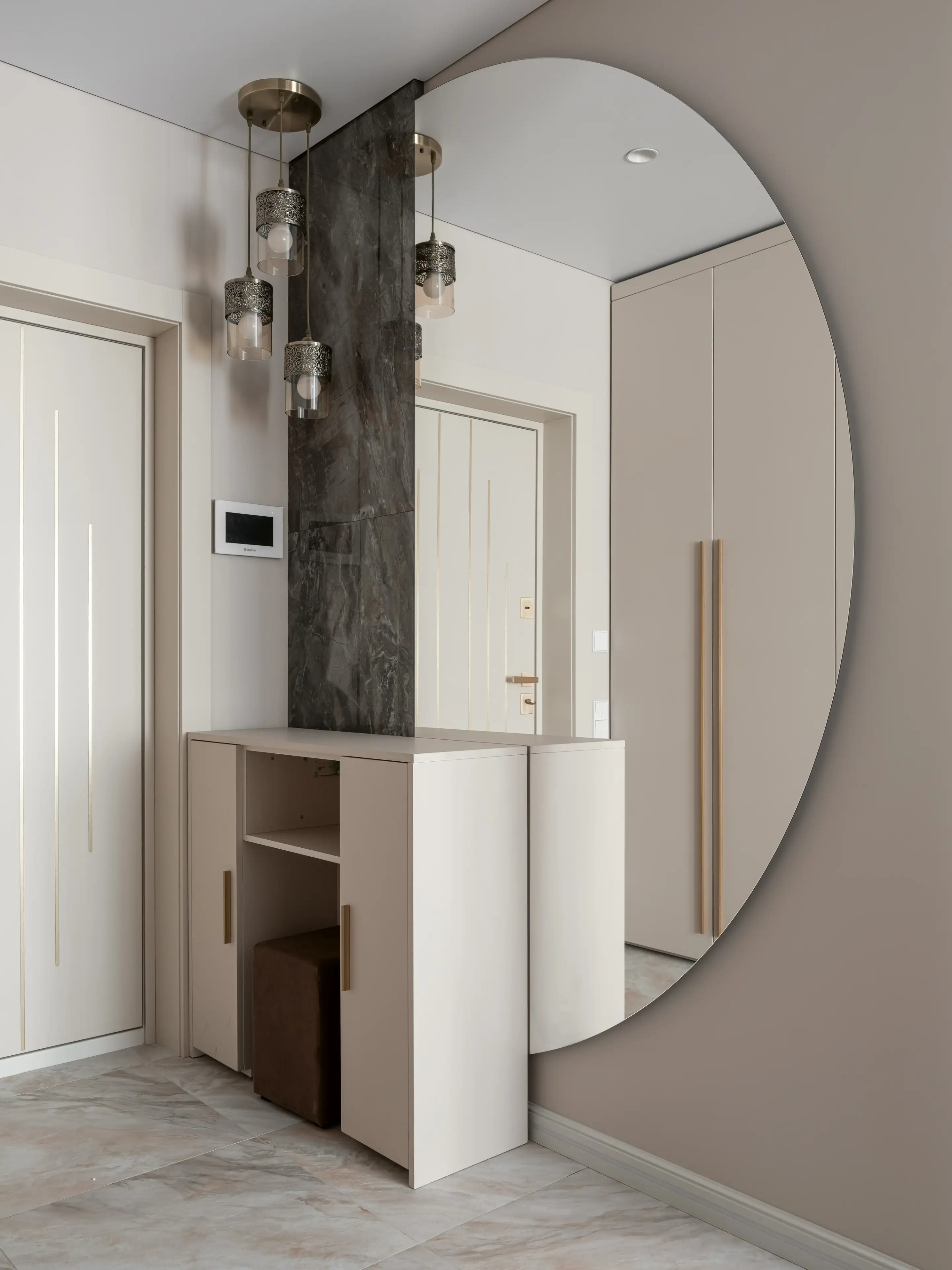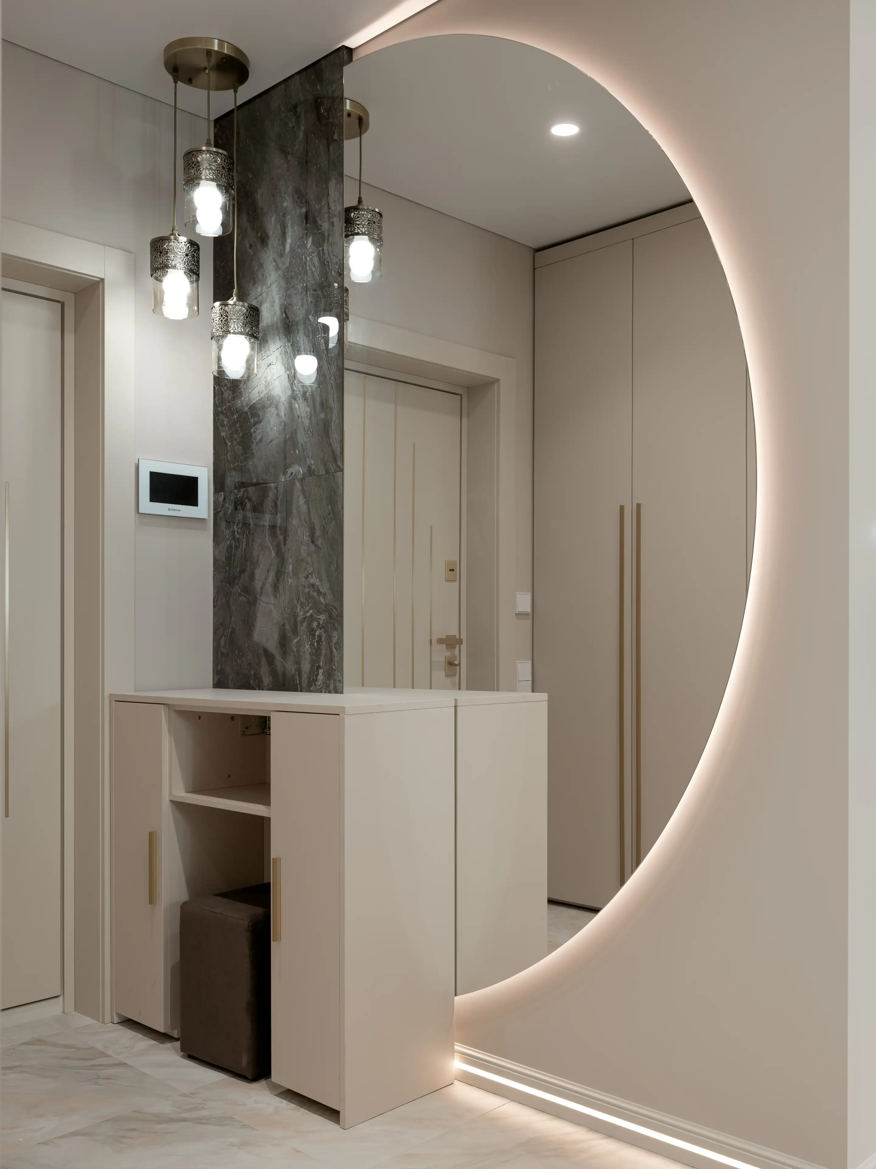 Большое полукруглое зеркало от пола до потолка, выбранное дизайнерами в качестве арт-объекта, визуально расширяет пространство, а декоративная панель из тёмно-серого мрамора служит красивым фоном для великолепного изящного длинного светильника с ажурными плафонами в классическом стиле.