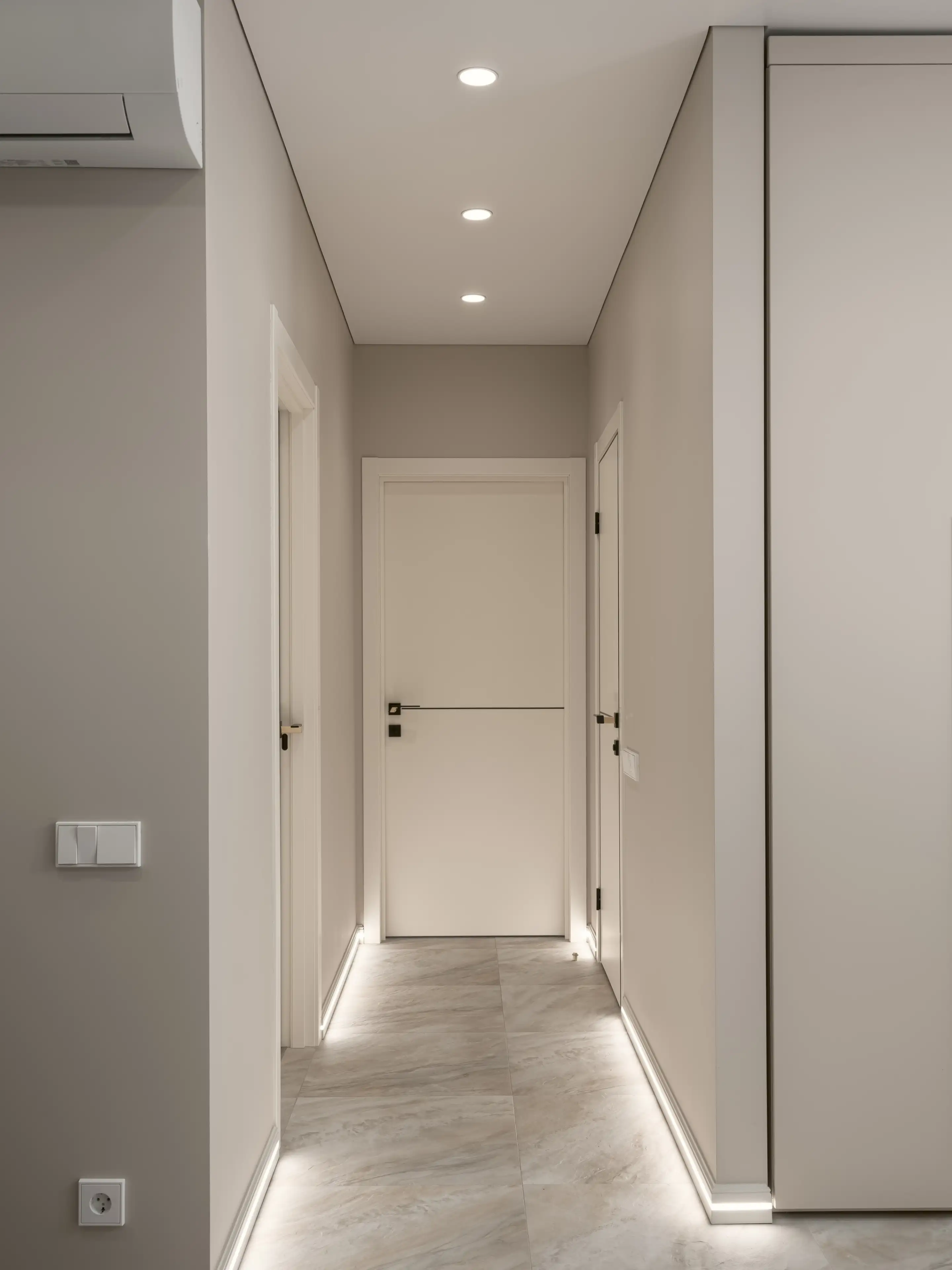 Мягкое потолочное освещение и подсветка плинтуса уже при входе создают ощущение уюта и умиротворения.