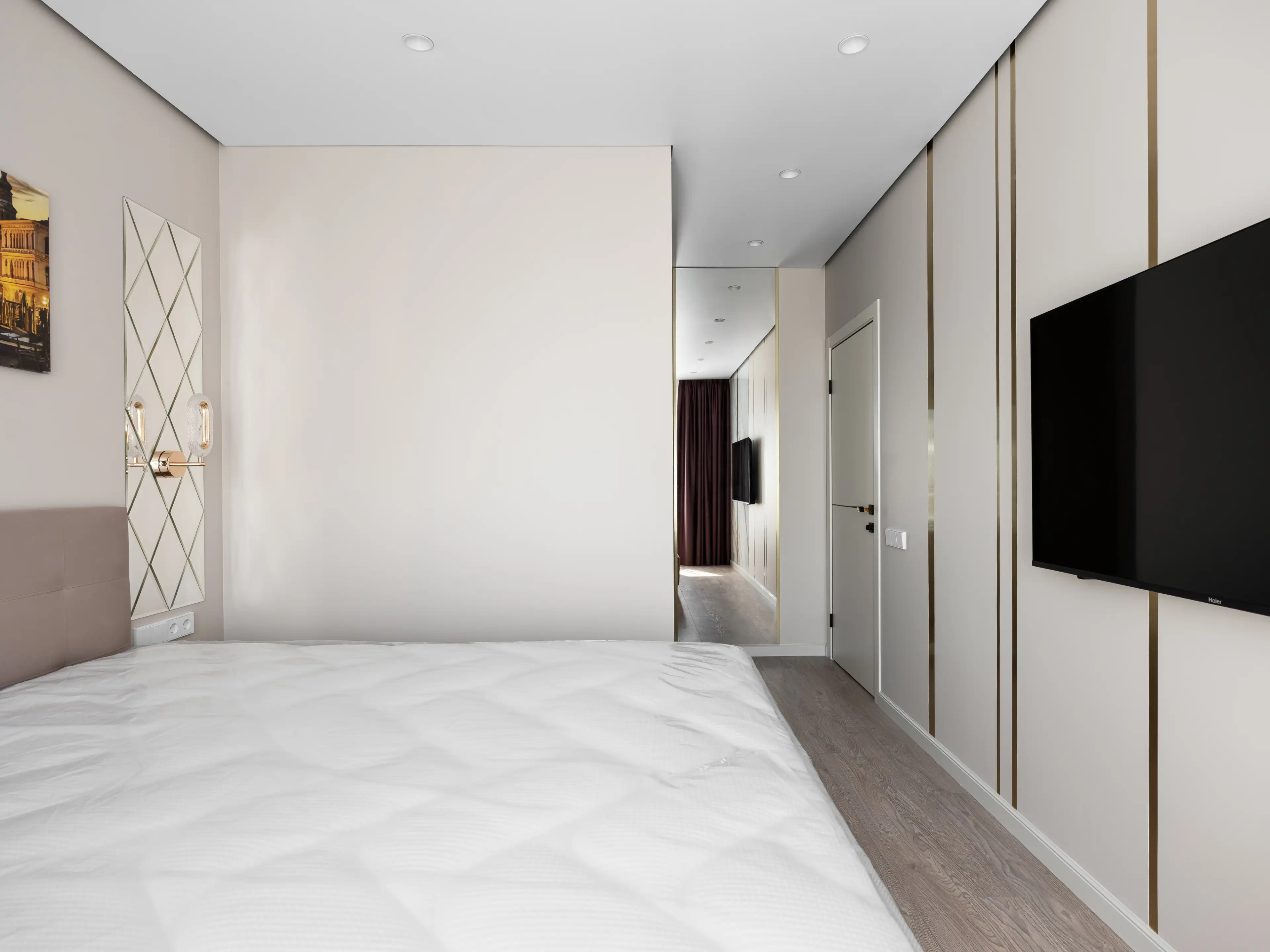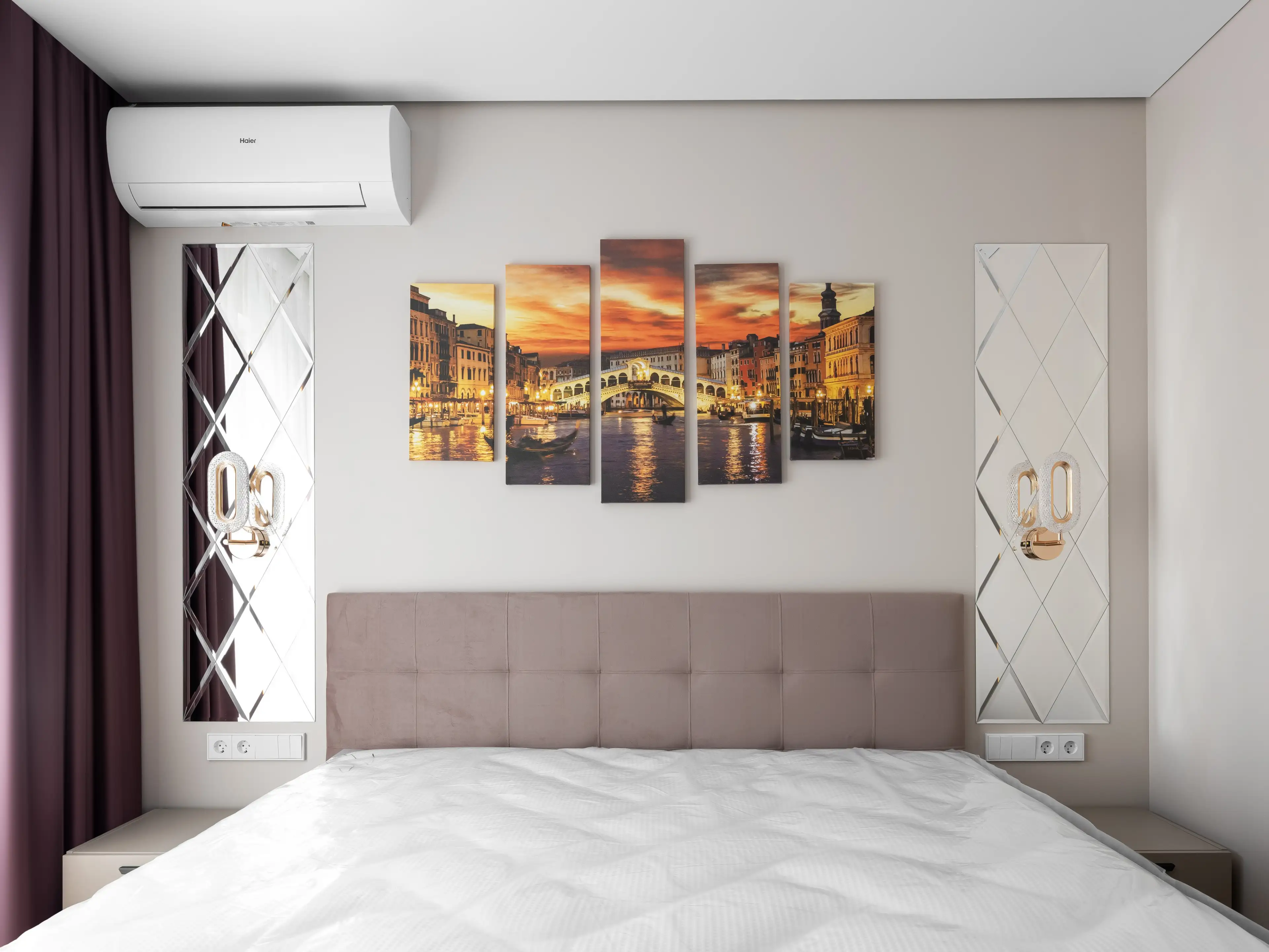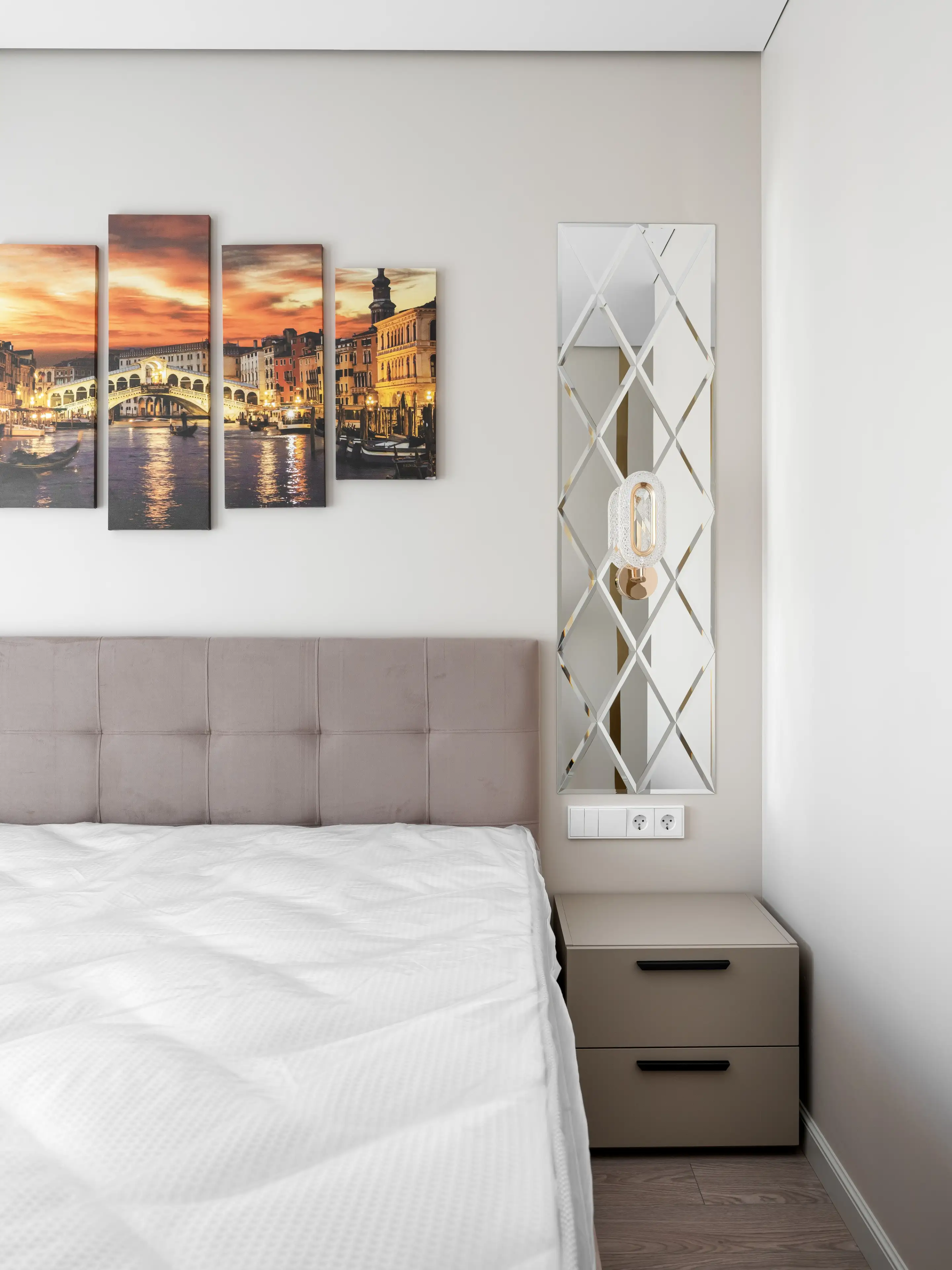 А пока рассмотрим оформление стены в изголовье: модульная картина с городским пейзажем — дань урбанизму и новому времени, а зеркала с рельефным рисунком и бра с фурнитурой из латуни — яркие элементы современной классической стилистики.