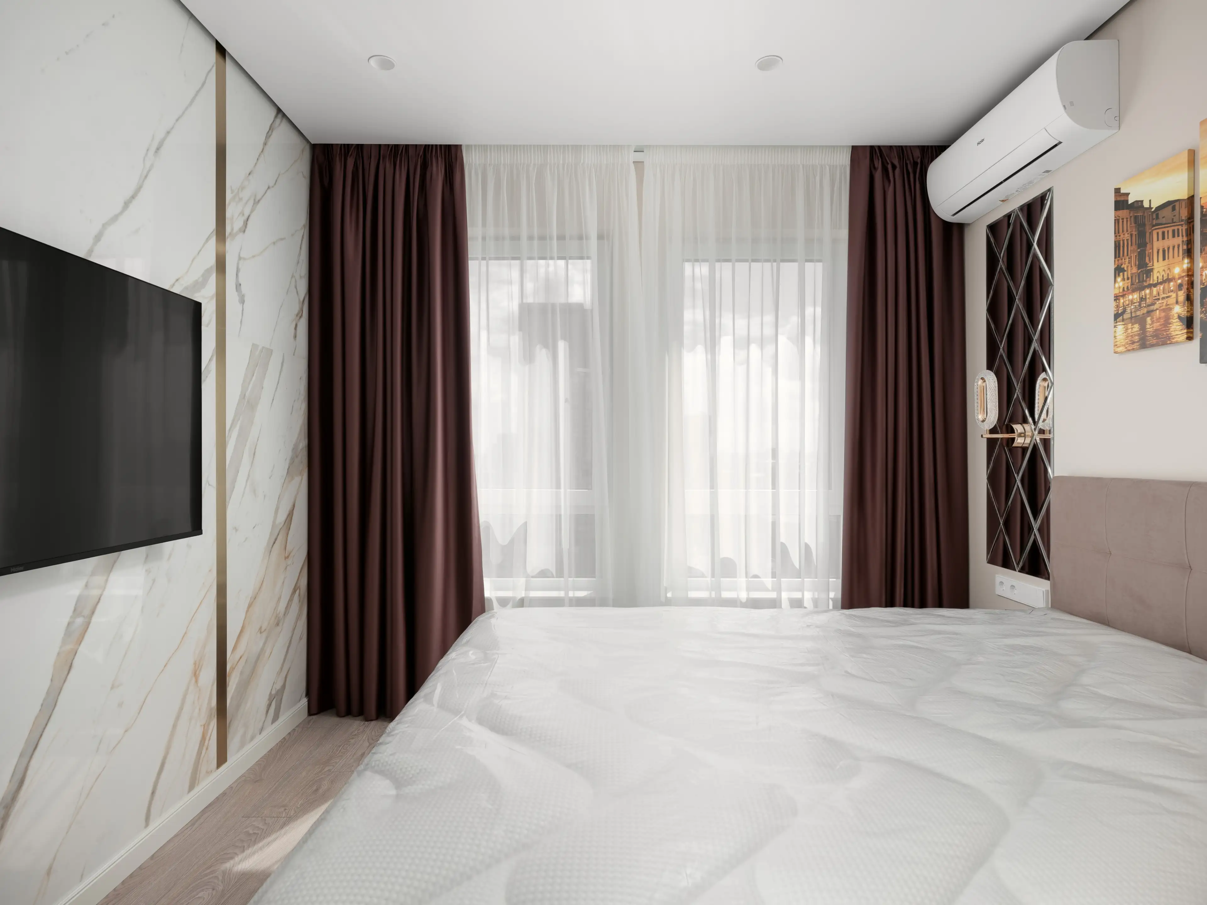 Стена напротив кровати оформлена декоративными мраморными панелями с вертикальными вставками из латуни, являющимися фоном для телевизионной зоны.