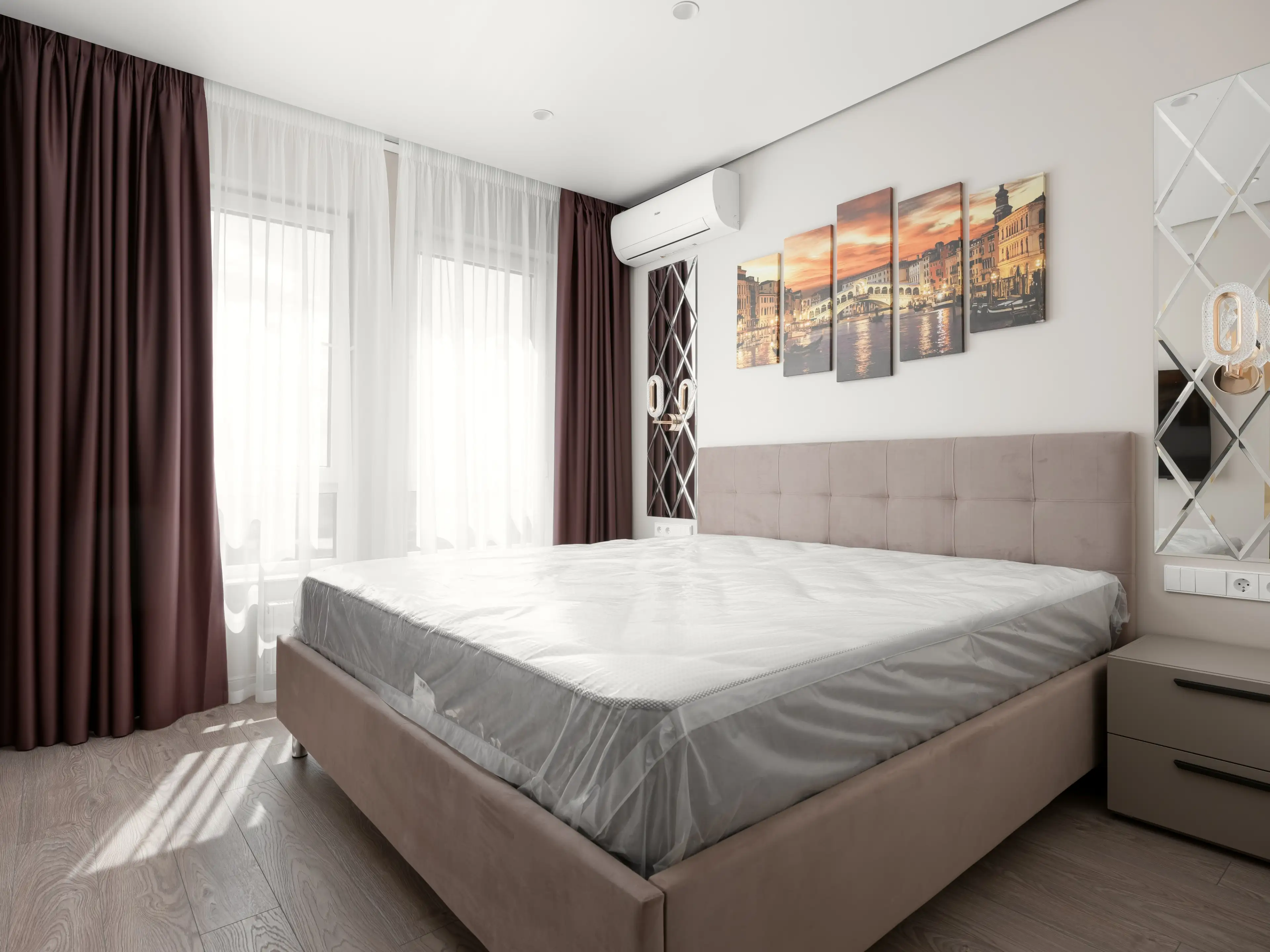 Заказчику не терпелось увидеть результат работы над интерьером, а нам — отснять материал для этого видео. Мы даже застали распаковку некоторых, только что доставленных предметов интерьера, например, матраса для кровати.
