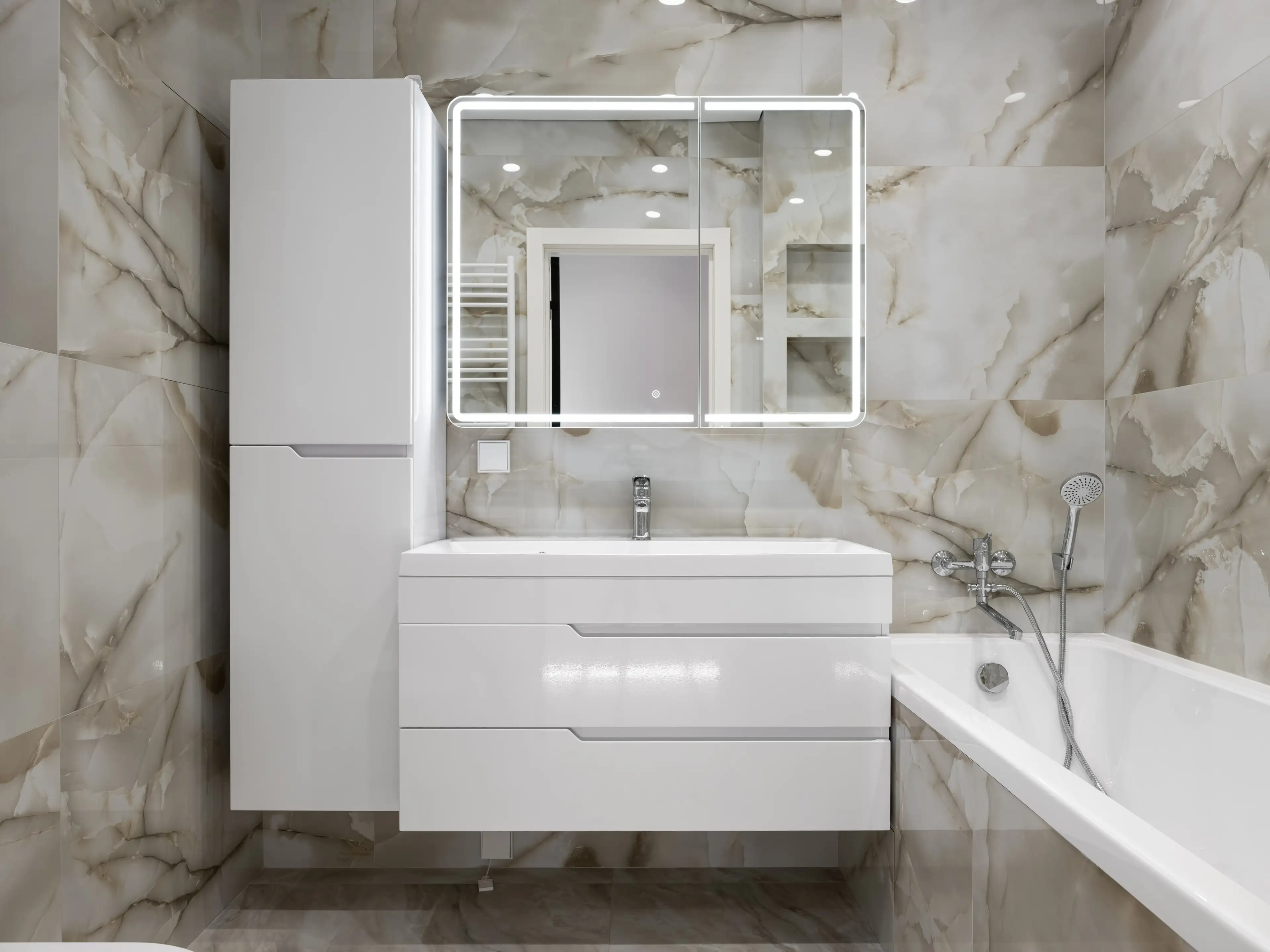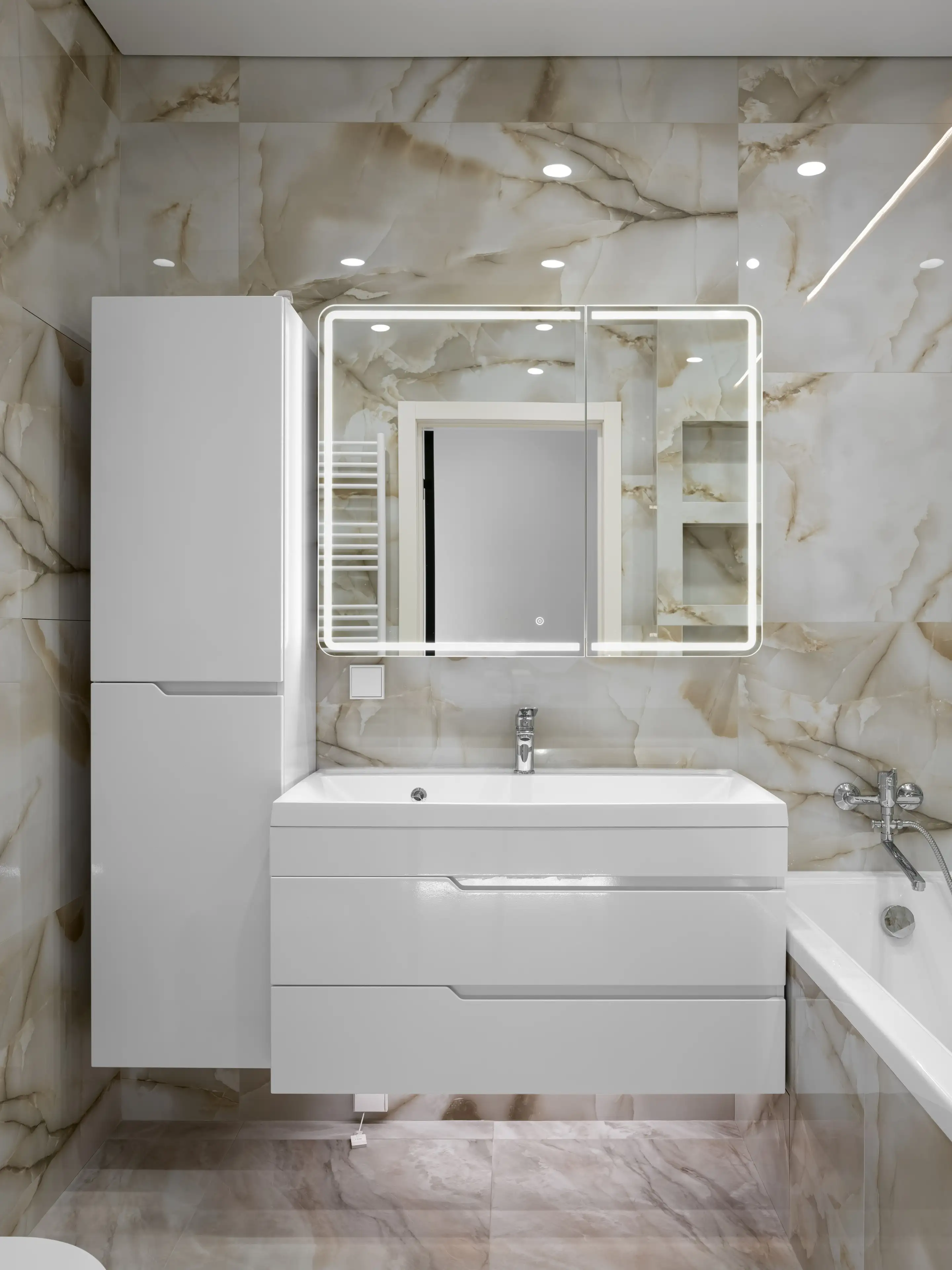 Дизайнеры сочетают тёплый молочный цвет в штукатурке стен, нежные серо-розовые тона в текстуре напольного керамогранита под мрамор и нейтральный серый — в отделке мраморной акцентной панели у зеркала.