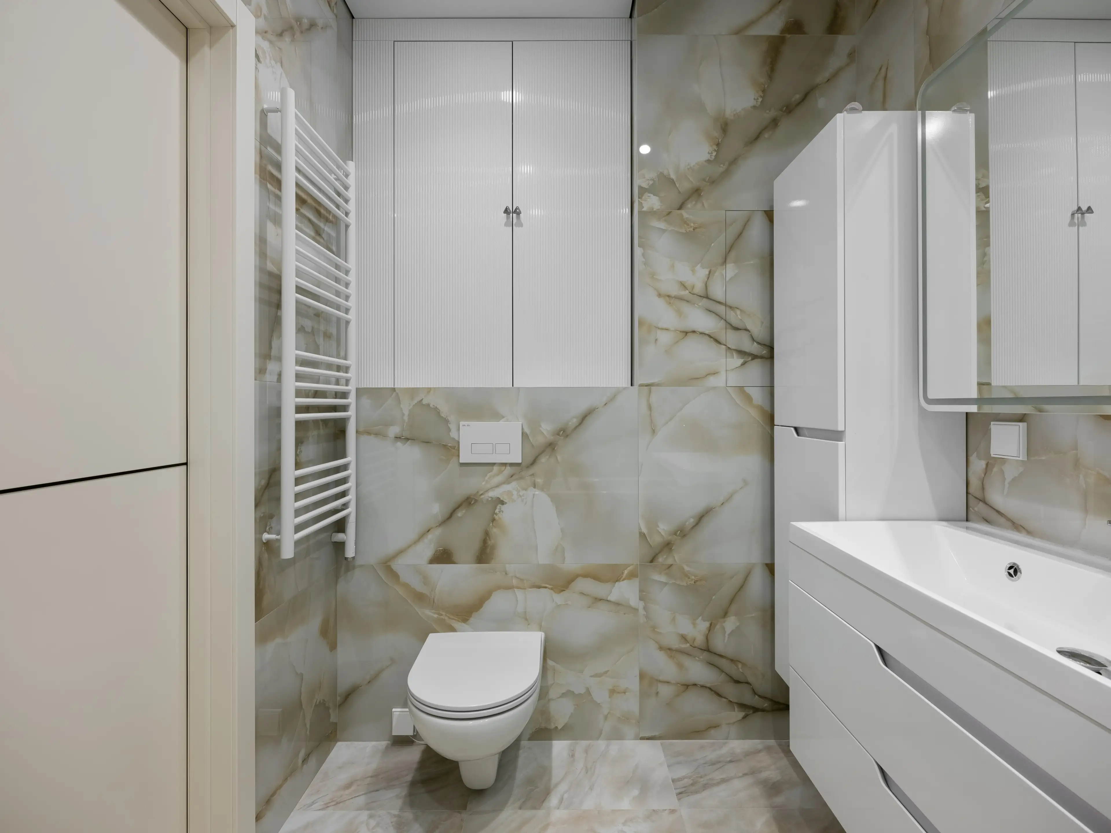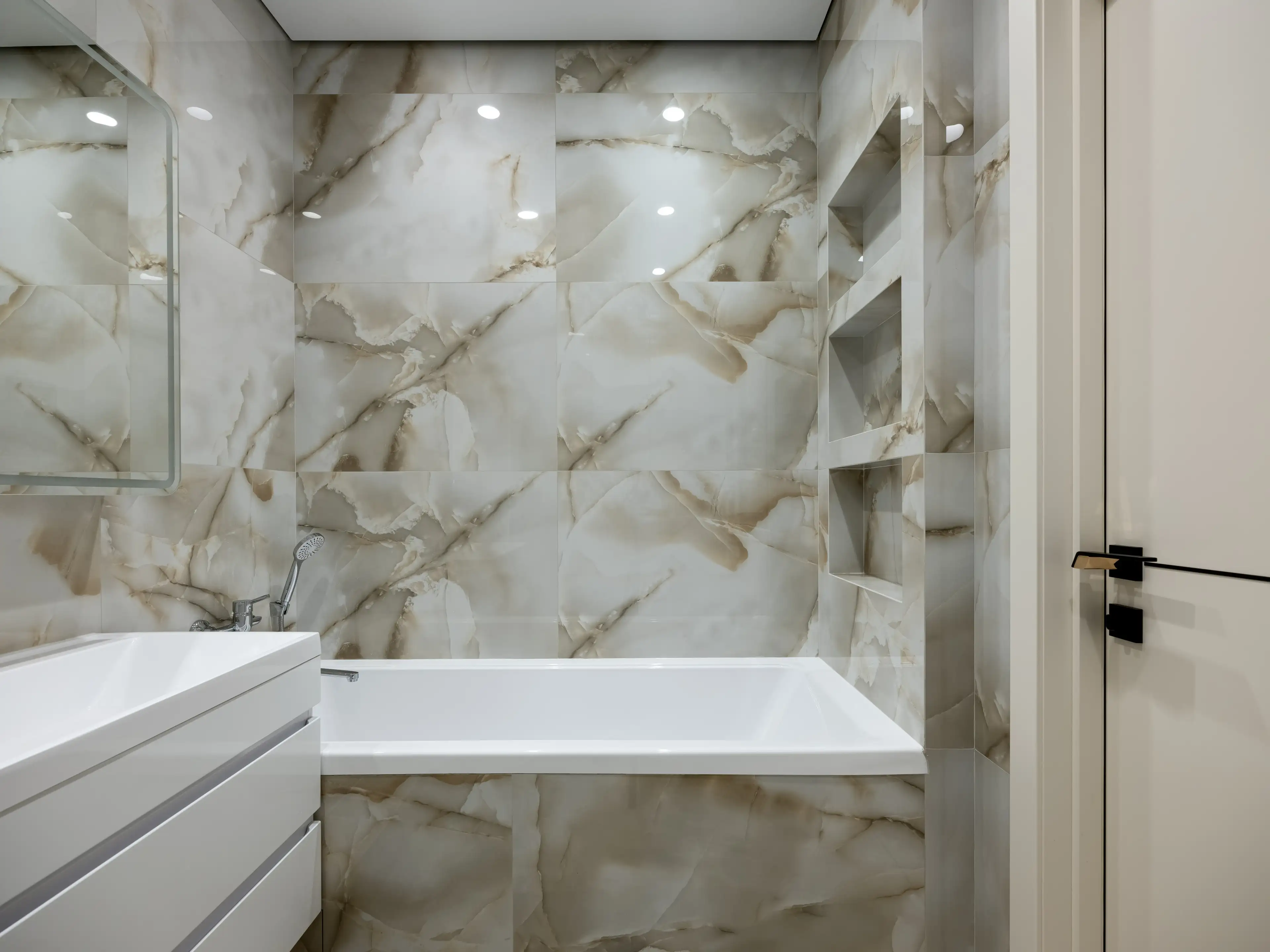 В отделке использованы крупные плиты керамогранита с красивой текстурой белого мрамора и выраженным рисунком в серо-зеленоватых тонах.