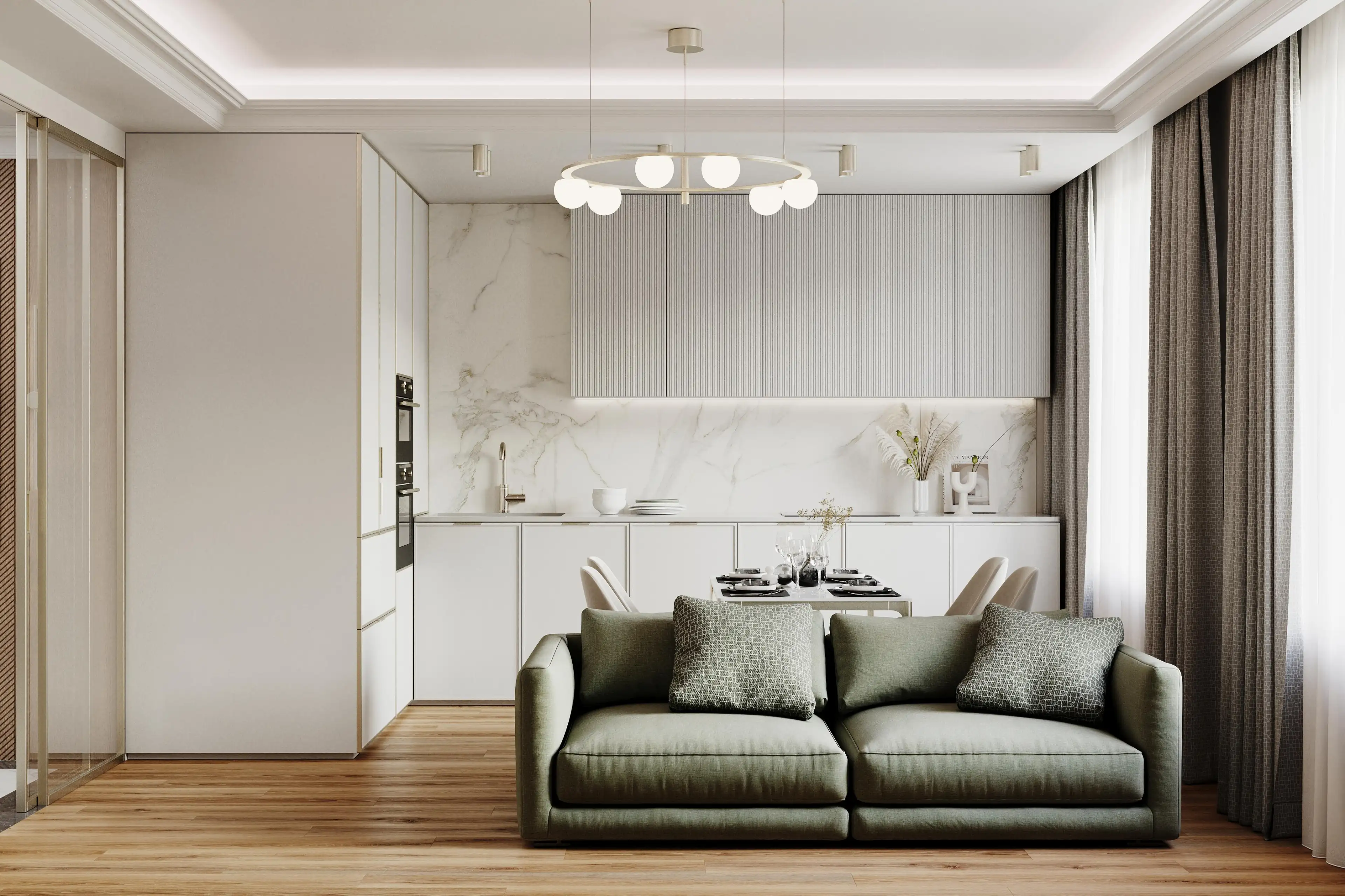В объединённом пространстве кухни-гостиной царит уже более современная атмосфера. Доминирует белый цвет: потолок, стены, фасады кухни, фартук под белый мрамор, стеллаж, обеденный стол и стулья. Ярким акцентом служит диван спокойного травянистого оттенка, а теплоты интерьеру добавляет золотисто-песочная дубовая доска на полу. Несмотря на минимум цветов и преимущественно гладкие поверхности, пространство выглядит объёмно и интересно. Не последнюю очередь в этом сыграл многоуровневый потолок, декорированный классическим карнизом и дополненный по периметру подсветкой. Помимо диодной подсветки, на потолке мы видим компактные цилиндрические светильники, а центр комнаты венчает современная люстра, напоминающая орбиту с вращающимися на ней спутниками. Фактурными акцентами выступают фасады тумбы под телевизором и отдельных кухонных шкафчиков, а также грубый текстиль штор.