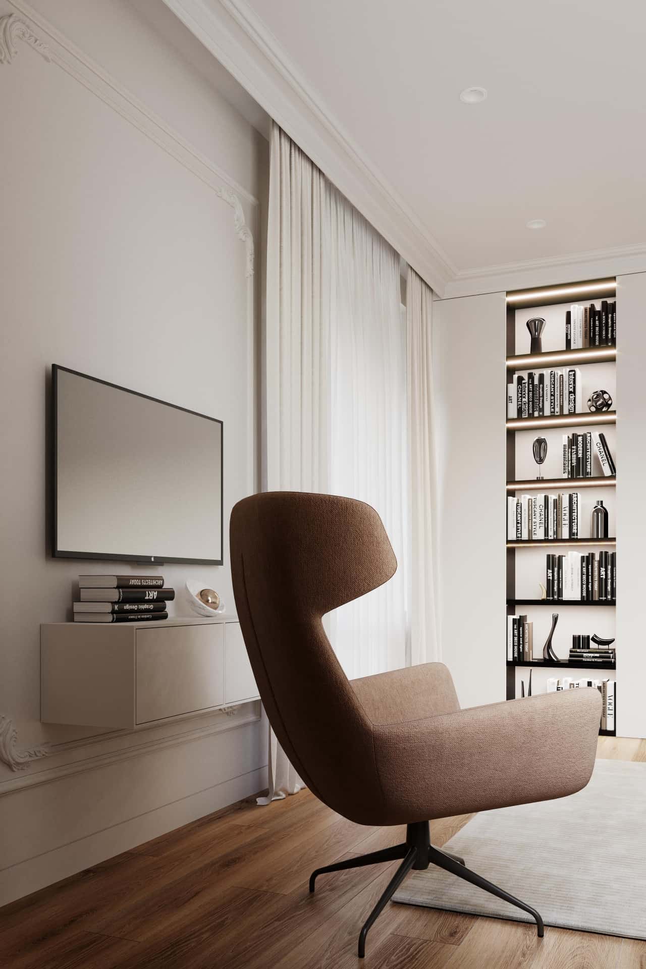 Кабинет, он же гостевая комната, также оформлен лаконично. Стены выкрашены в сливочный оттенок и декорированы молдингами с изящной лепниной. Ковёр и шторы тоже белые. У входной двери притаился встроенный шкаф, чьи дверцы практически незаметны на общем фоне. Под стать ему выглядит лаконичная белая консольная тумба под ТВ-панелью.