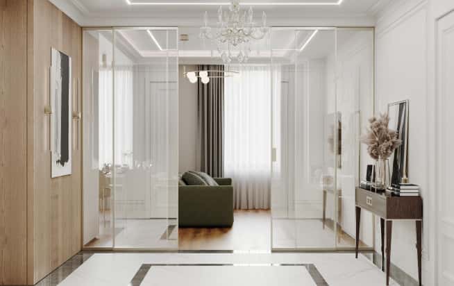 Заканчивается холл широкими полупрозрачными раздвижными дверями из матового стекла, ведущими в гостиную.