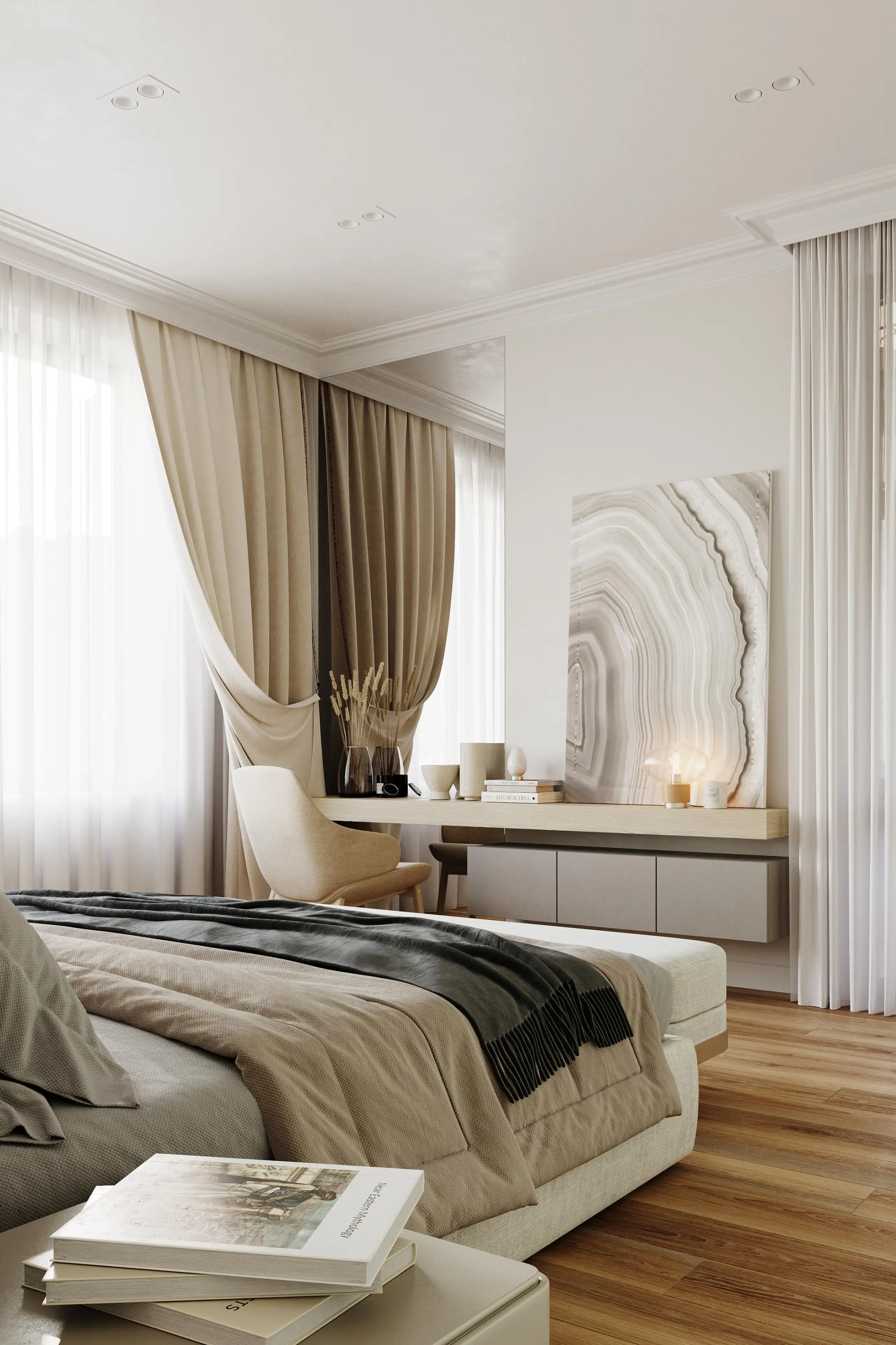 Напротив кровати консольный туалетный столик с высоким зеркалом, рядом с которым эффектно выделяется панно, воспроизводящее рисунок оникса. Под столиком приютилась подвесная тумба для косметики и других принадлежностей. Мягкое кресло кремового оттенка гармонирует с цветом штор. Струящимися белыми занавесками замаскирована дверь, ведущая на лоджию, где расположен компактный рабочий уголок. На потолке стильный контраст светильников в графичном чёрном каркасе, и изящных белых молдингов. Последними декорирована и стена. Напротив рабочего стола ещё один встроенный шкаф, а окна занавешены полупрозрачной матовой тканью.