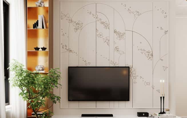 В гостиную ведёт широкий проём, через который просматривается ТВ-зона. Здесь стену декорировали панно с фантазийным орнаментом. Подвесная тумба и витрина контрастного цвета акцентируют внимание на этой зоне и формируют геометрию пространства.