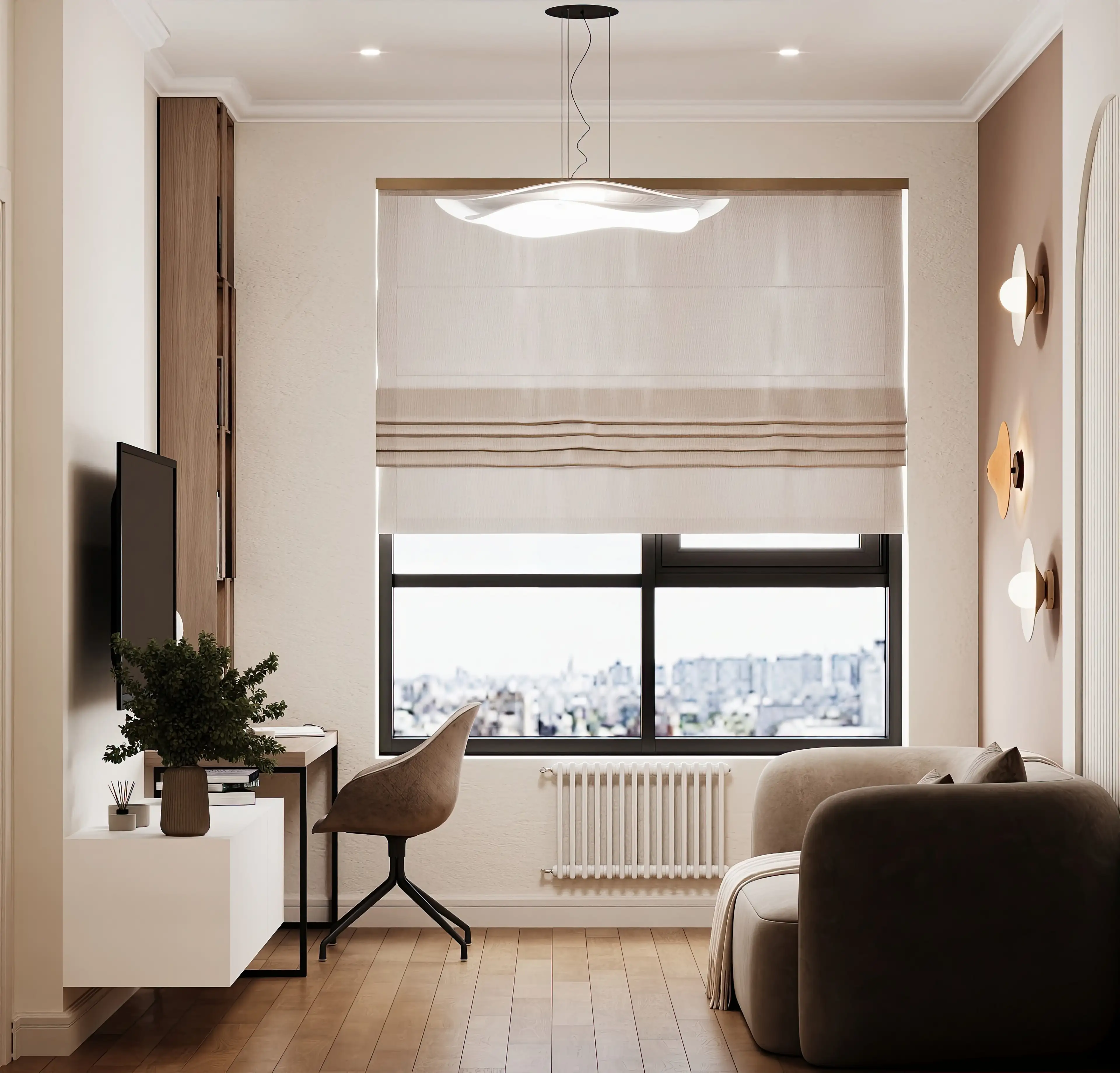 Около входа выделили место для небольшой гардеробной, вход в которую закрывает раздвижная перегородка из рельефного стекла. С другой стороны разместили телевизор и подвесную тумбу. Письменный стол сместили ближе к окну. Для контраста выбрали модель с основанием из чёрного металла и деревянной столешницей. Открытый стеллаж с внутренней подсветкой стал визуальным якорем в этой зоне. Сбалансировать прямые линии мебели решили с помощью центрального потолочного светильника, напоминающего по форме цветок.
