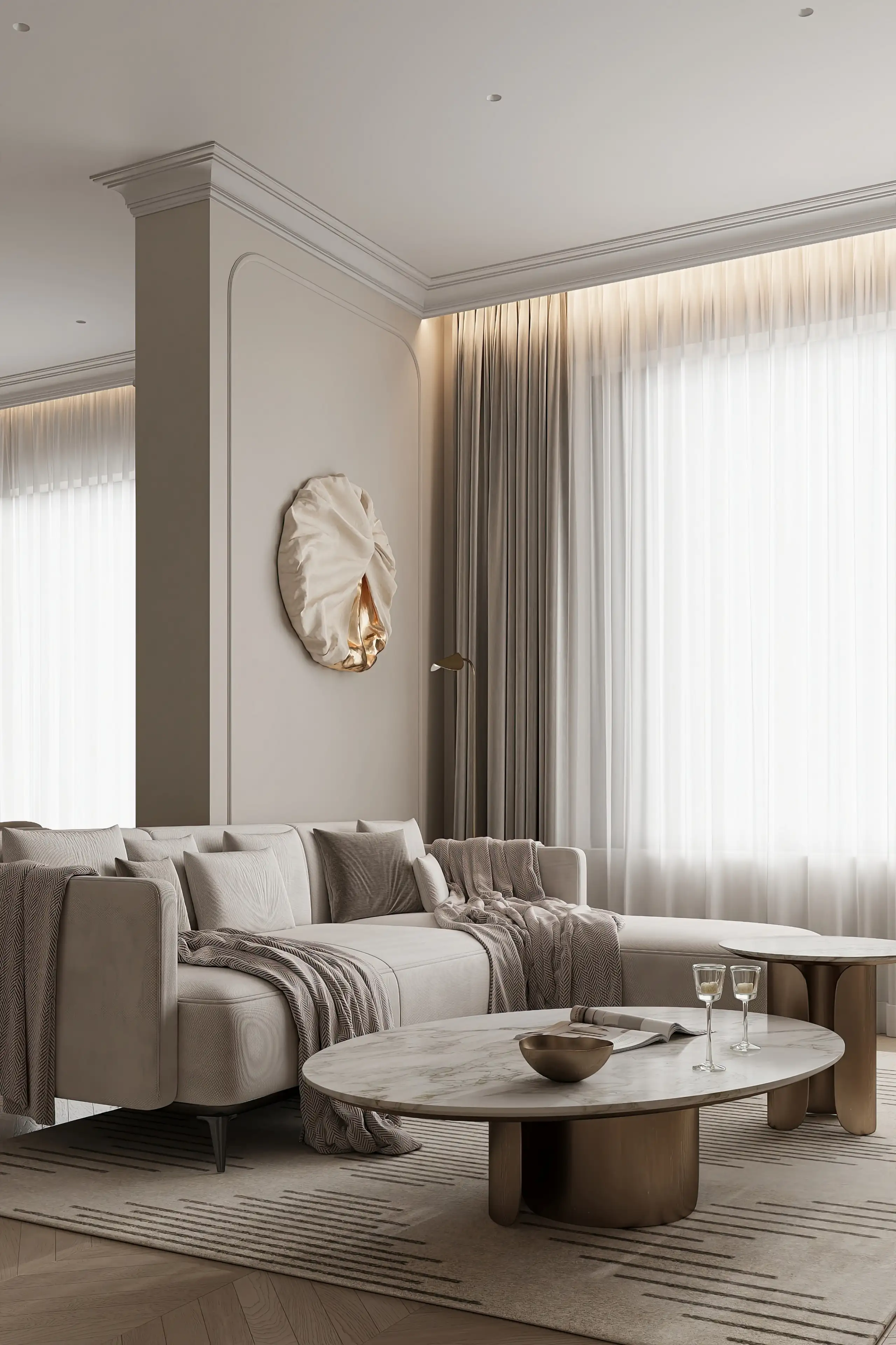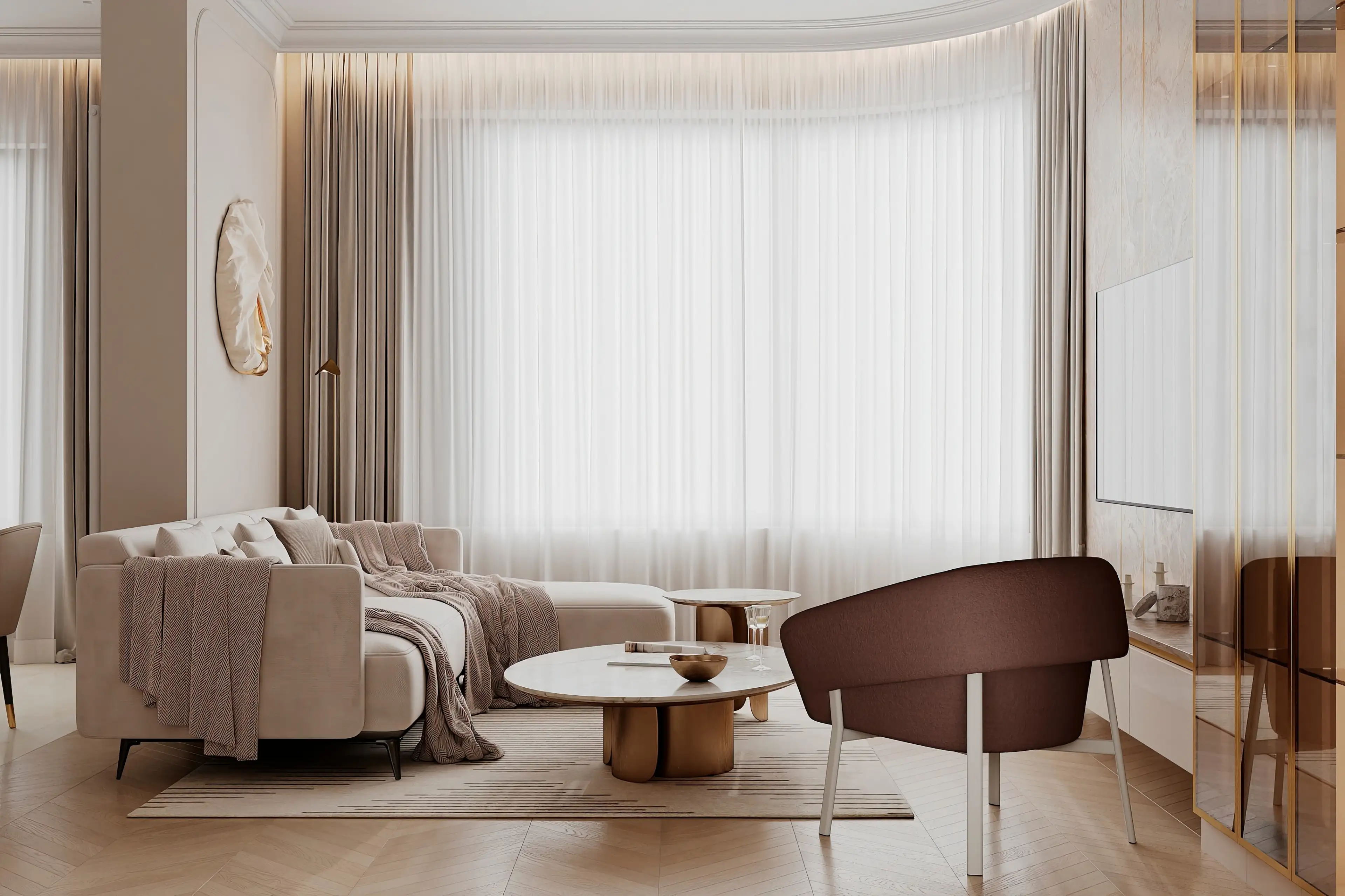 Великолепные панорамные окна в обрамлении прозрачных белоснежных штор и лёгких светло-бежевых гардин дарят помещению гостиной огромное количество естественного света и воздуха.
