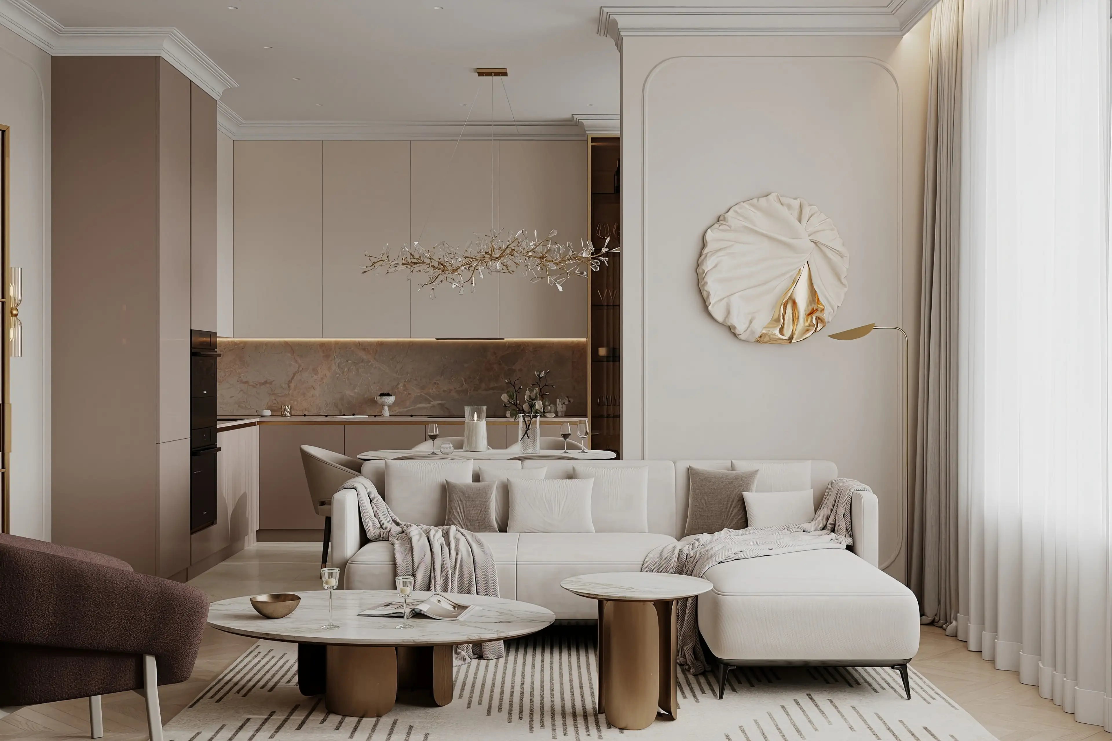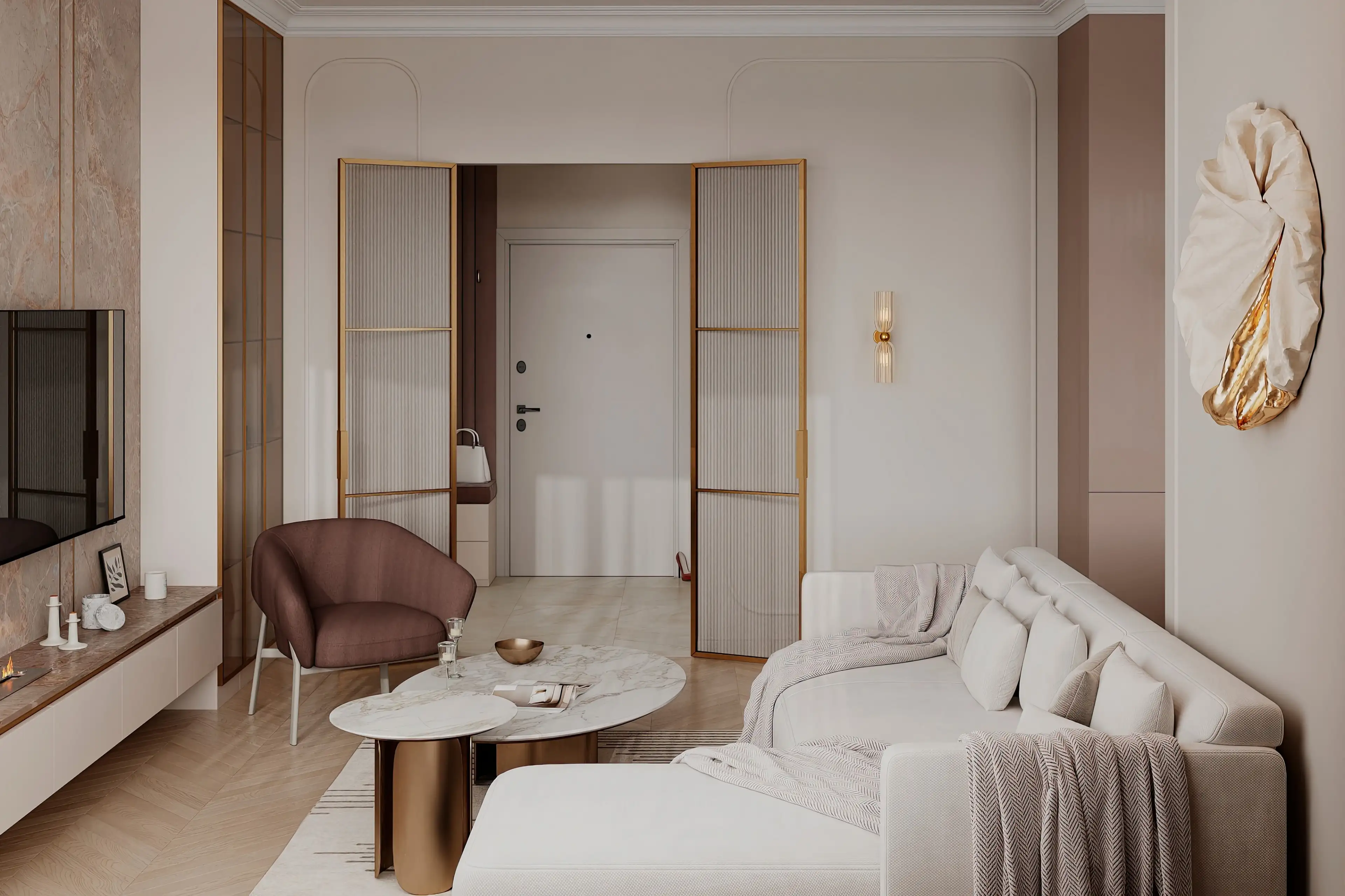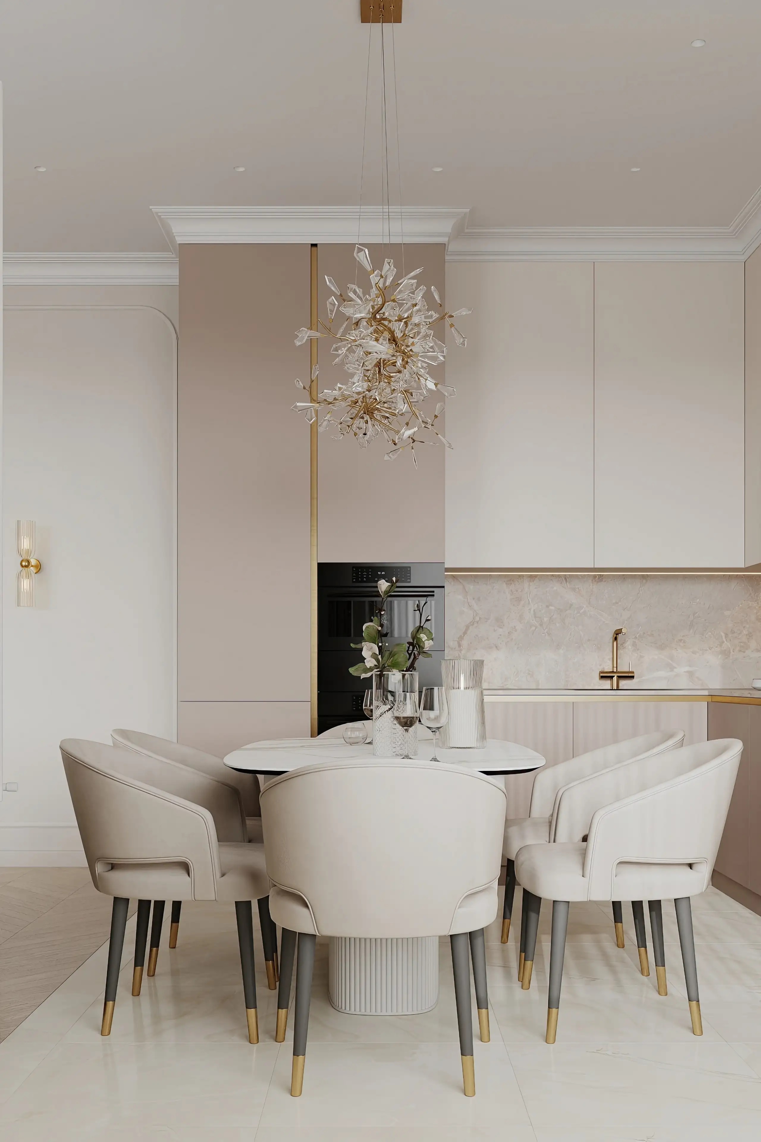 Интерьер квартиры наши дизайнеры выполнили в нежных розовато-бежевых тонах с золотой отделкой.