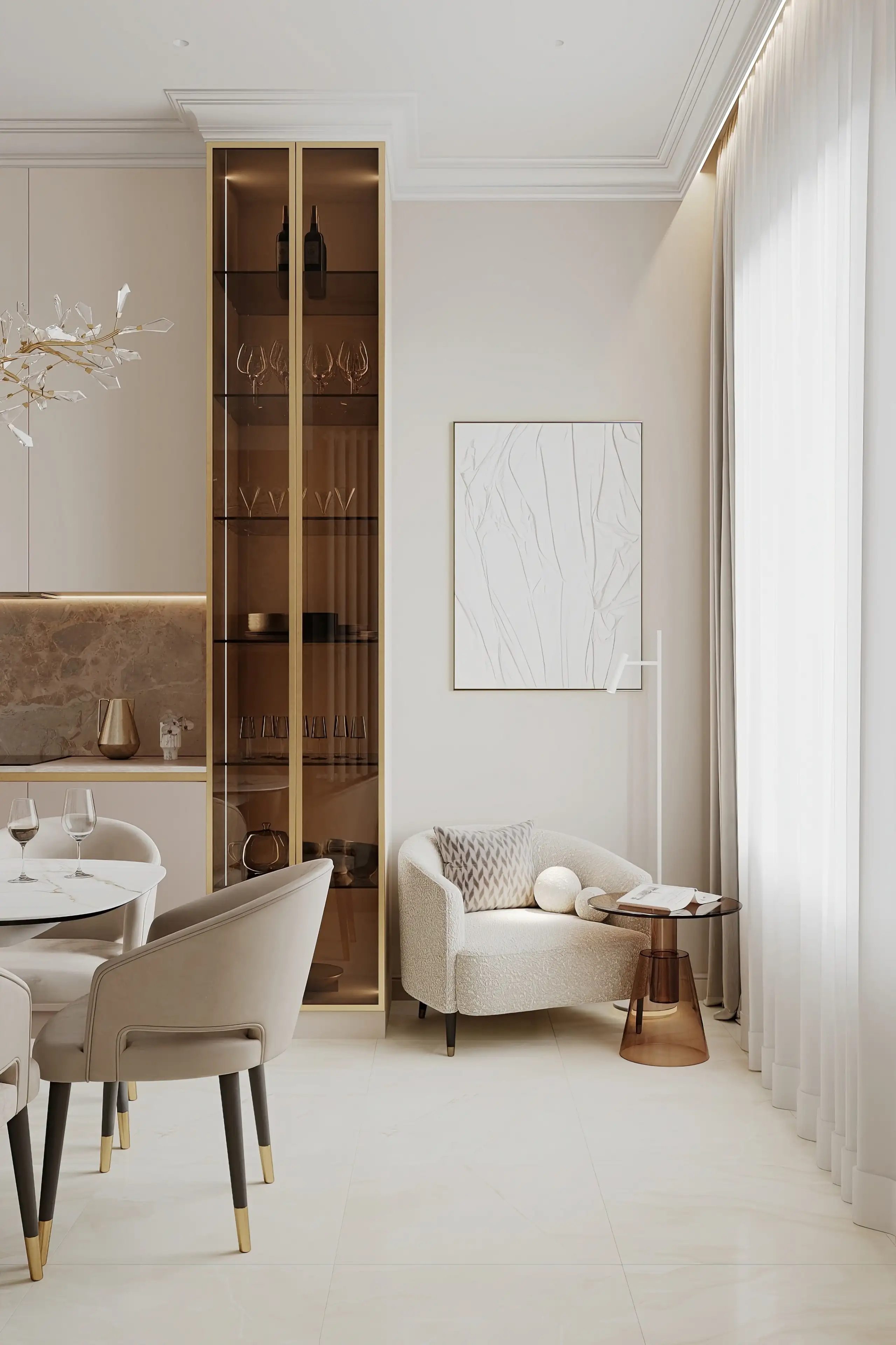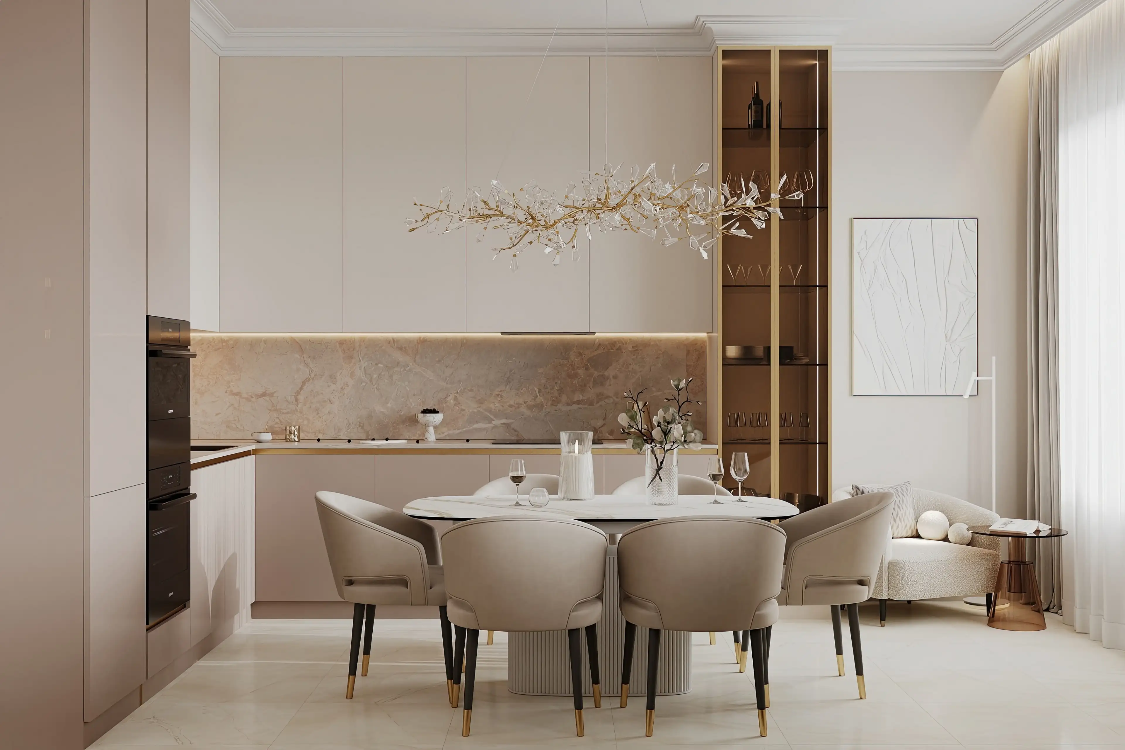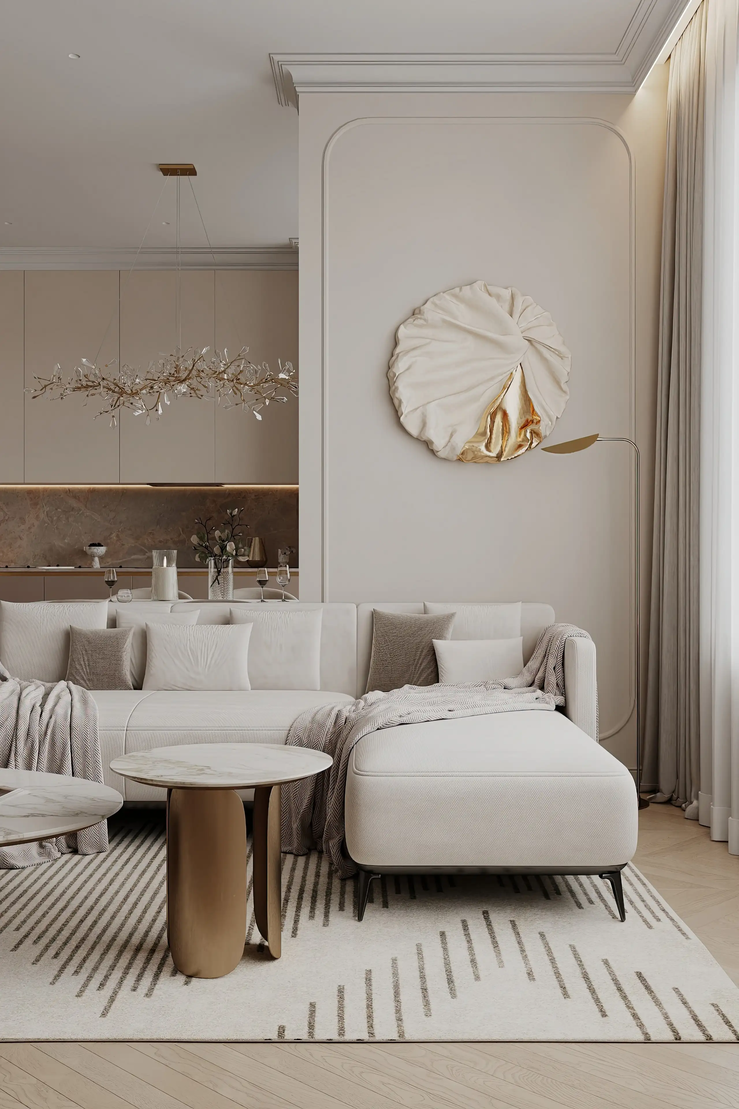 Интерьер квартиры наши дизайнеры выполнили в нежных розовато-бежевых тонах с золотой отделкой.
