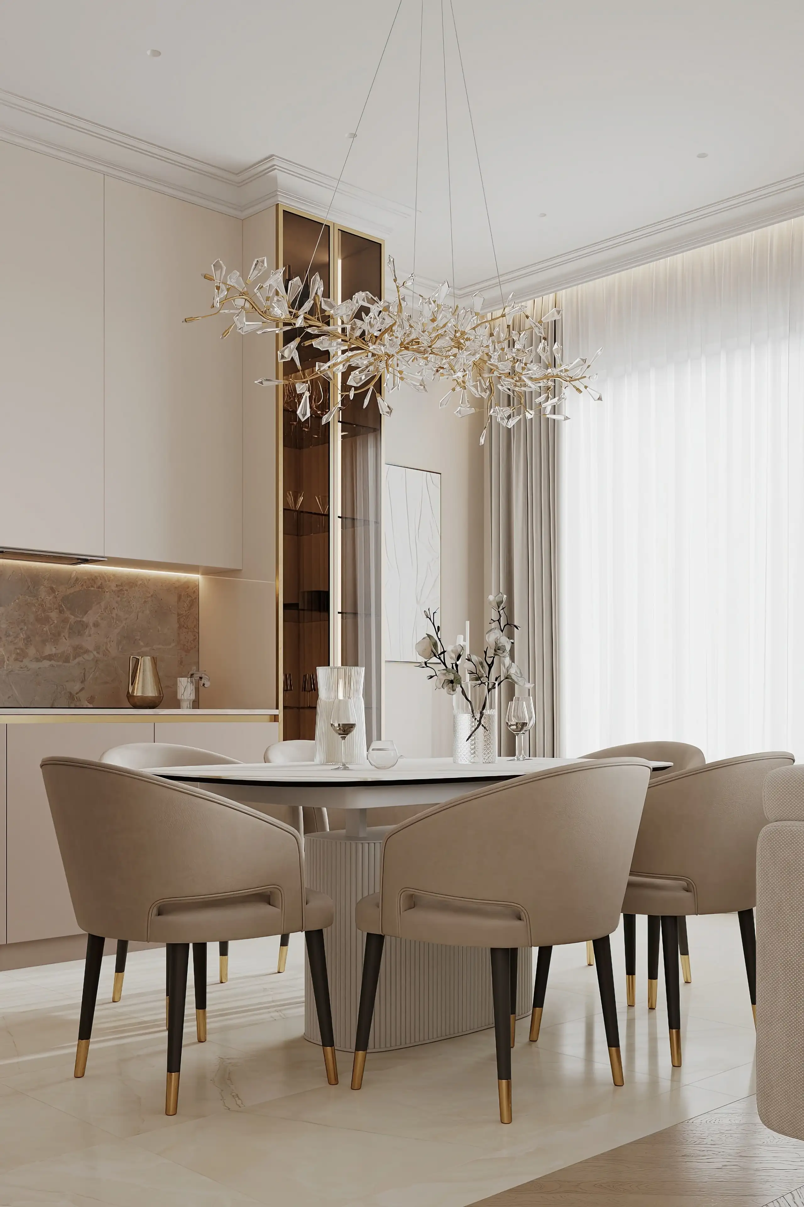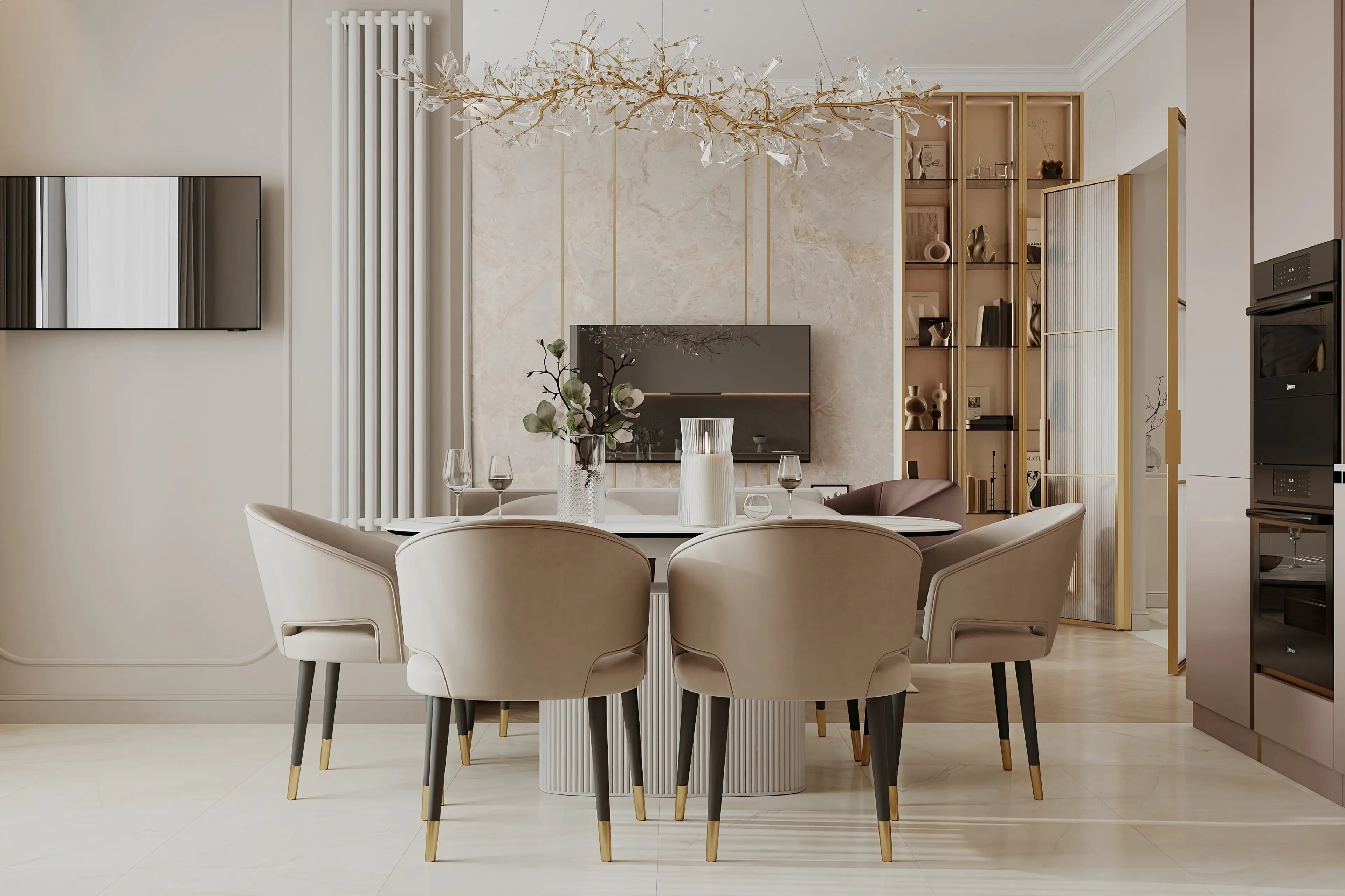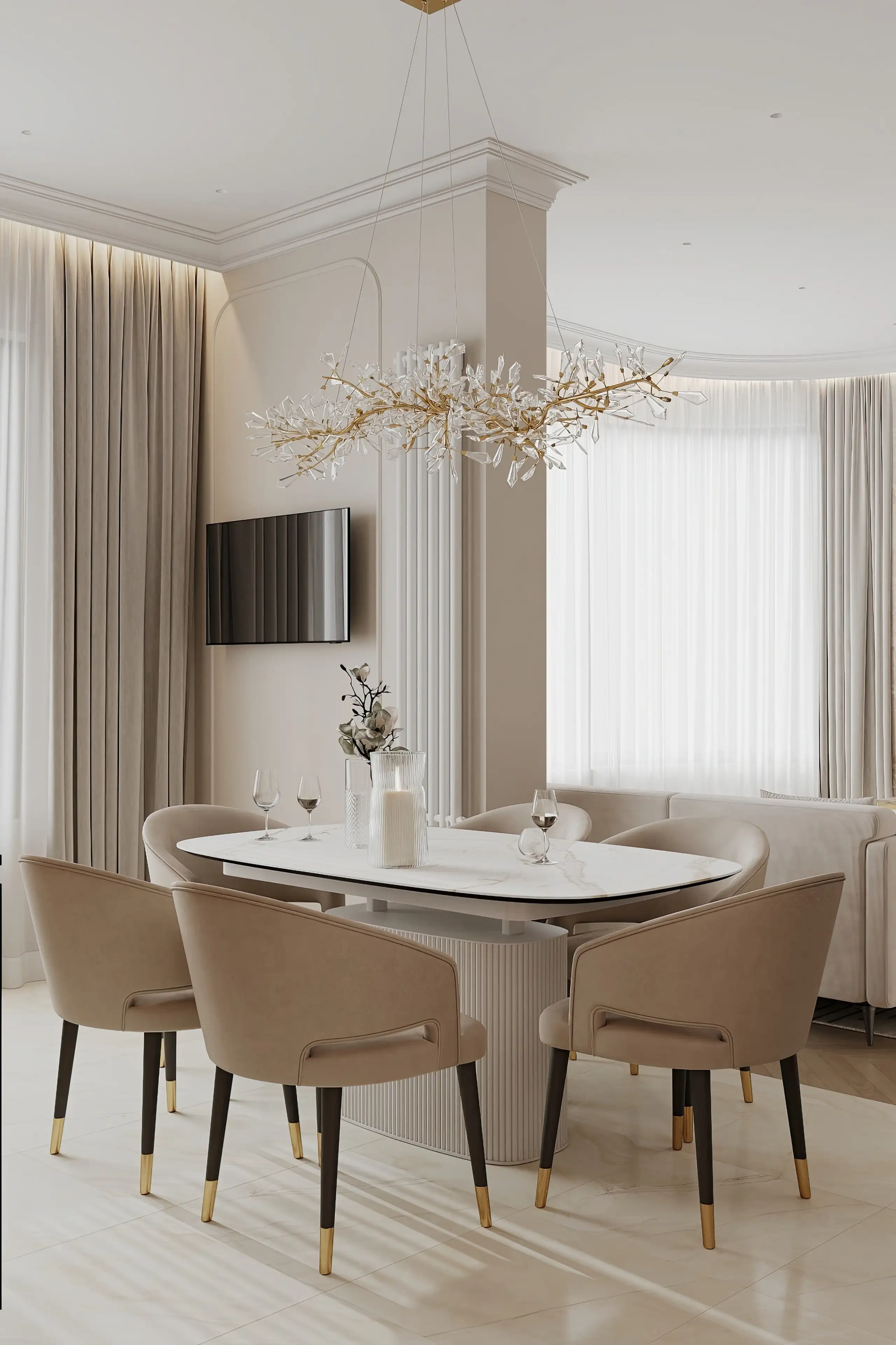 Для обеденной группы, являющейся продолжением центральной композиции, наши дизайнеры выбрали белый стол с мраморной столешницей на оригинальном рельефном подстолье и шесть мягких кресел в классическом стиле ар-деко.