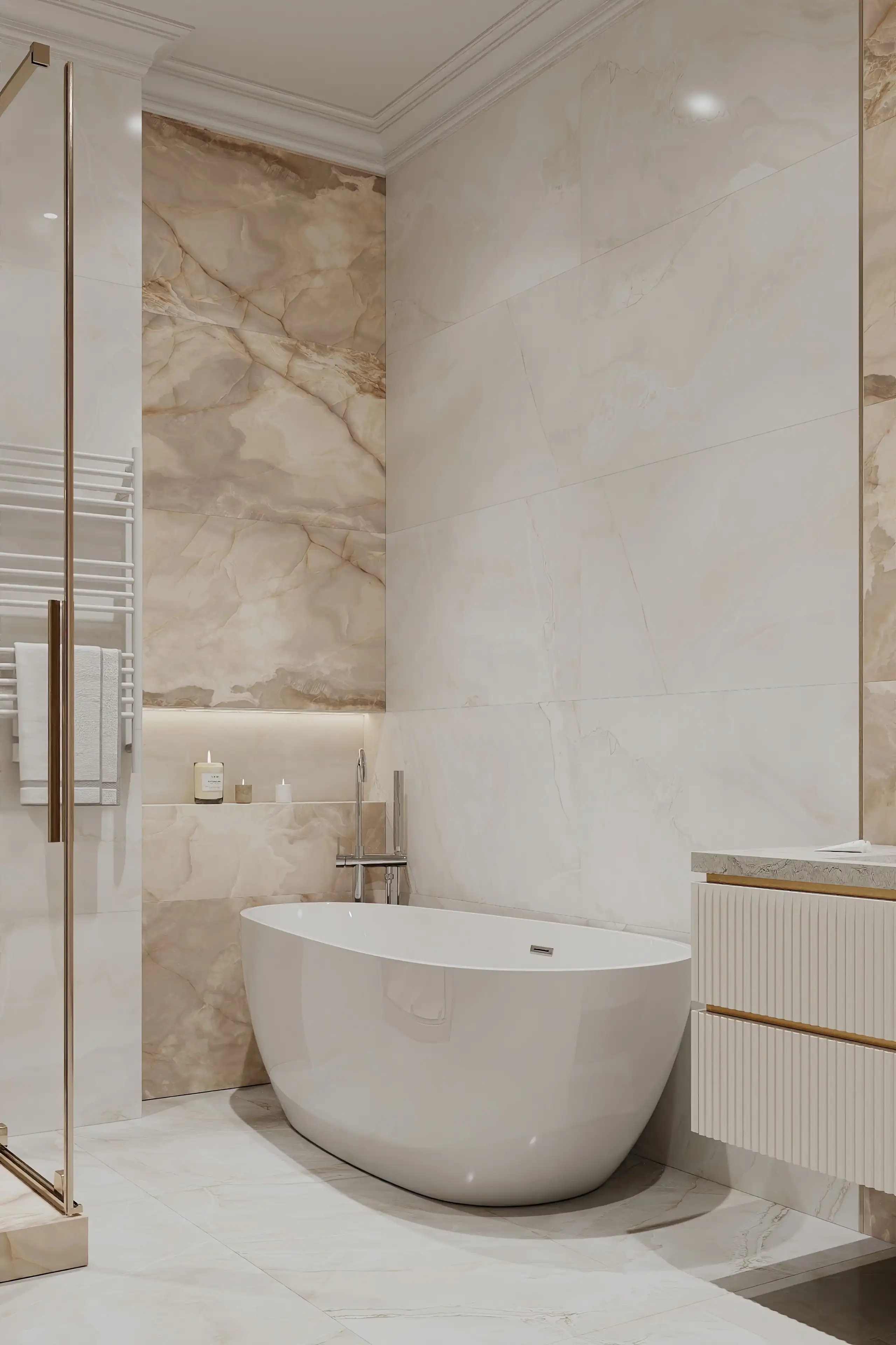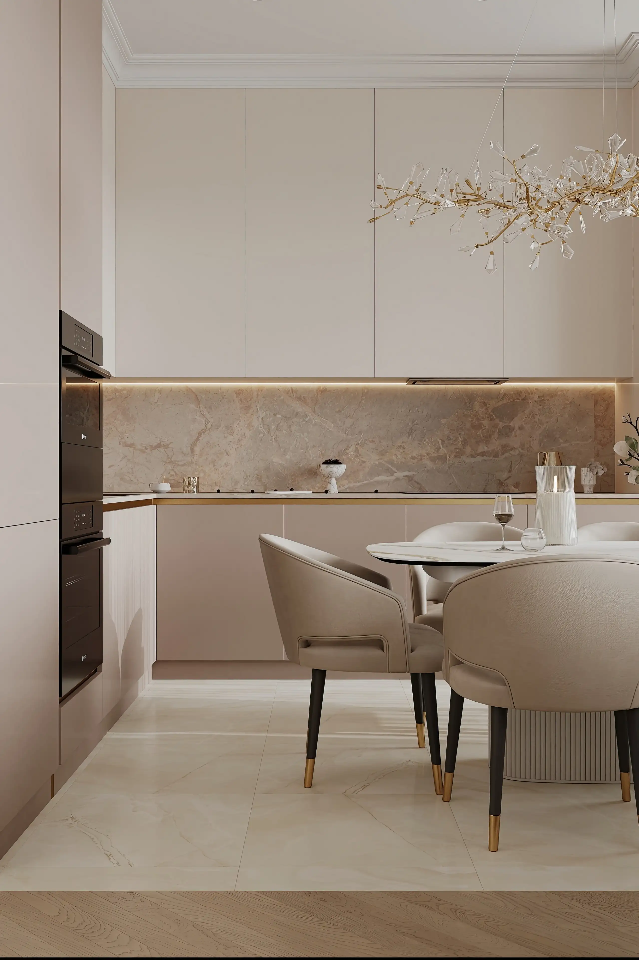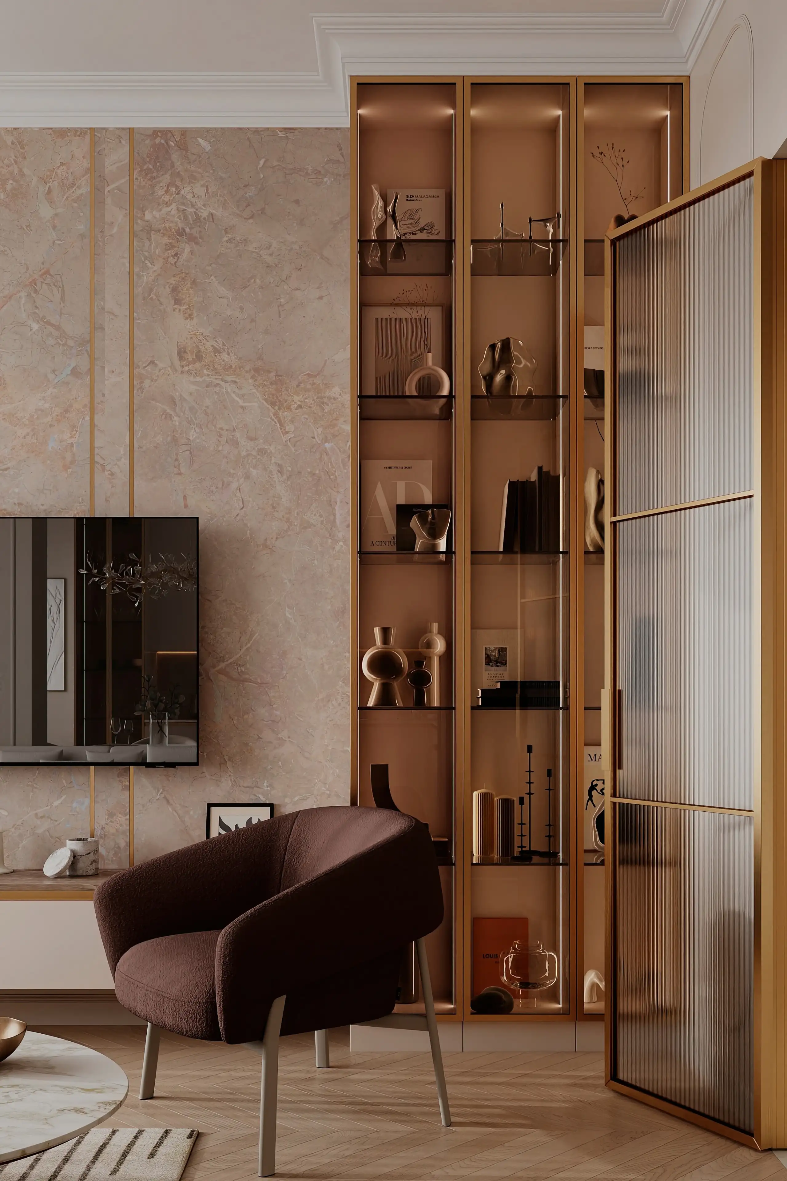 В качестве декора здесь выступает тонкий профиль из латуни, мраморный фартук и широкий карниз, идущий по всему периметру помещения.