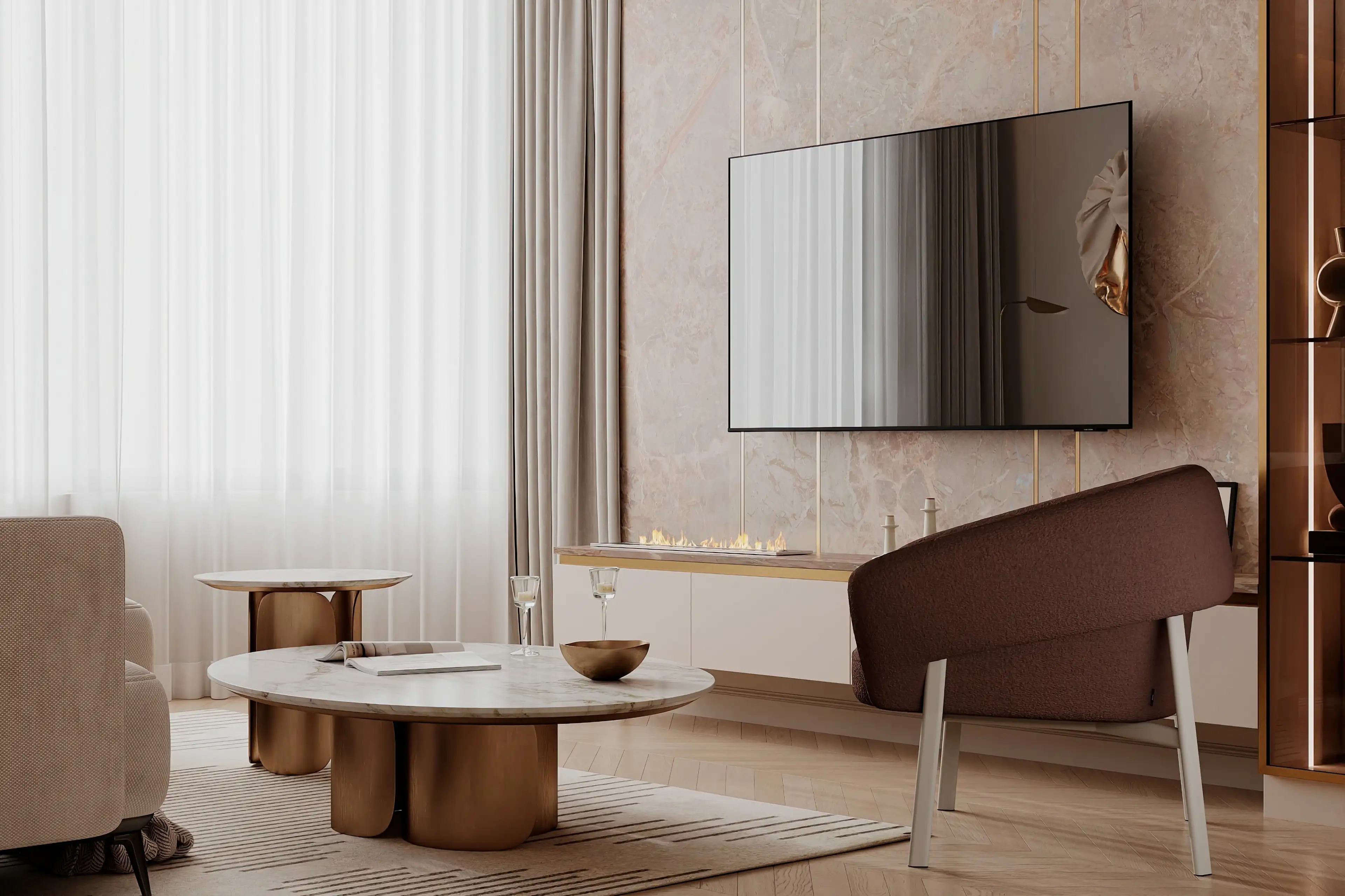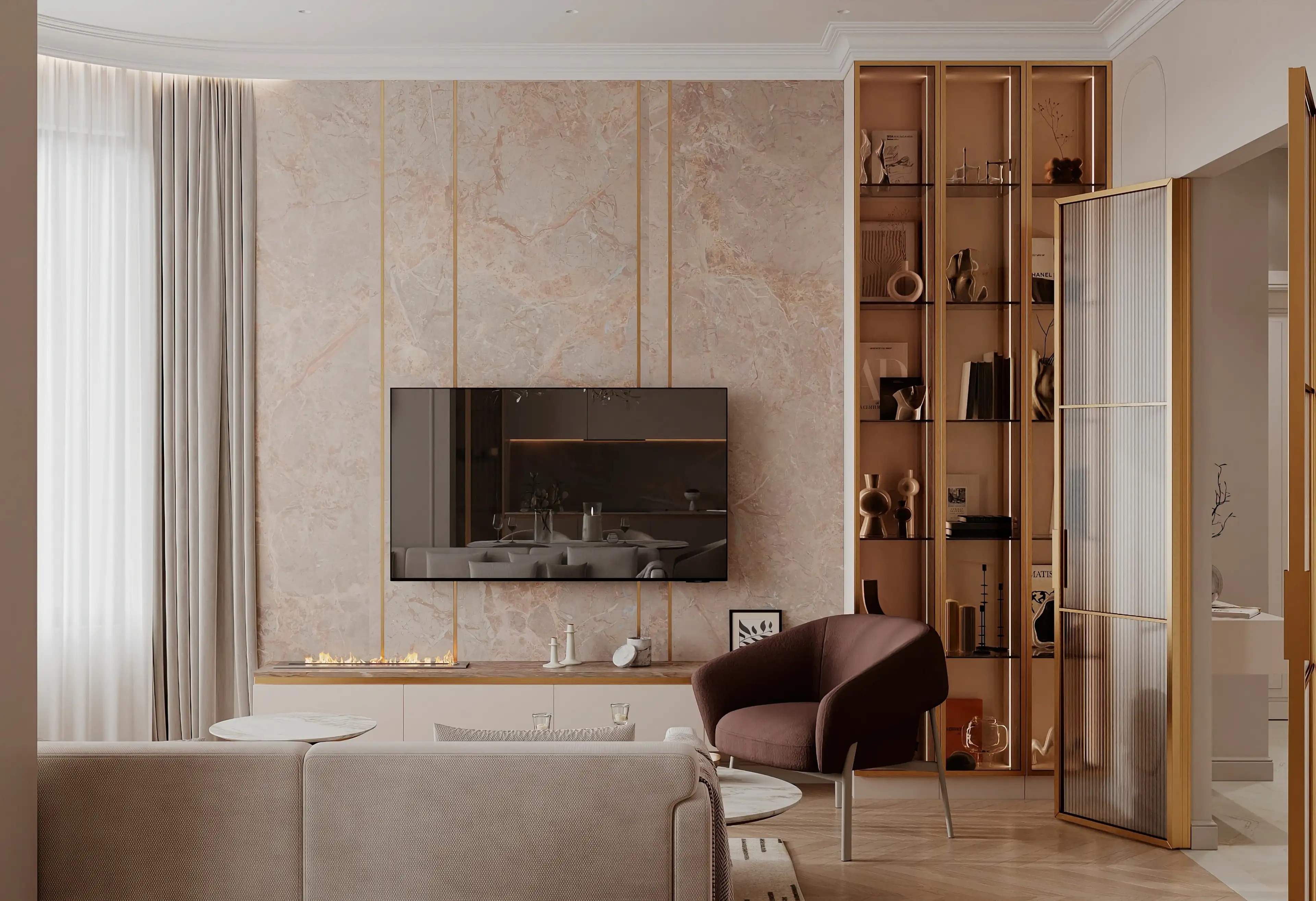 Напротив дивана дизайнеры обустроили телевизионную зону, разместив плазменную панель и подвесную тумбу на фоне акцентной стены с росписью под розовато-бежевый мрамор с золотым декором – тончайшими золотыми вертикальными профилями, поддерживающими ритм вертикалей корпусной мебели.