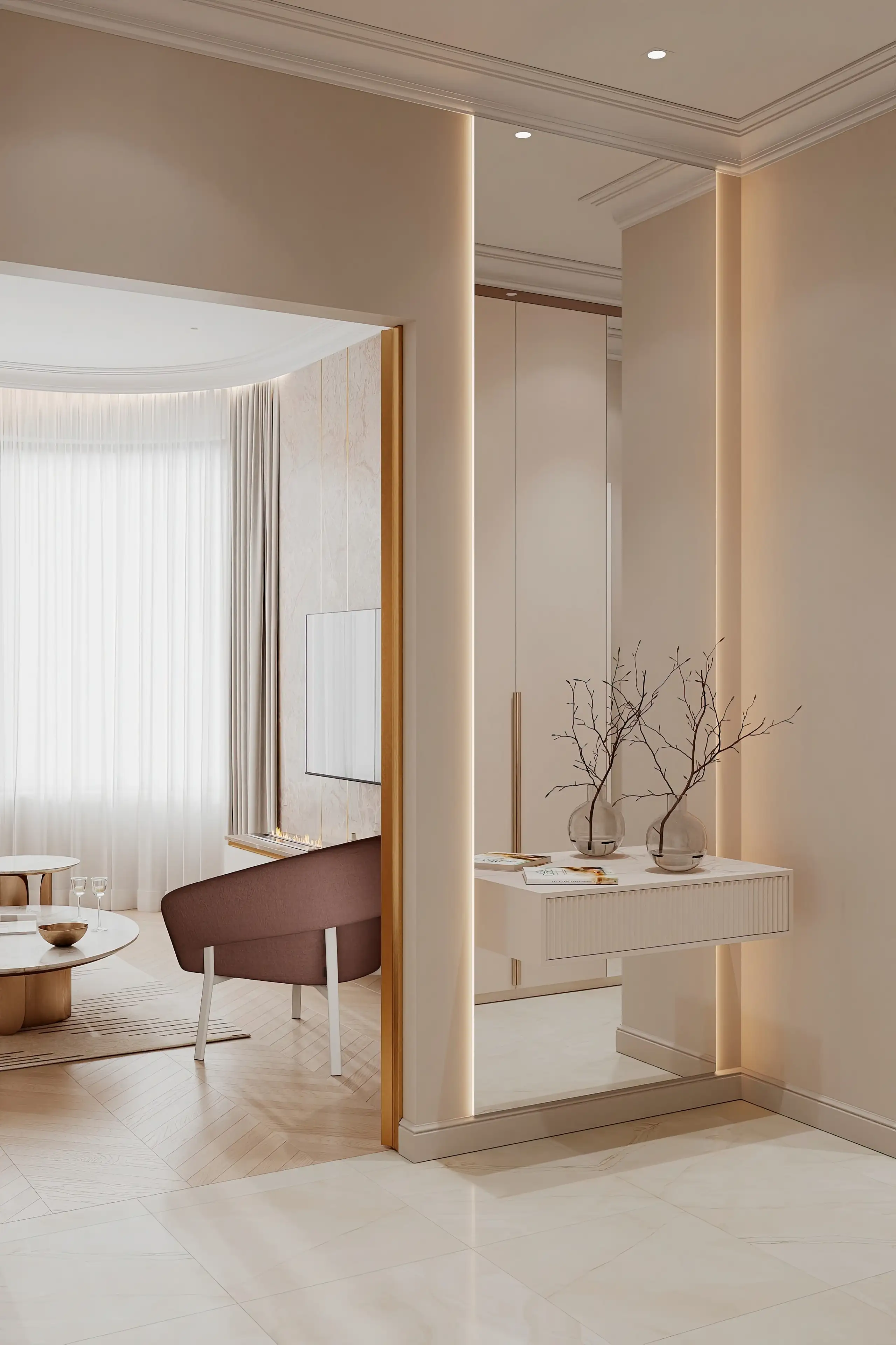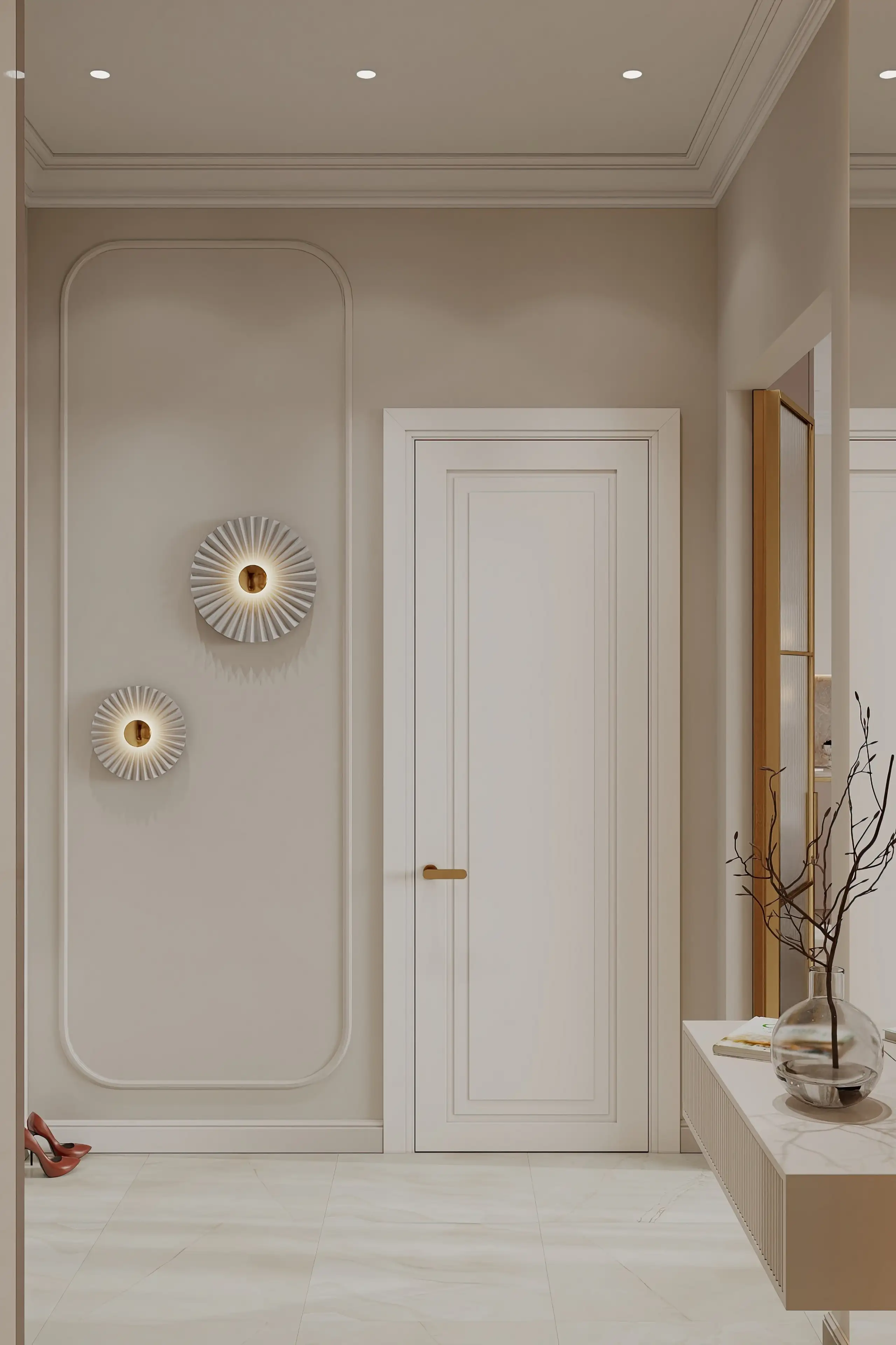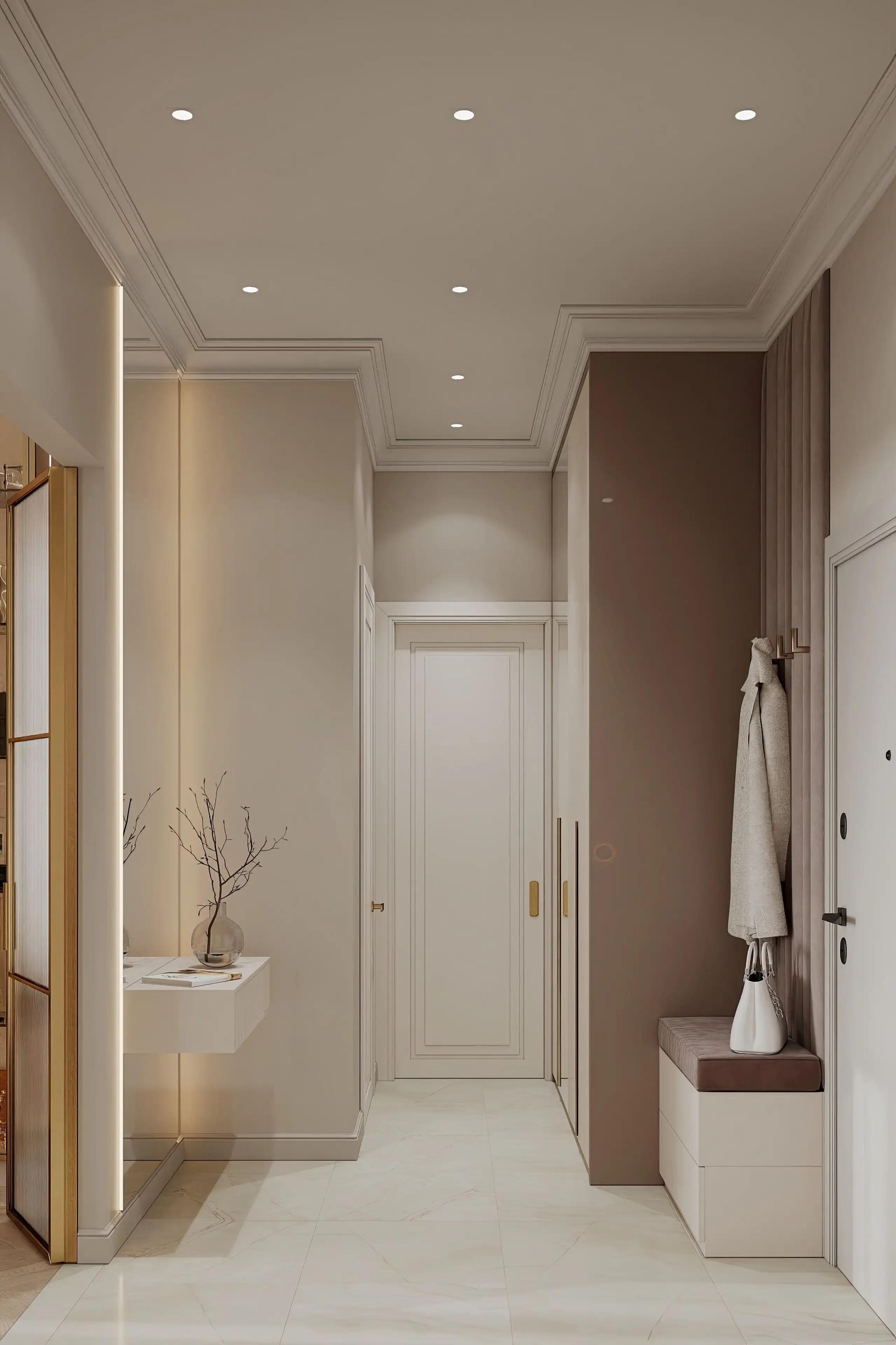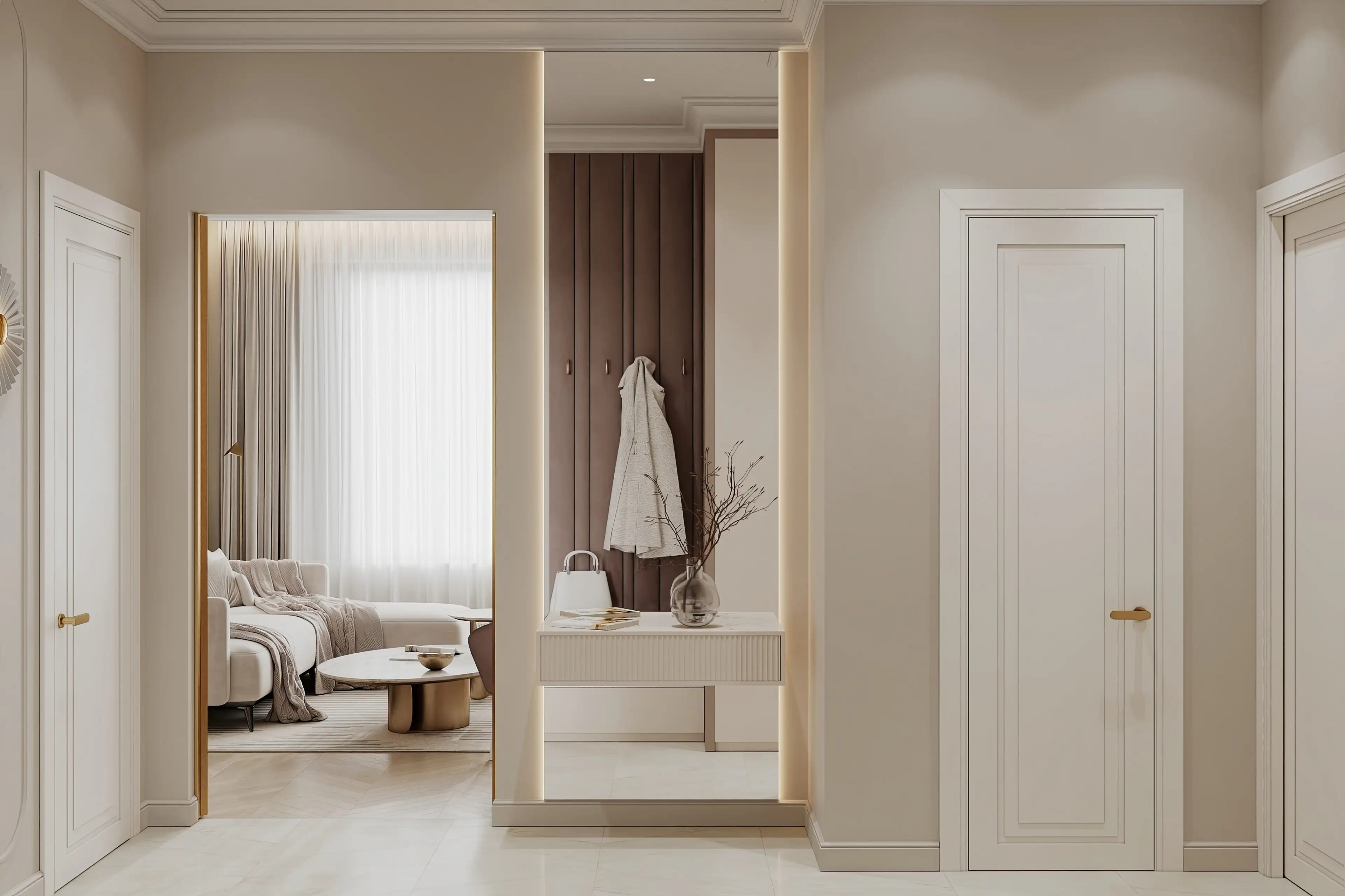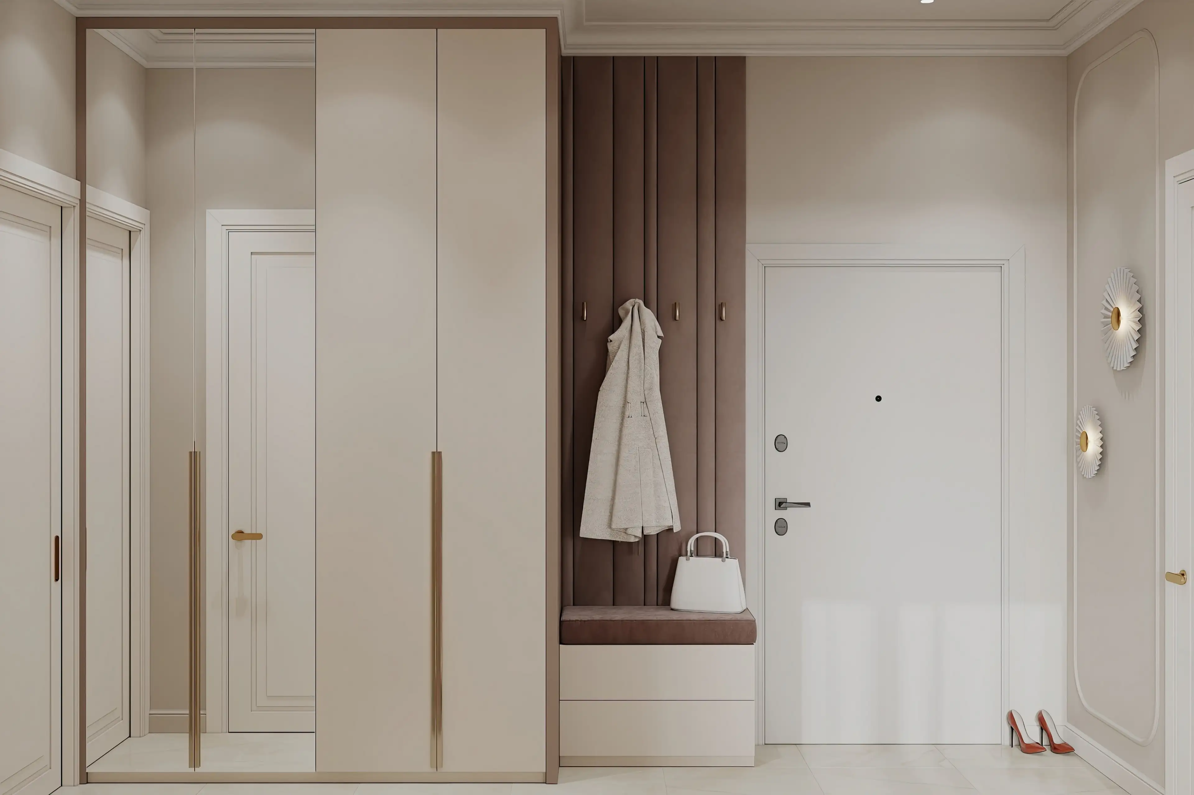 Интерьер прихожей исполнен в нежных молочных и приглушённых коричневых тонах. Через двустворчатые стеклянные двери гостиной прихожую заливает поток дневного света.