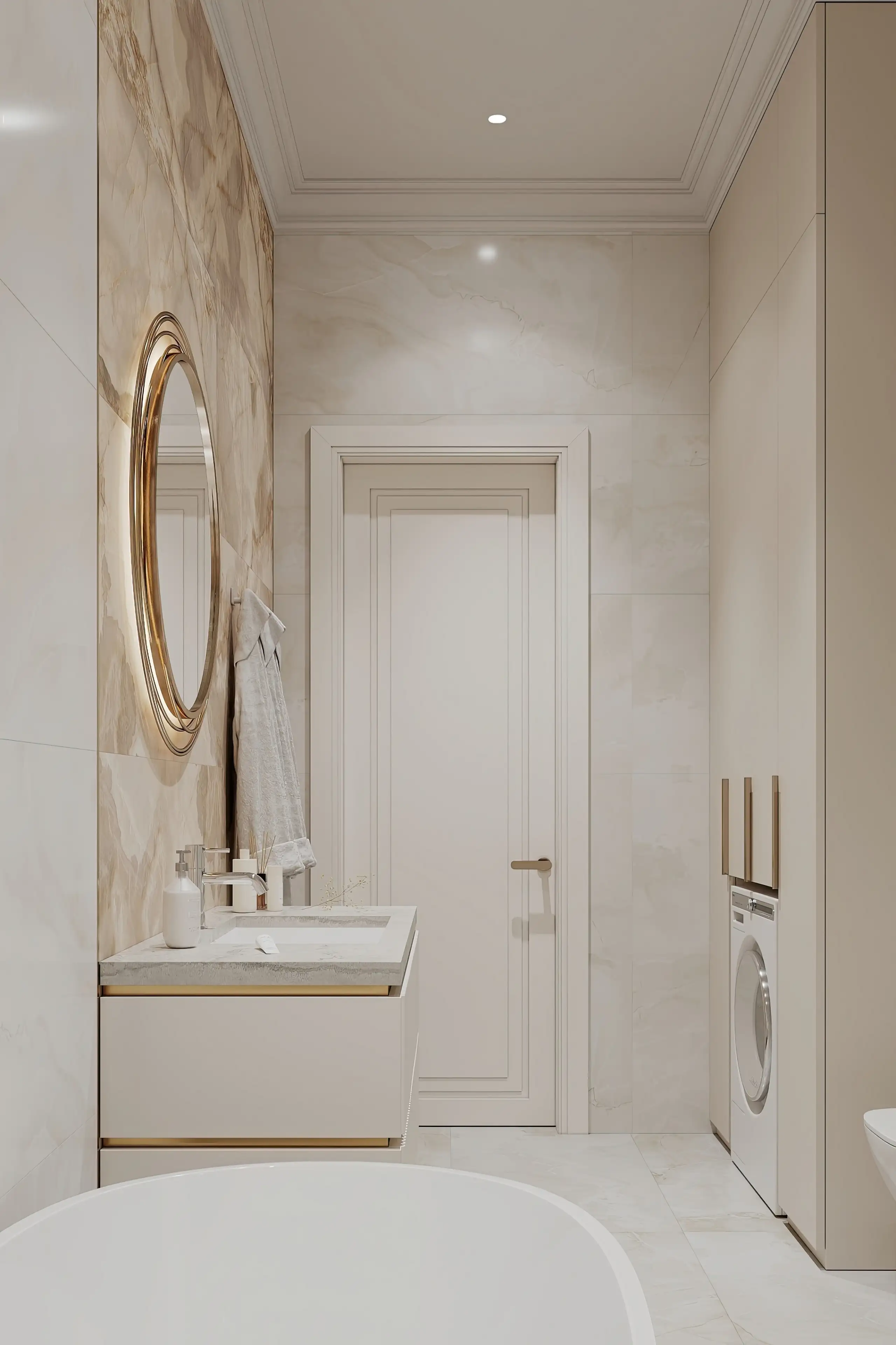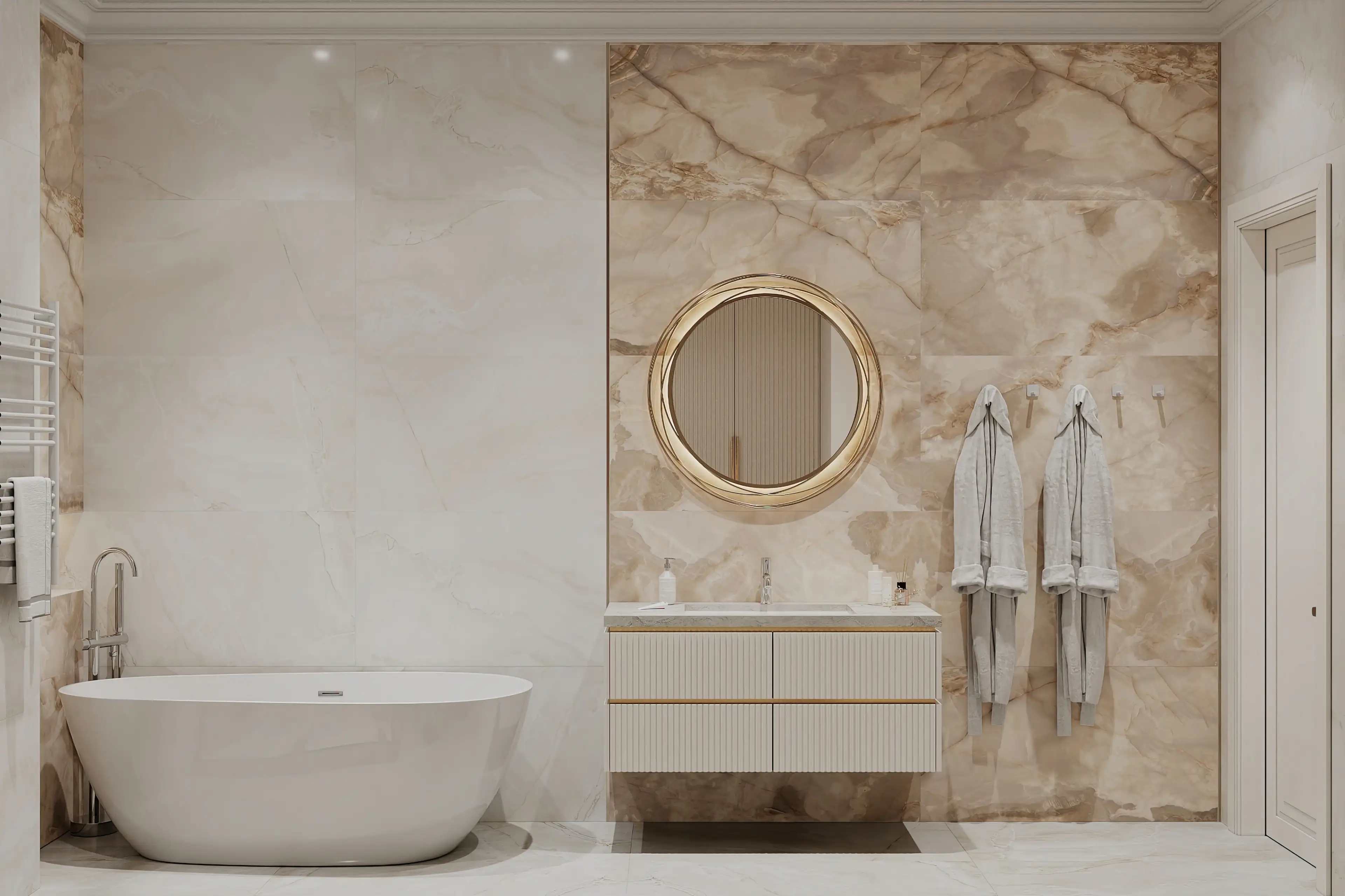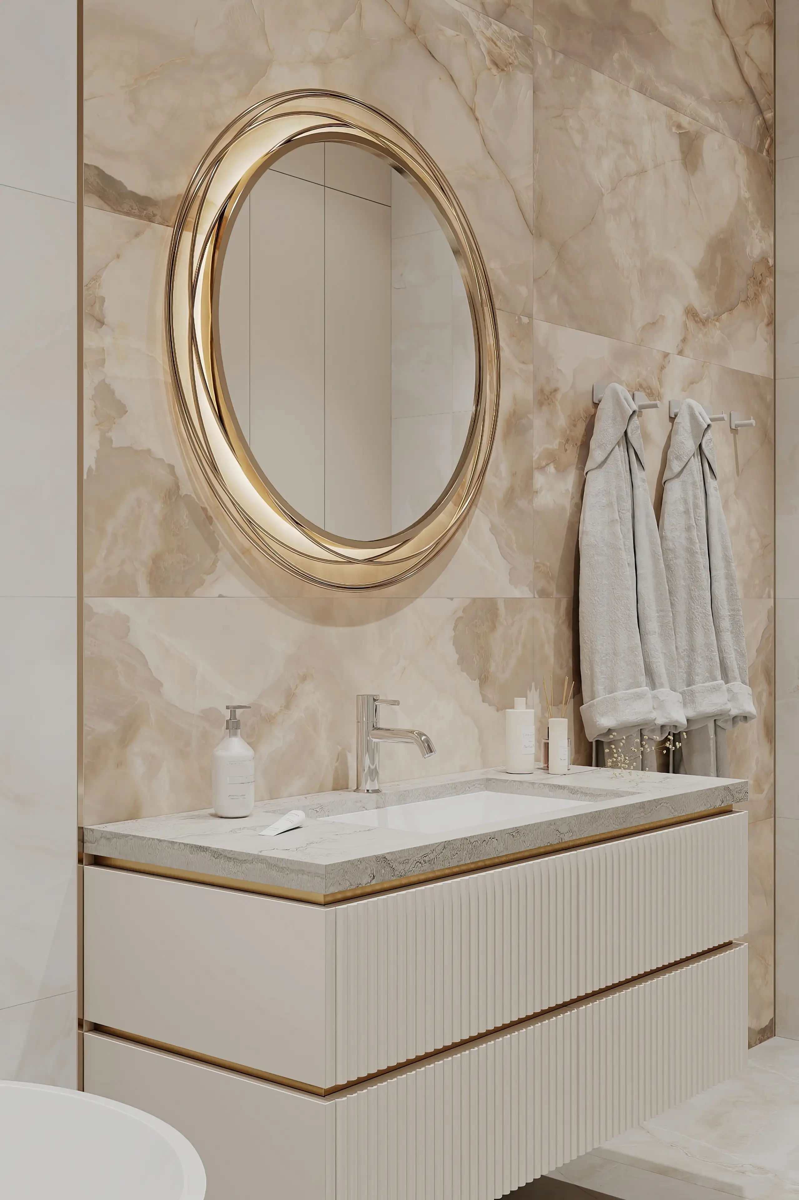 Подвесную тумбу с мраморной раковиной-столешницей и элегантное круглое зеркало с подсветкой расположили на фоне акцентной мраморной отделки тёплого розовато-бежевого тона.