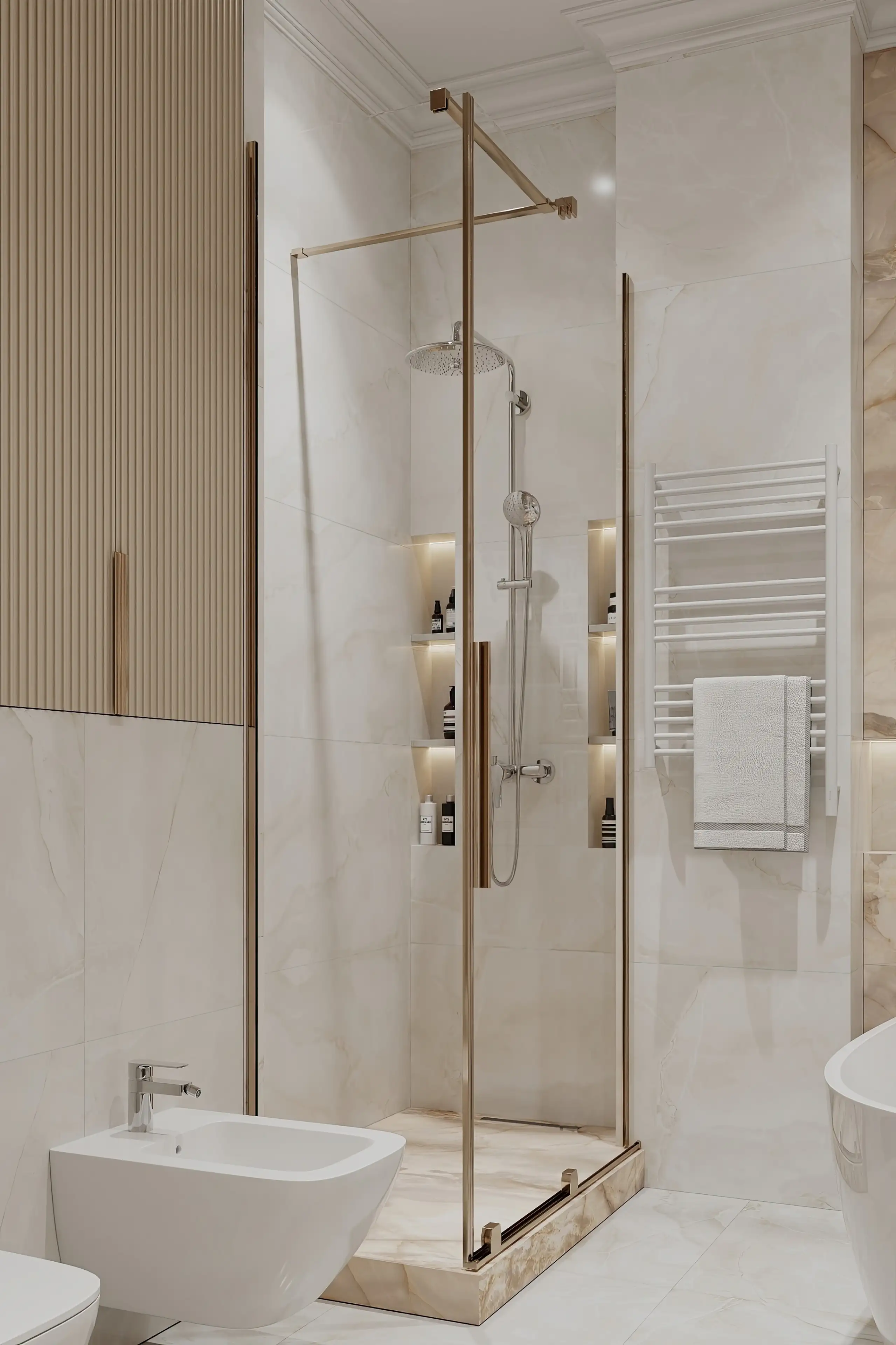 А напротив наши дизайнеры выделили зону душевой, которую ограничили лишь тонкой латунной рамой и стеклом.