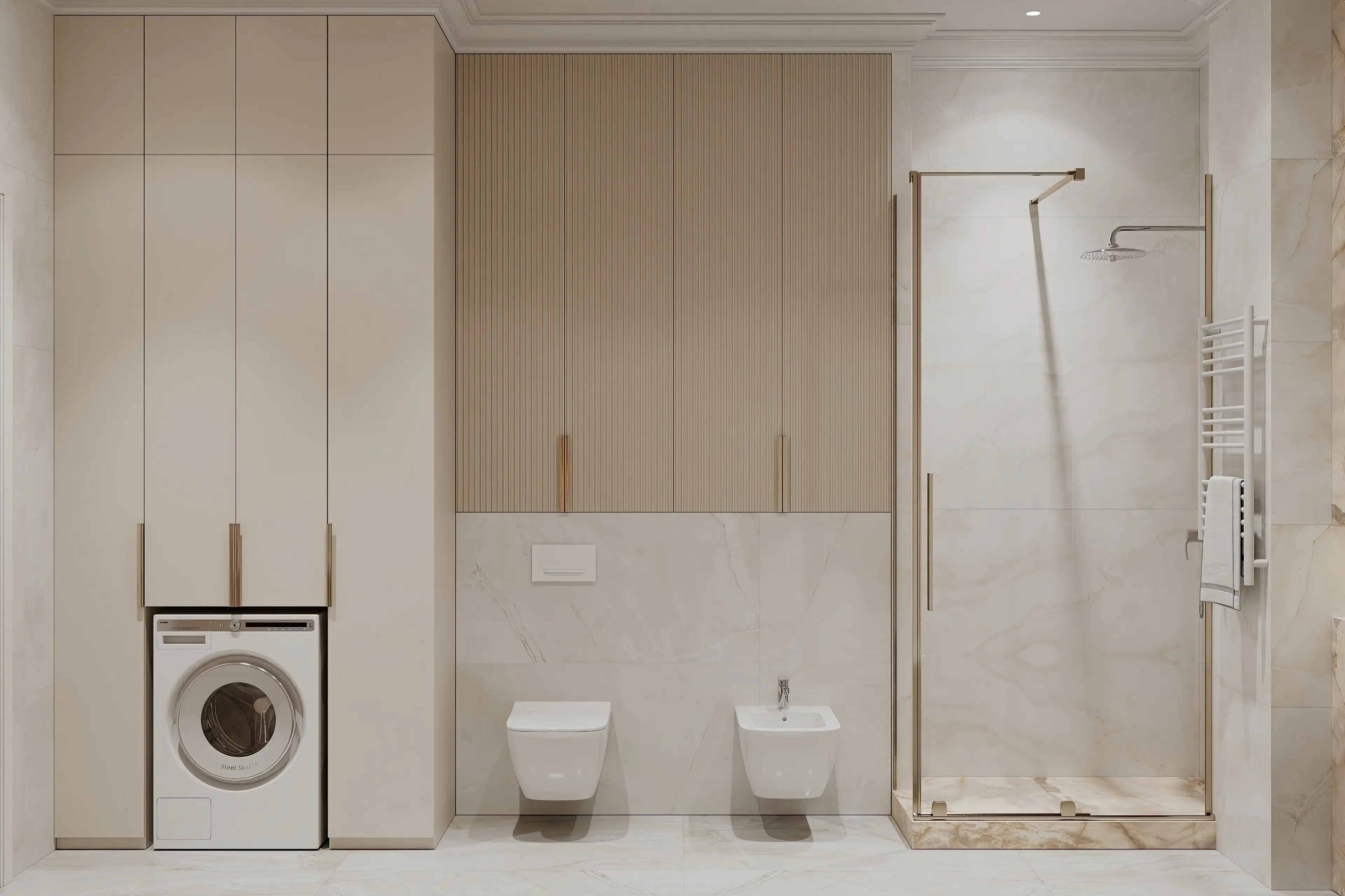 В хозяйственной зоне стиральная машинка встроена в большой вместительный шкаф, сливающийся по цвету с отделкой стен.