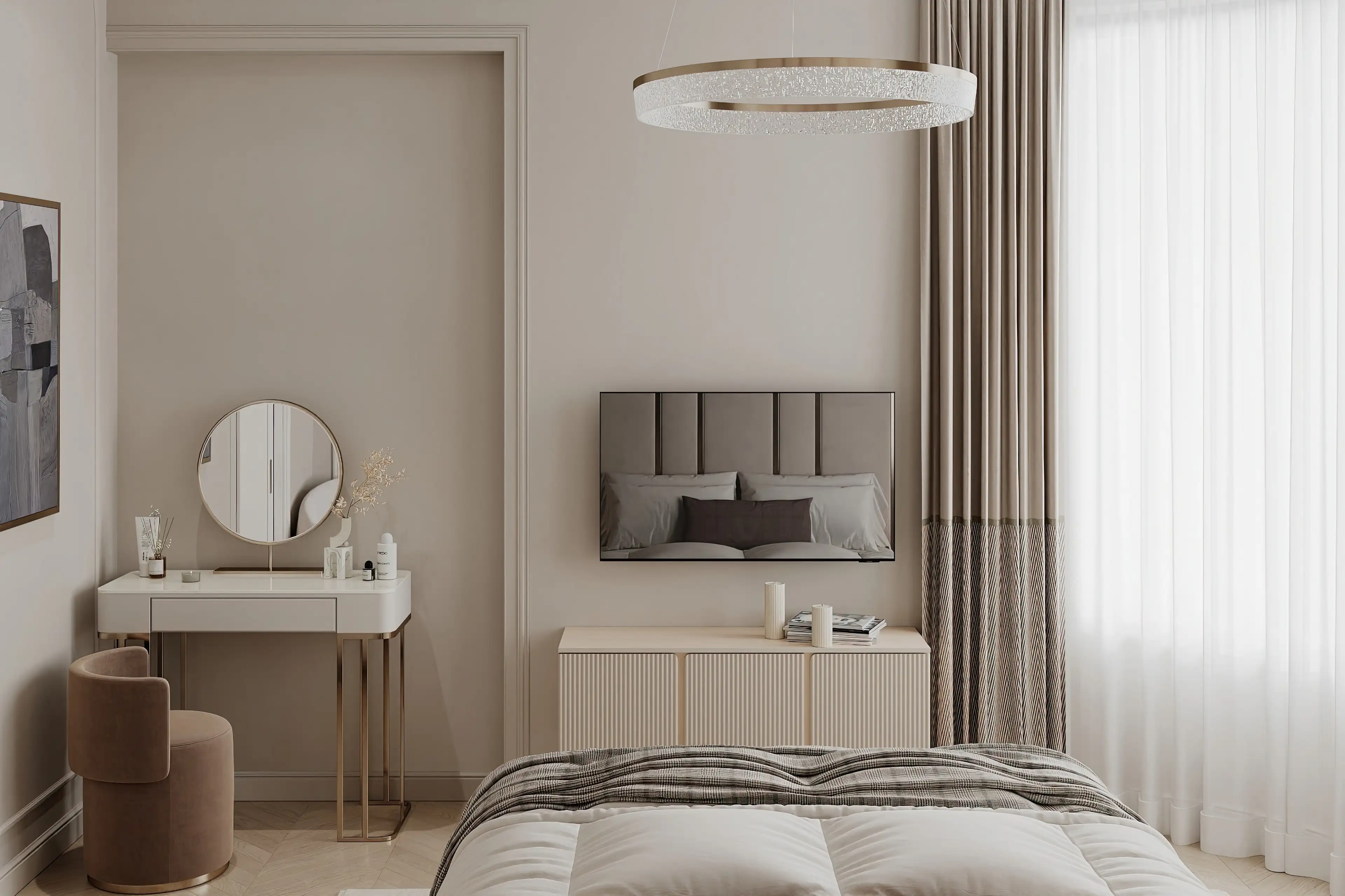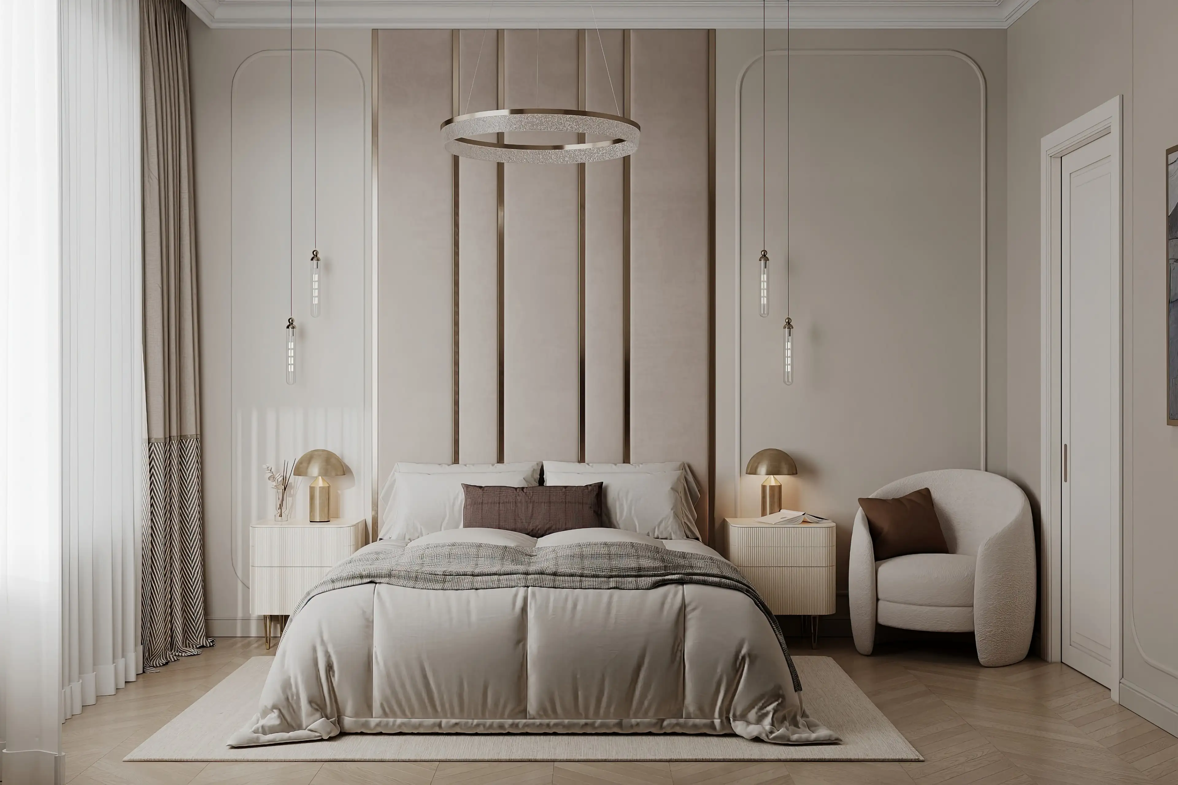 В приватном помещении спальни наши дизайнеры задают тот же тон богемной размеренной жизни, используя светлые тёплые тона в отделке и классические элементы в современном прочтении.