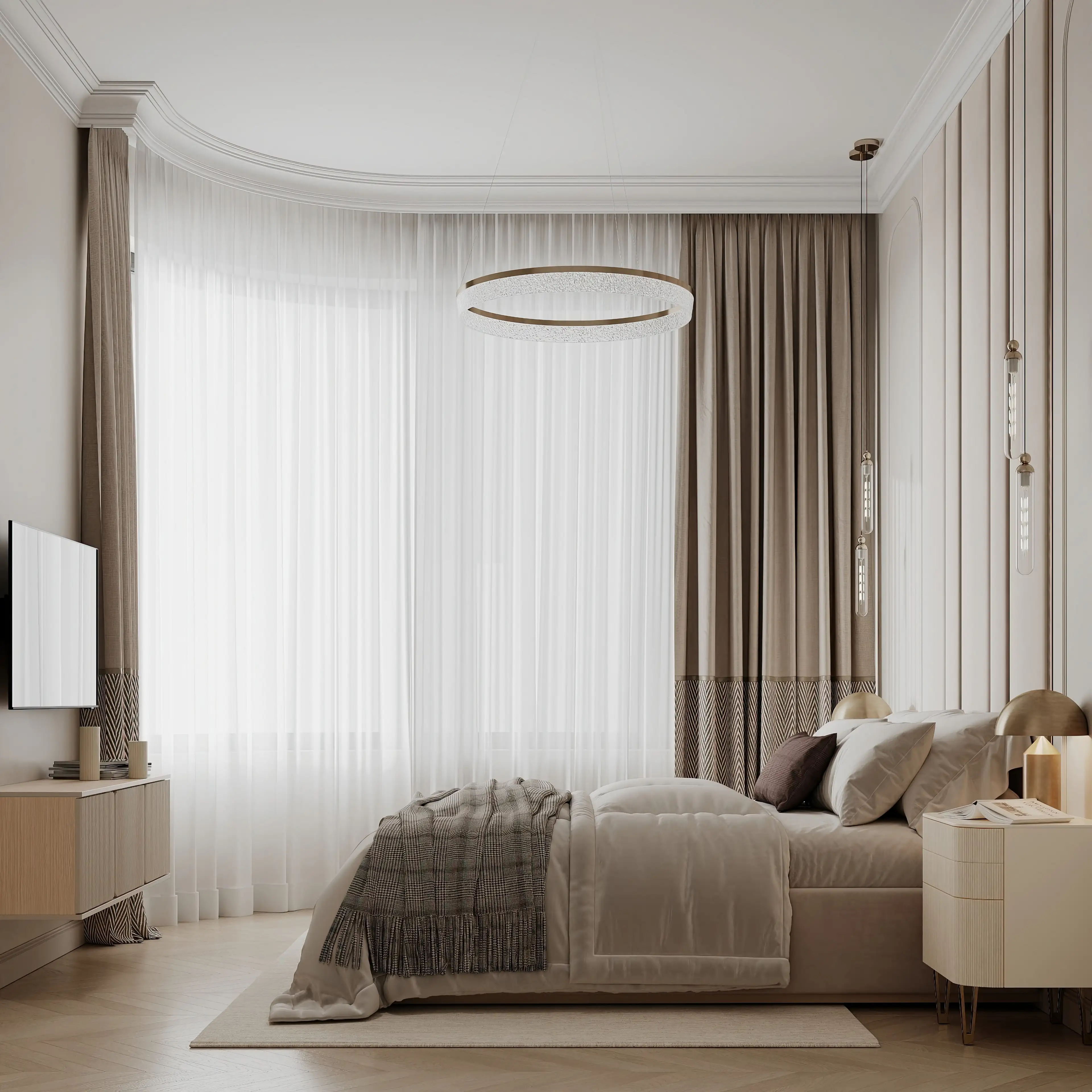 Люстру, висящую над кроватью, наши дизайнеры подобрали под стать всему интерьеру спальни – лёгкую и изящную. Она, в свою очередь, поддерживает скругление, заданное архитектурными формами помещения. Высокие радиусные окна наполняют спальню большим количеством дневного света.