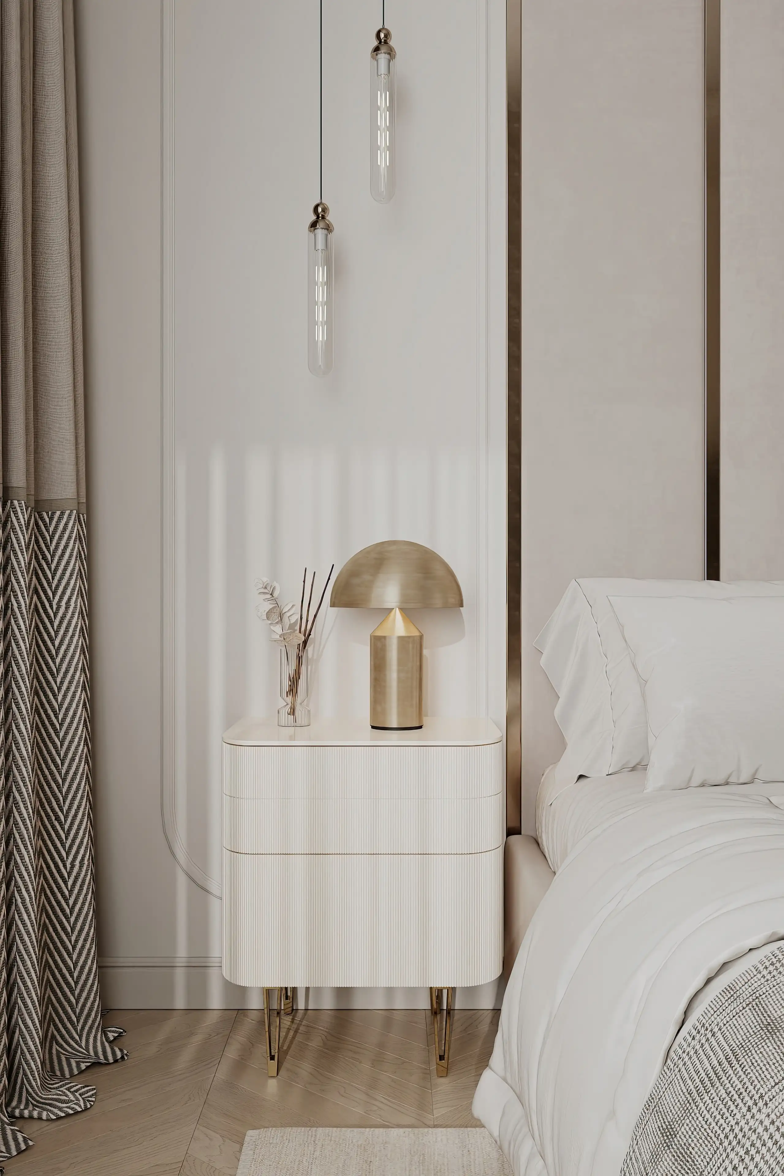 Округлые линии белых лаковых фасадов поддерживают полусферические плафоны прикроватных ламп, а подвесные декоративные светильники повторяют вертикаль отделки изголовья.