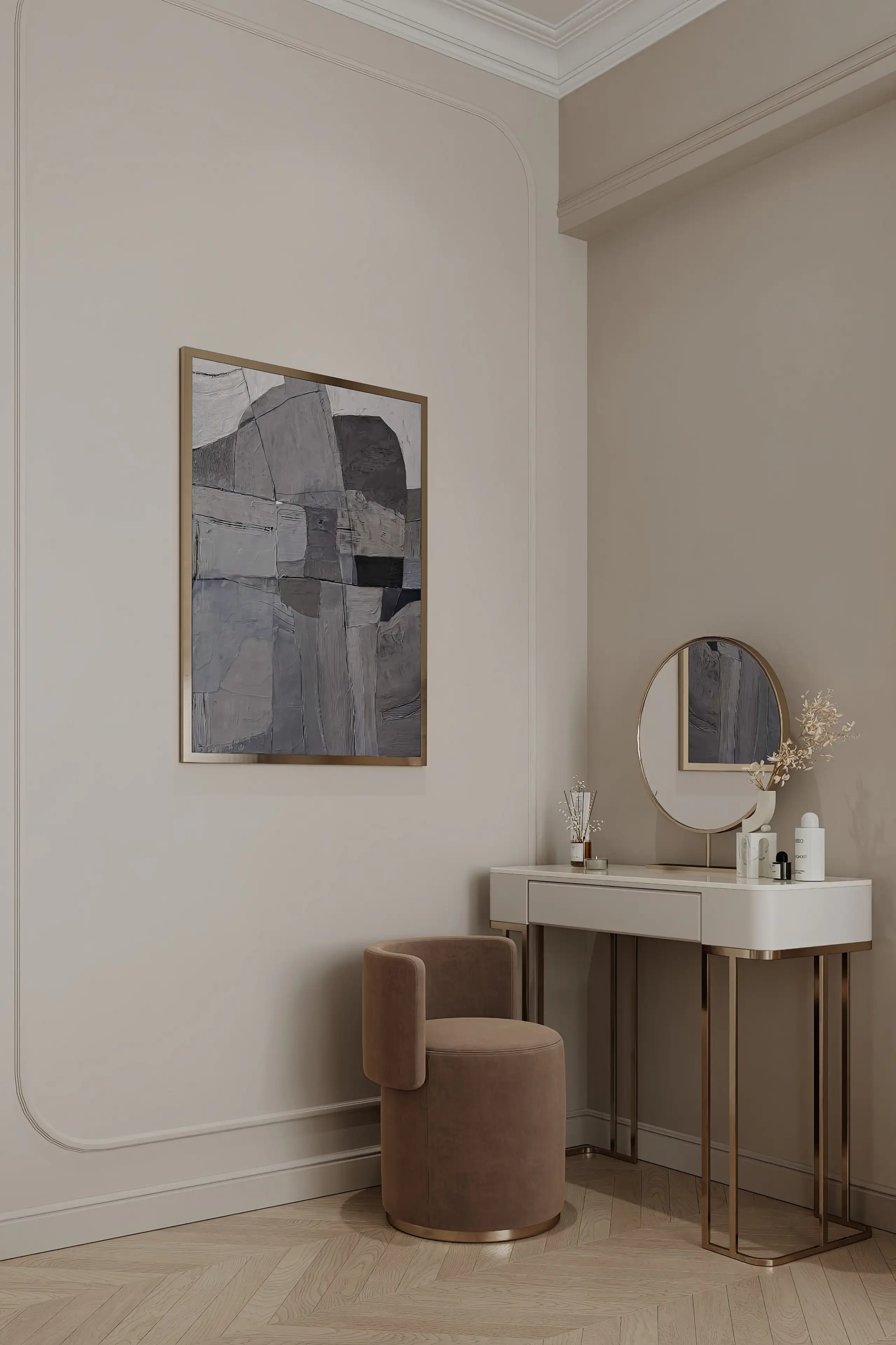 При входе наши дизайнеры обустроили открытую гардеробную секцию. Белая тумба с ящиками дополнена декоративной панелью из мягкой велюровой обивки припылённо-коричневого цвета и такой же подушкой.