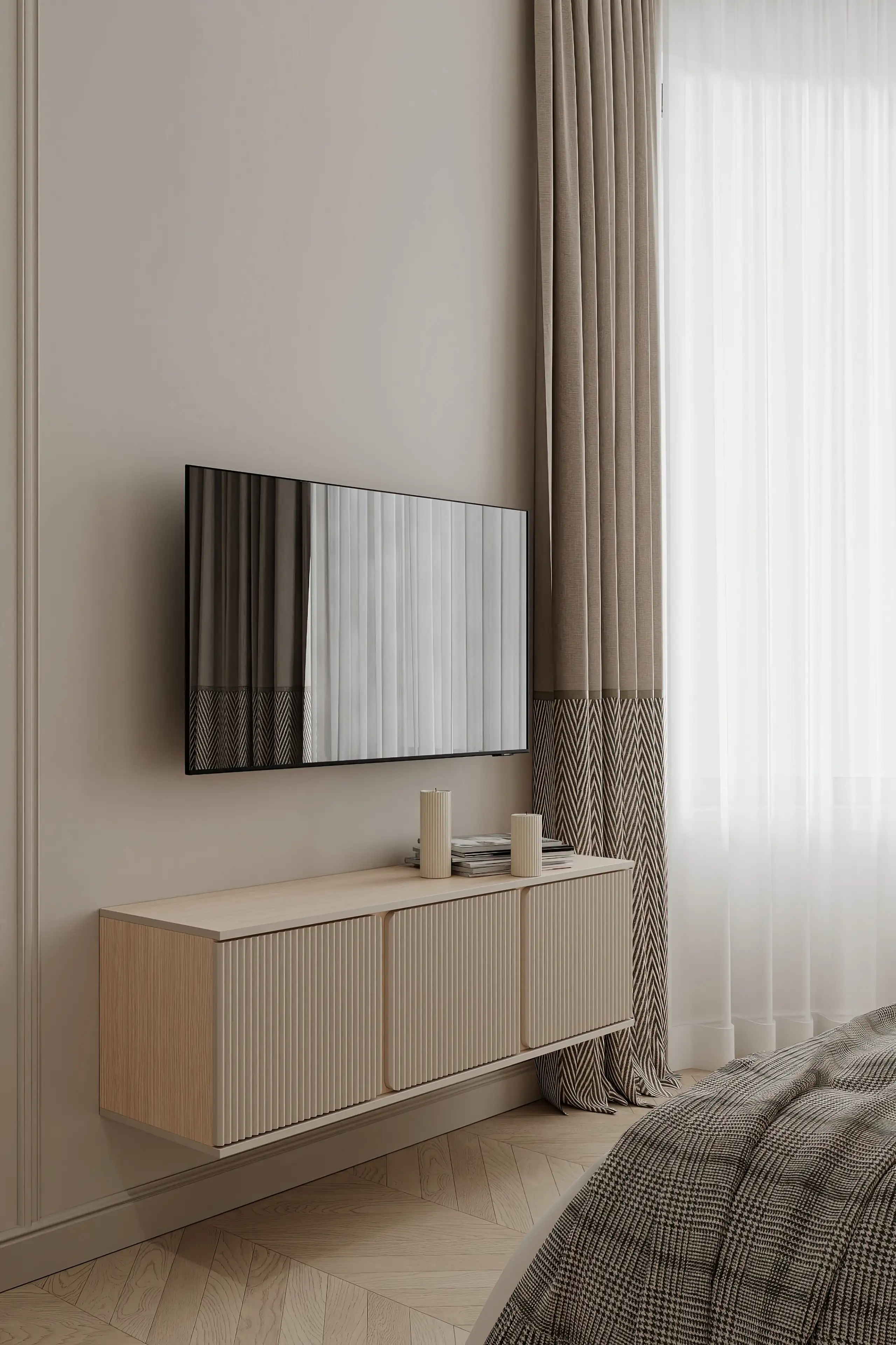 Напротив кровати дизайнеры расположили небольшую подвесную тумбу лаконичной формы из шпона светлого дерева с рельефными фасадами и плазменную панель.