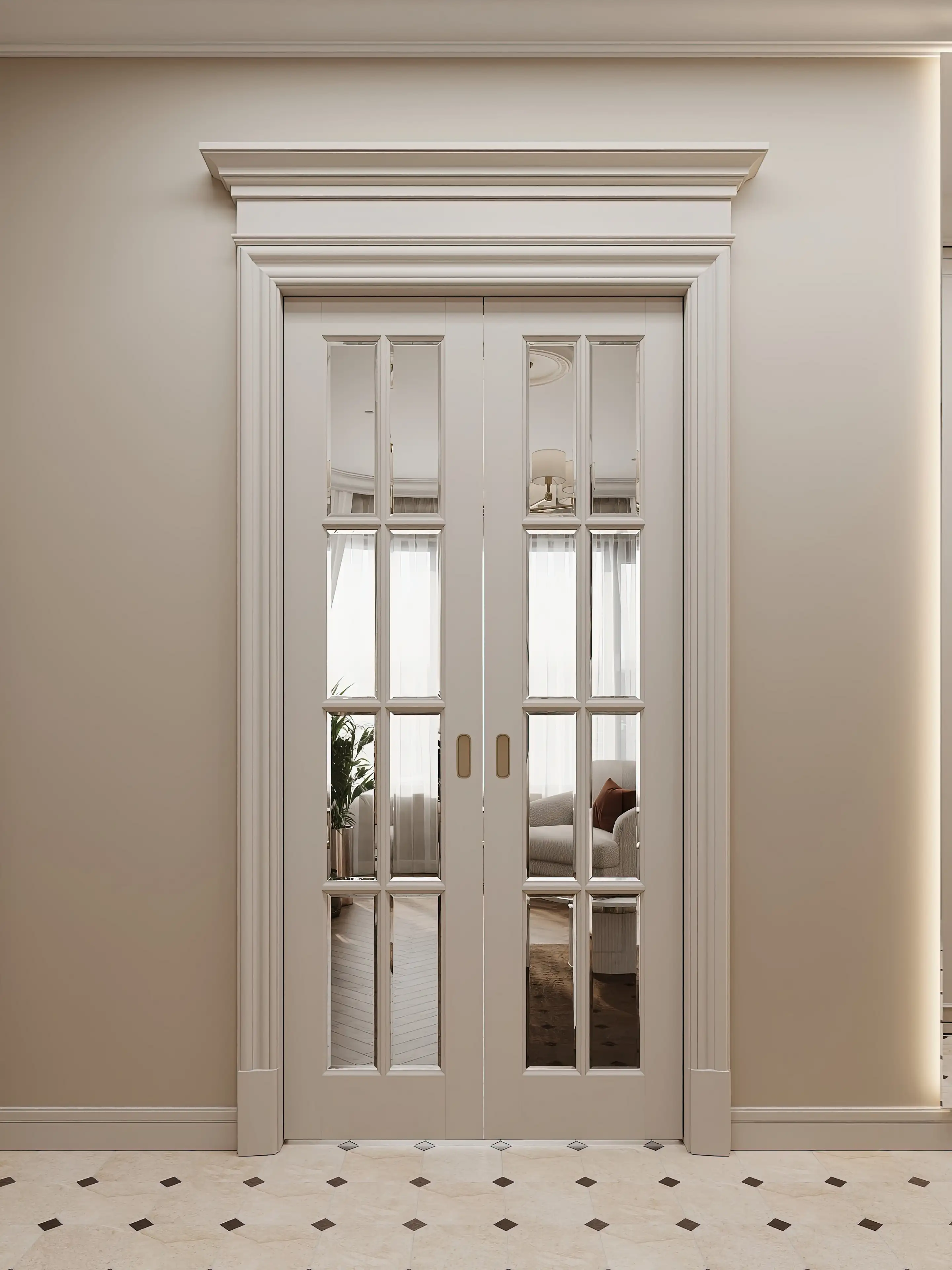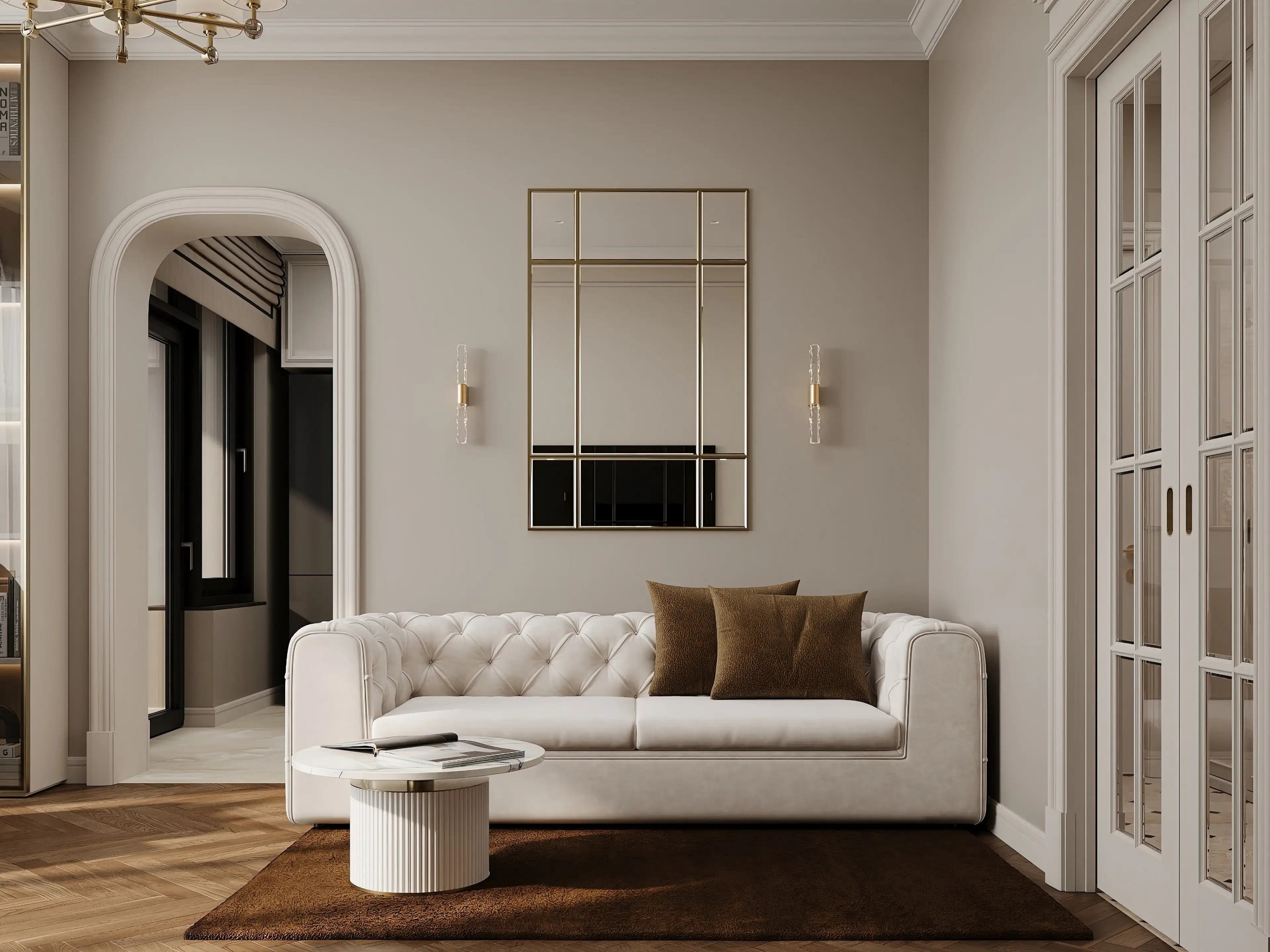 Ровно напротив входа в квартиру мы видим раздвижные стеклянные двери с раскладкой, которые ведут в гостиную — сердце дома, где классика изящно сплетается с современностью. Светло-бежевые стены с молдингами наполняют пространство воздухом и светом.
