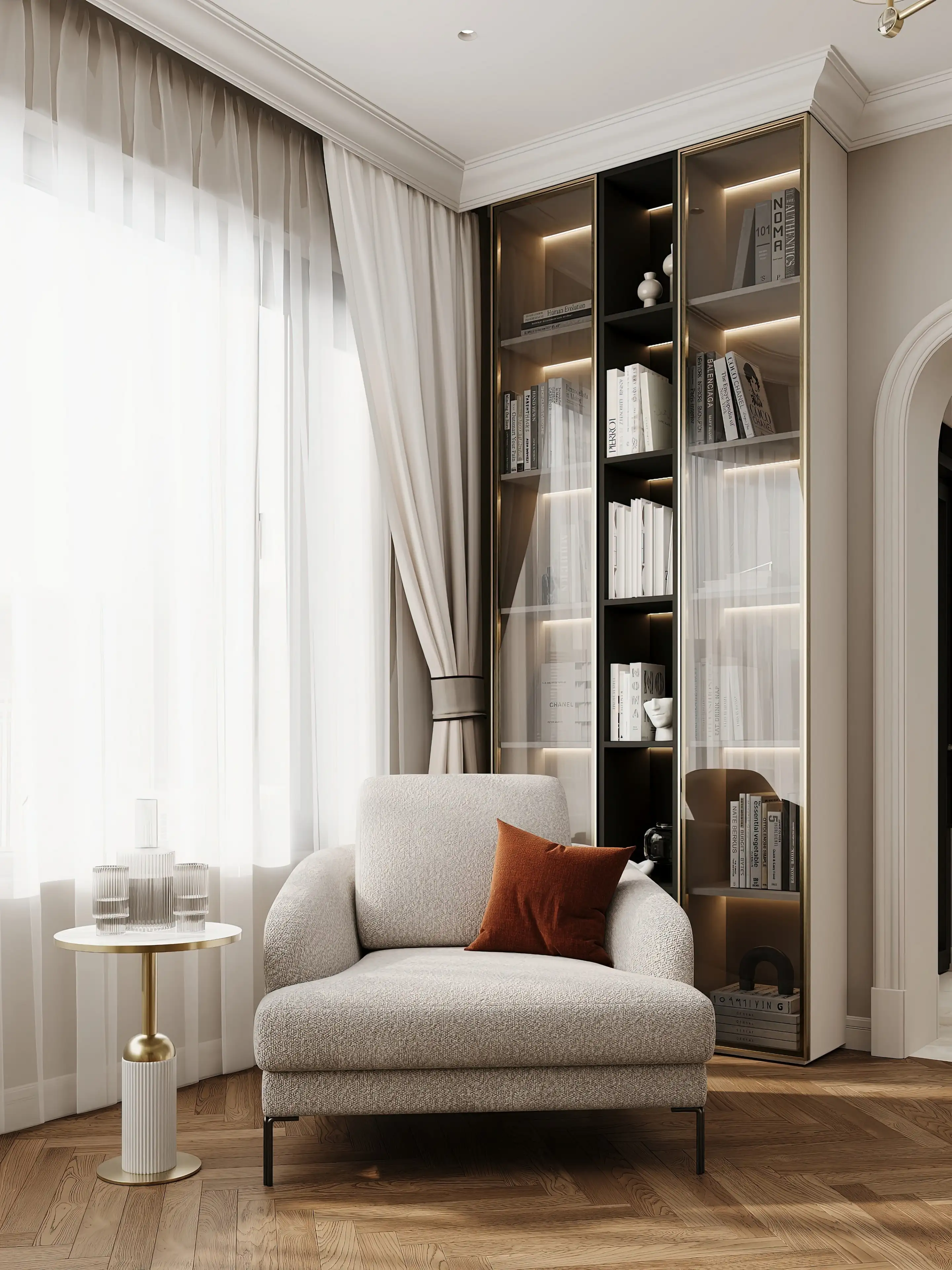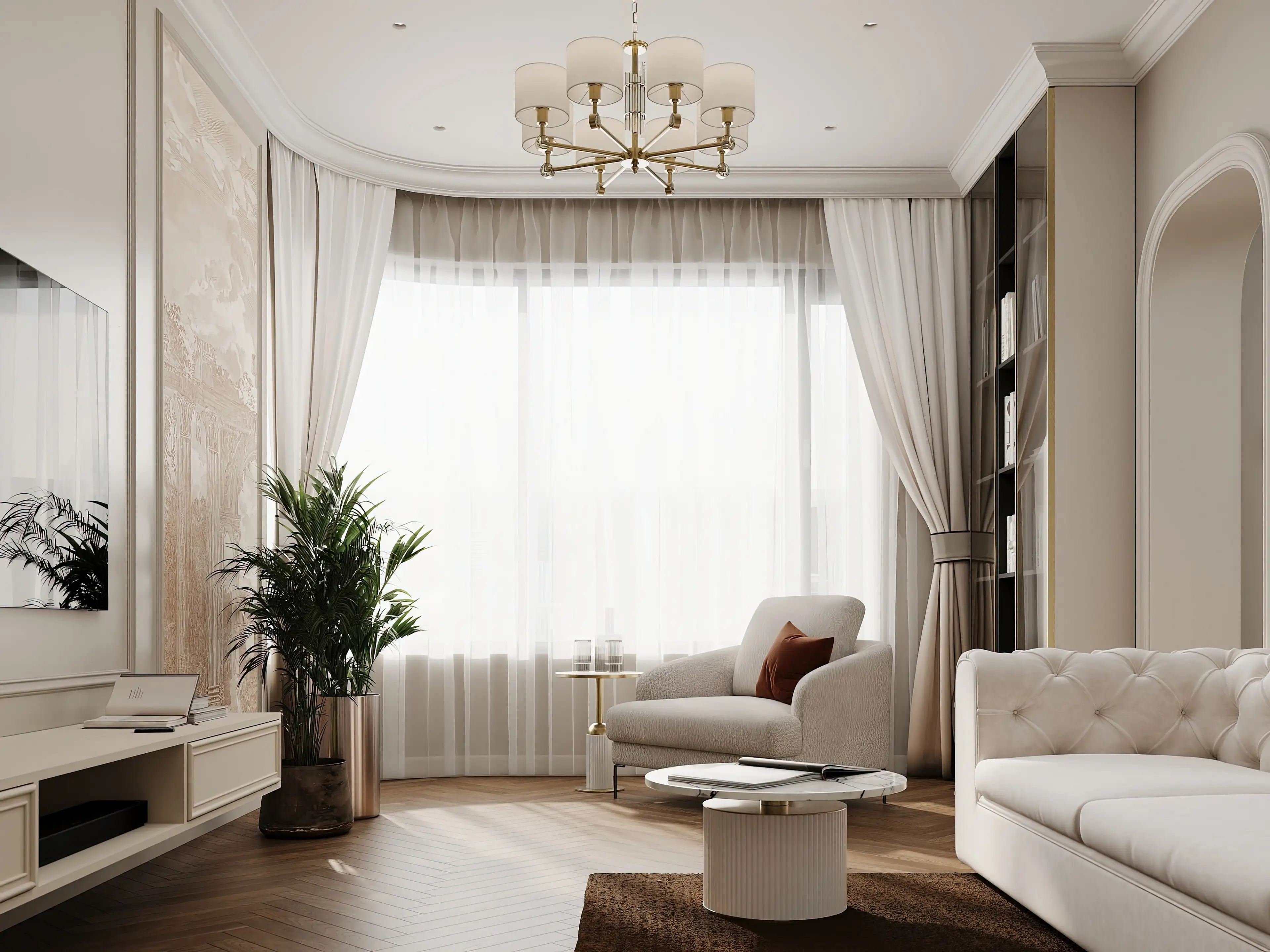 Радиусное окно щедро льёт естественный свет. У окна — кресло молочного оттенка и латунный кофейный столик. Между окном и кухней — шкаф с прозрачными дверцами, с тёмной внутренней отделкой и подсветкой. На стене напротив — фреска с развалинами в бежевых тонах. Живые акценты вносят растения в латунных и деревянных напольных горшках.
