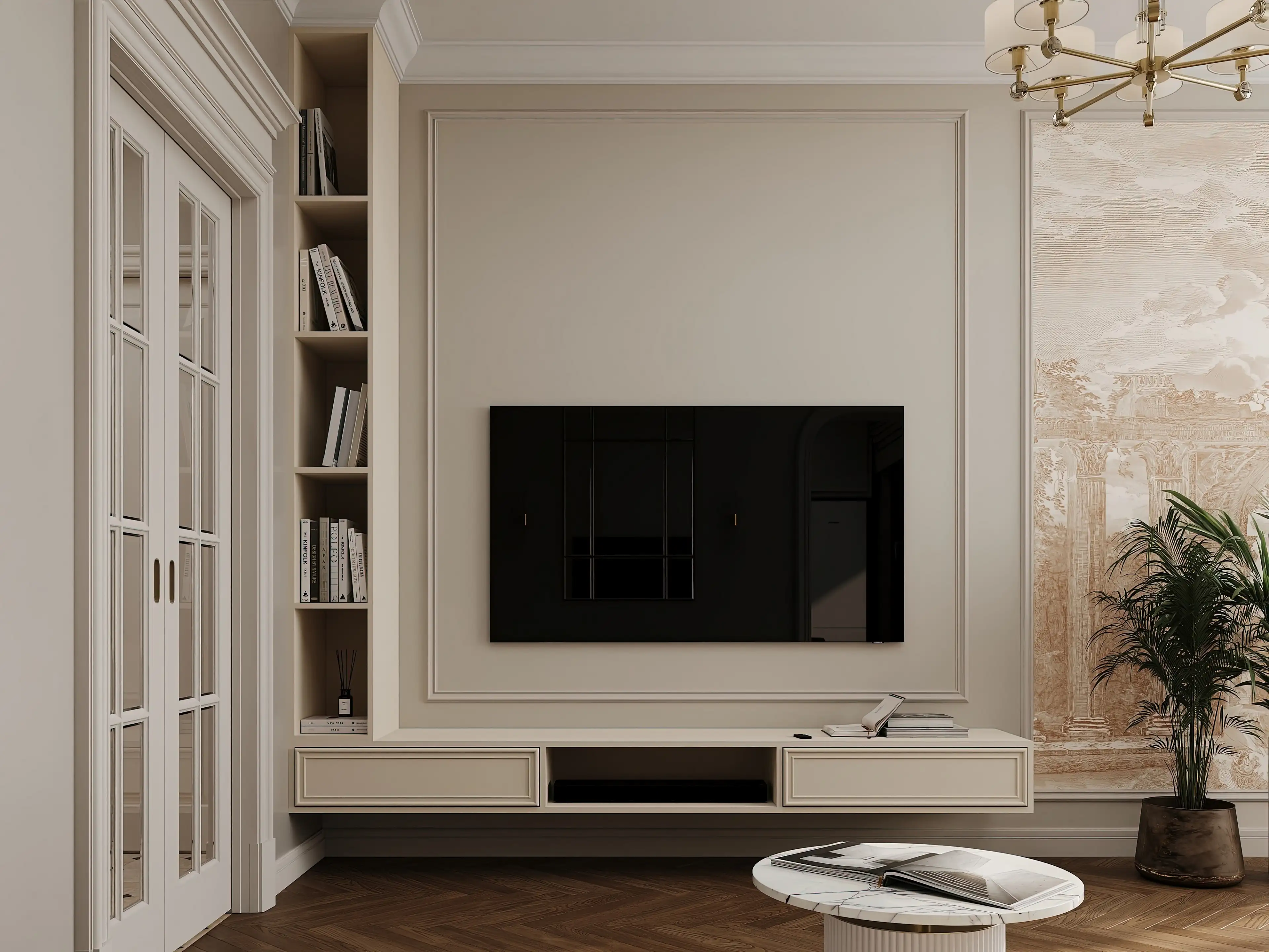 Справа от входа мы расположили белый бархатный диван с отделкой в технике капитоне́. Его плавные линии и мягкая фактура дарят ощущение уюта. За диваном — зеркало с латунной раскладкой, перекликающееся с дверями. По бокам от зеркала — изящные бра, льющие тёплый свет. Напротив дивана — телевизионная зона со светлой низкой тумбой и узким высоким стеллажом для книг и декора. В зоне дивана гармонично сошлись мягкий коричневый ковёр, диванные подушки в тон и мраморный столик с рифлёной опорой.