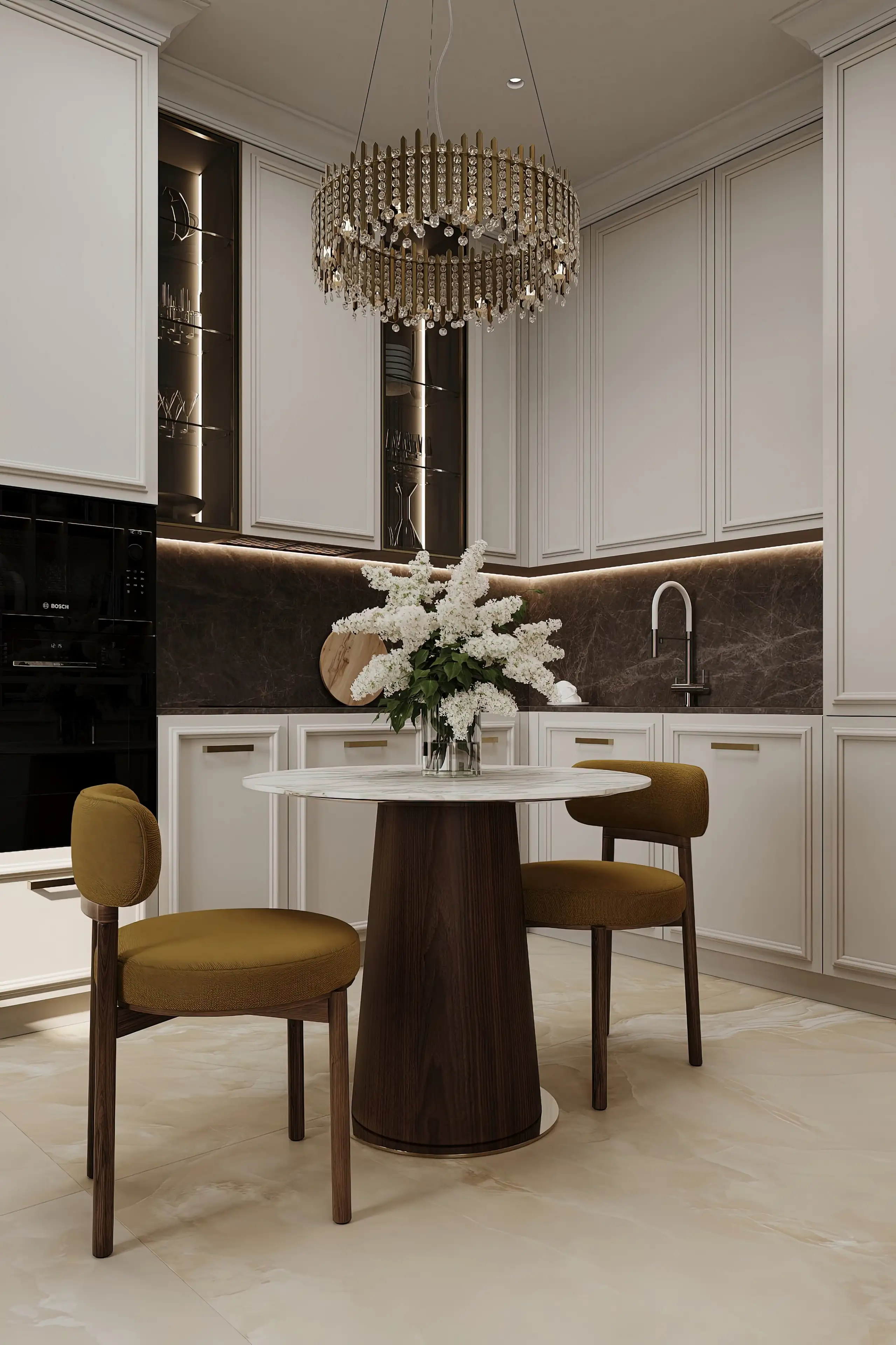 Акцент — фартук из кофейного кварцевого агломерата с мраморной фактурой: он придаёт глубину и игру цвета. Верхние шкафы со стеклянными дверцами оживляют пространство — контрастная отделка и подсветка эффектно презентуют предметы, стоящие на полках.