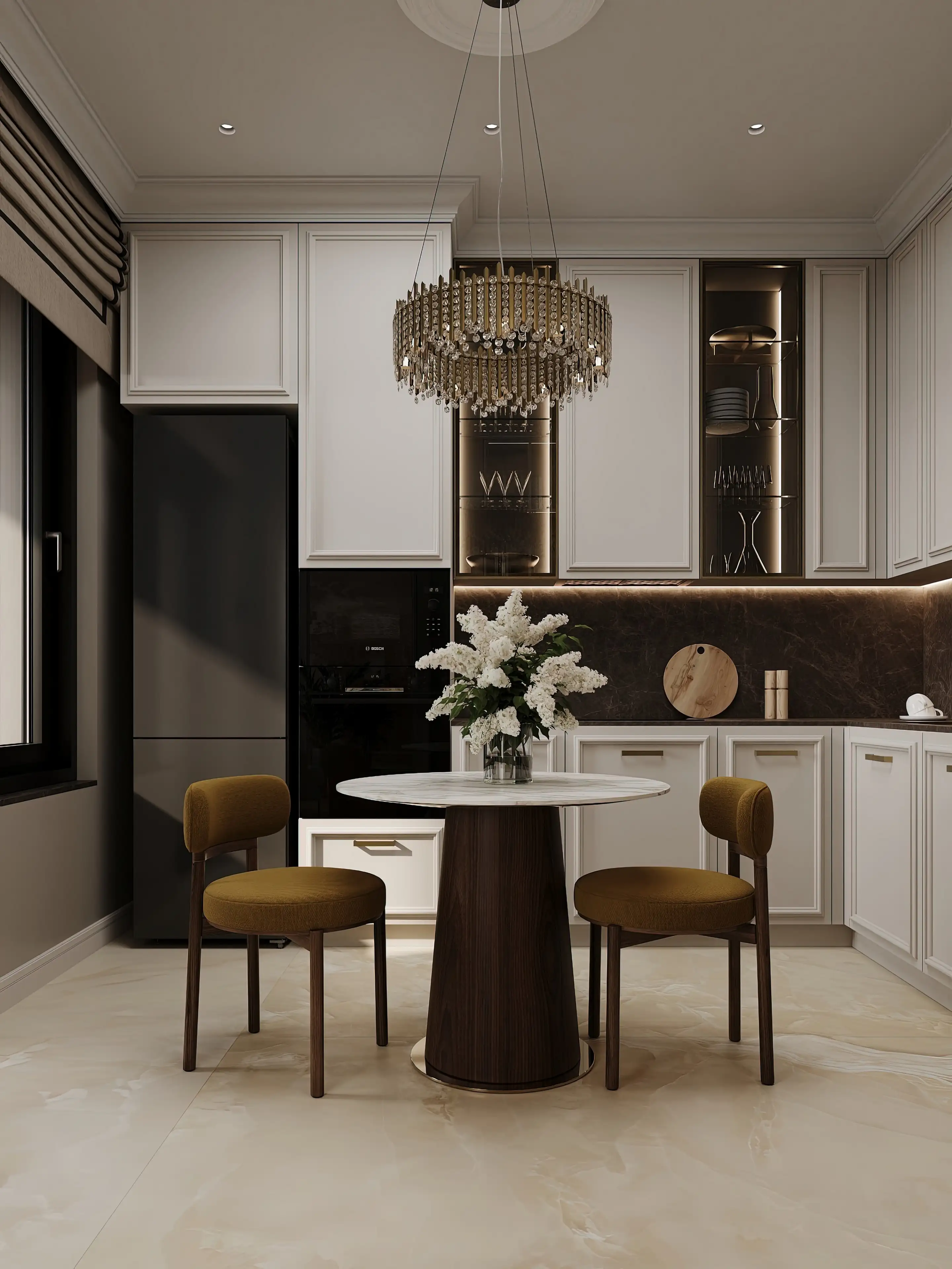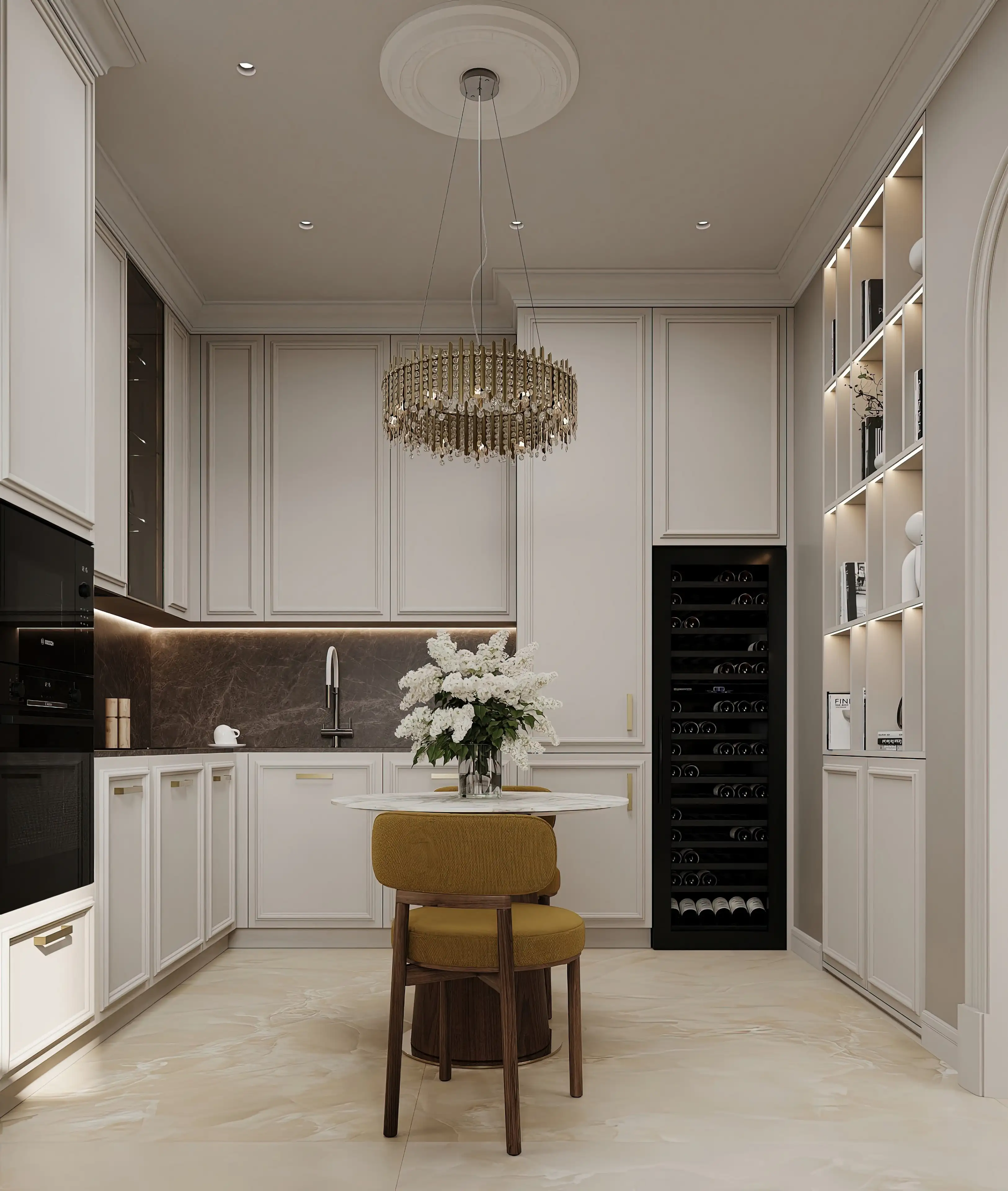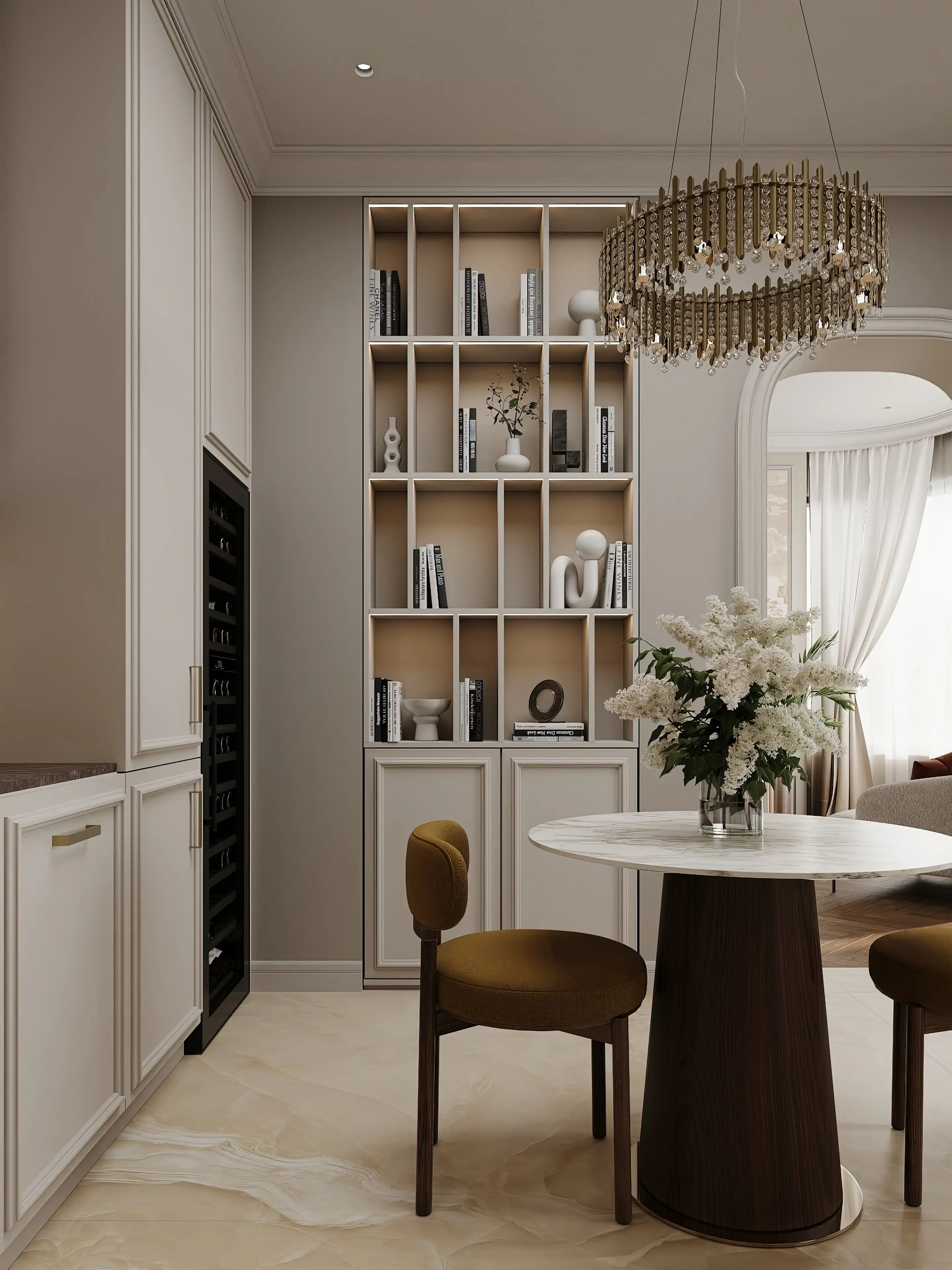 Интерьер ведёт тонкий диалог между прошлым и настоящим: молдинги и капитоне́ соседствуют с лаконичными формами, а природные текстуры в сочетании с металлом создают умиротворённый, но выразительный уют — словно каждая деталь шепчет о вкусе и любви к прекрасному.