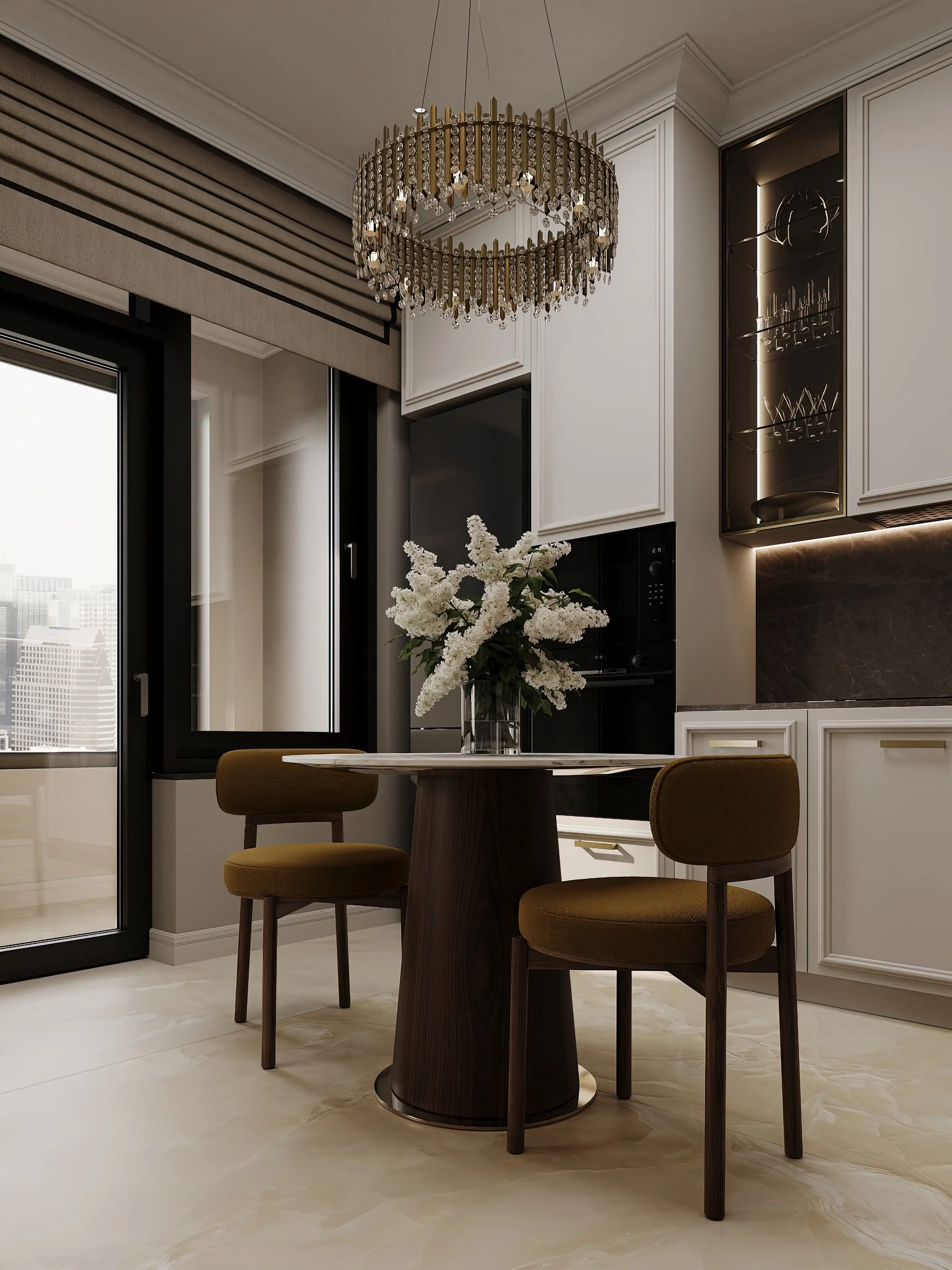 Центр обеденной зоны — круглый стол со светлой мраморной столешницей, перекликающейся с фартуком. Конусовидное подстолье из тёмно-коричневого шпона и два мягких полукресла ему в тон создают атмосферу для неспешных трапез.