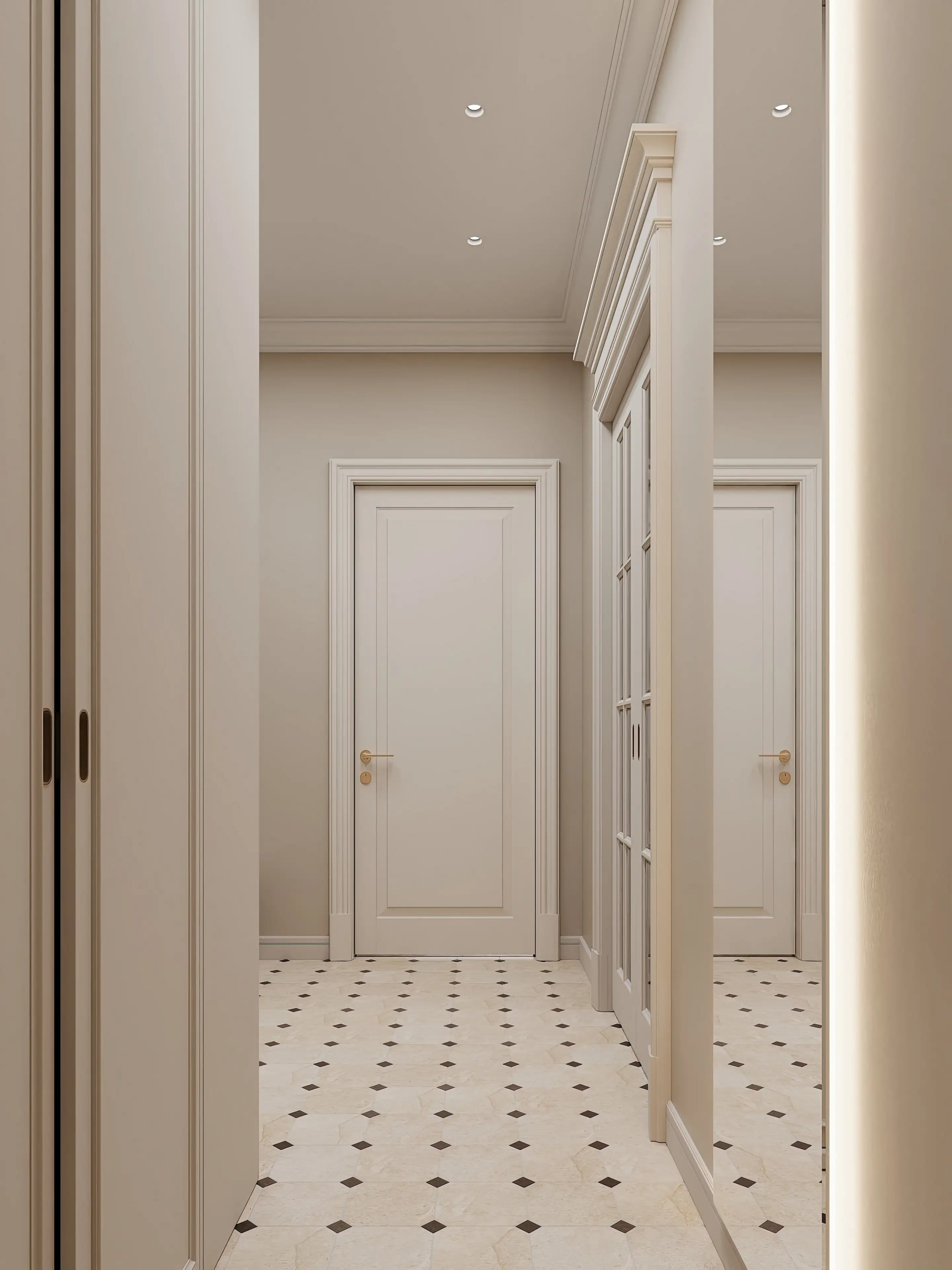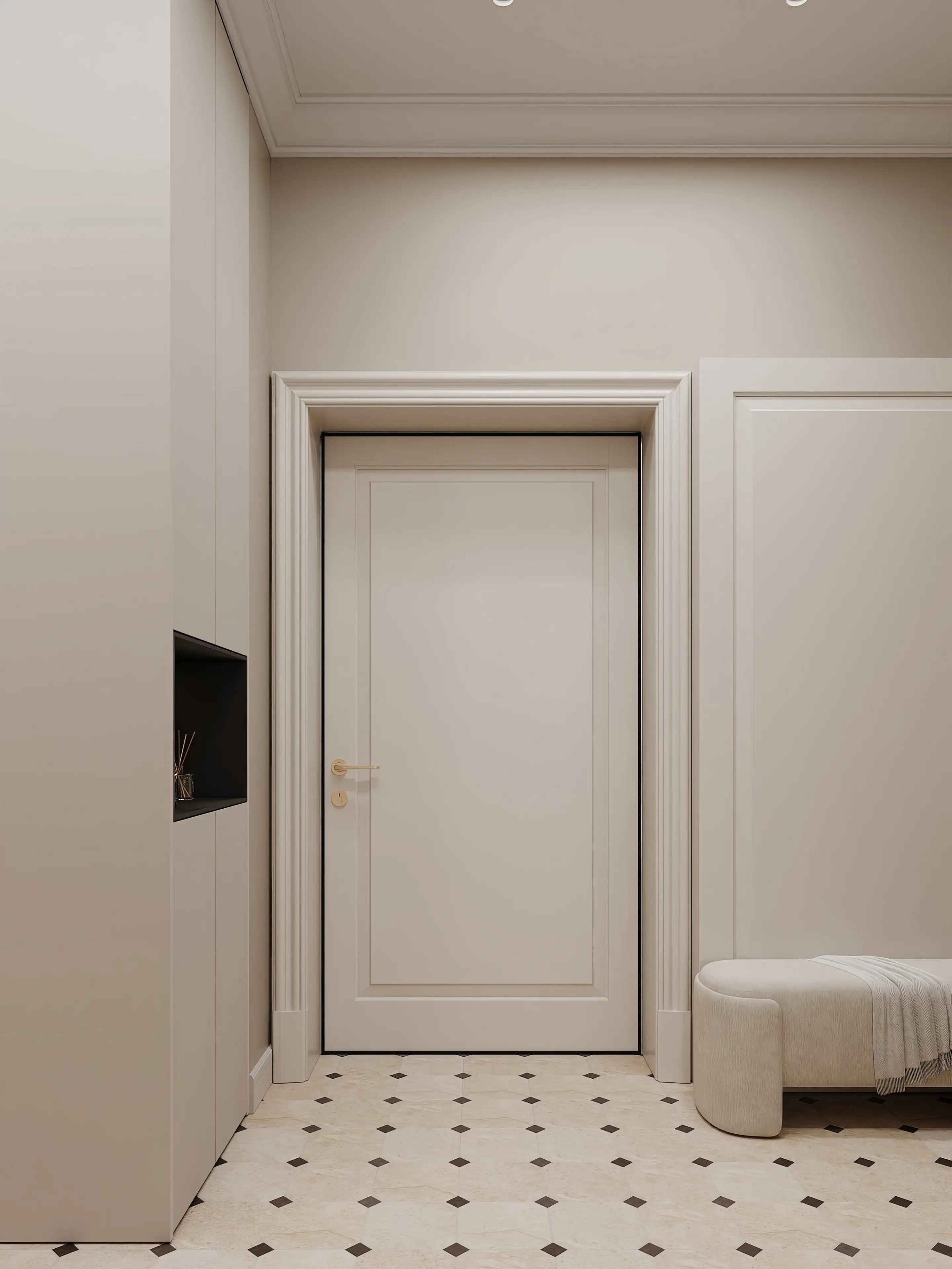 Входя в квартиру, мы попадем в прихожую — просторную, аккуратную, с мягким оттенком топлёного молока на стенах, создающим уютную атмосферу. Пол — матовый светлый керамогранит с чёрными вставками, придающими динамику пространству.
