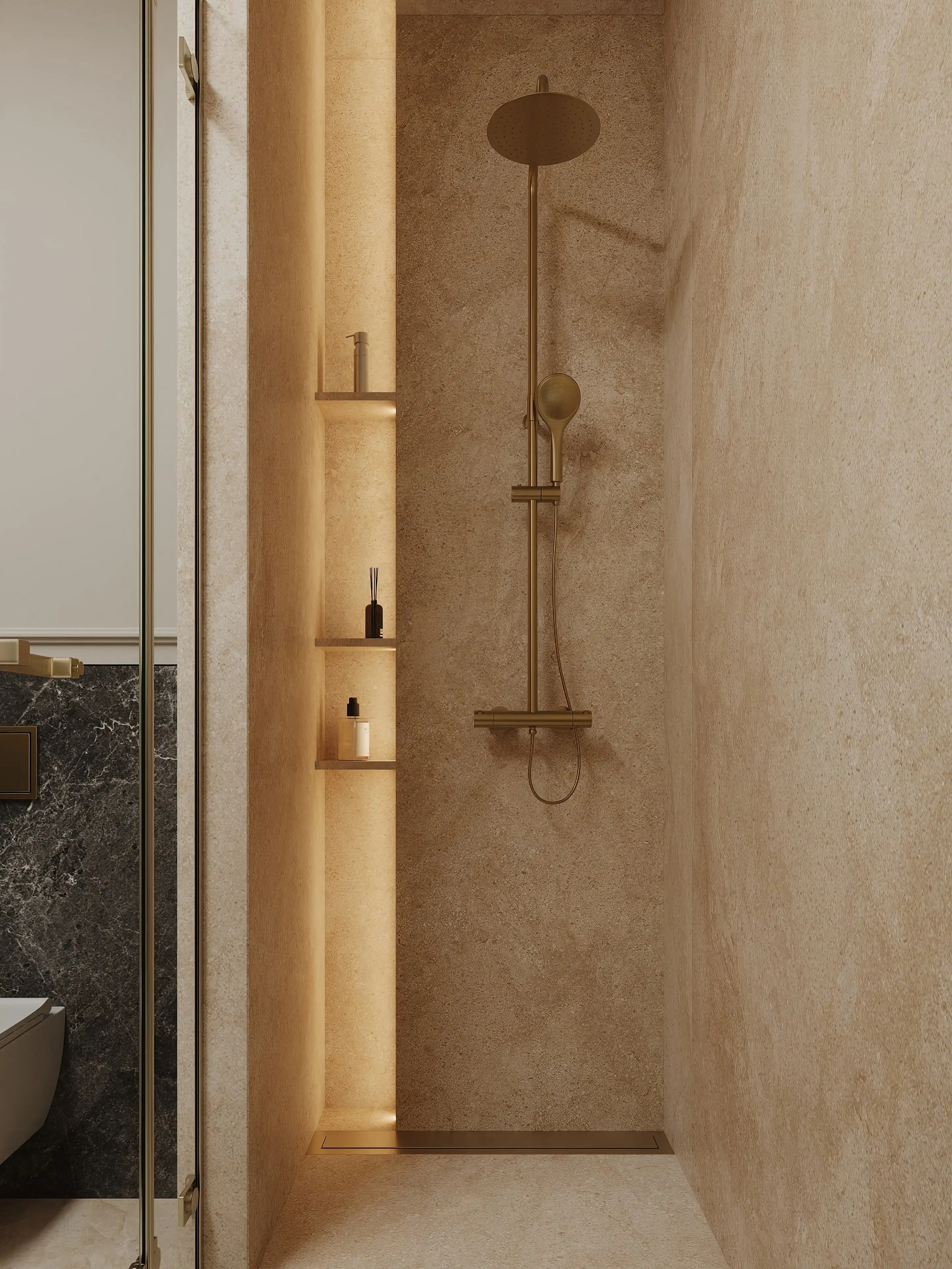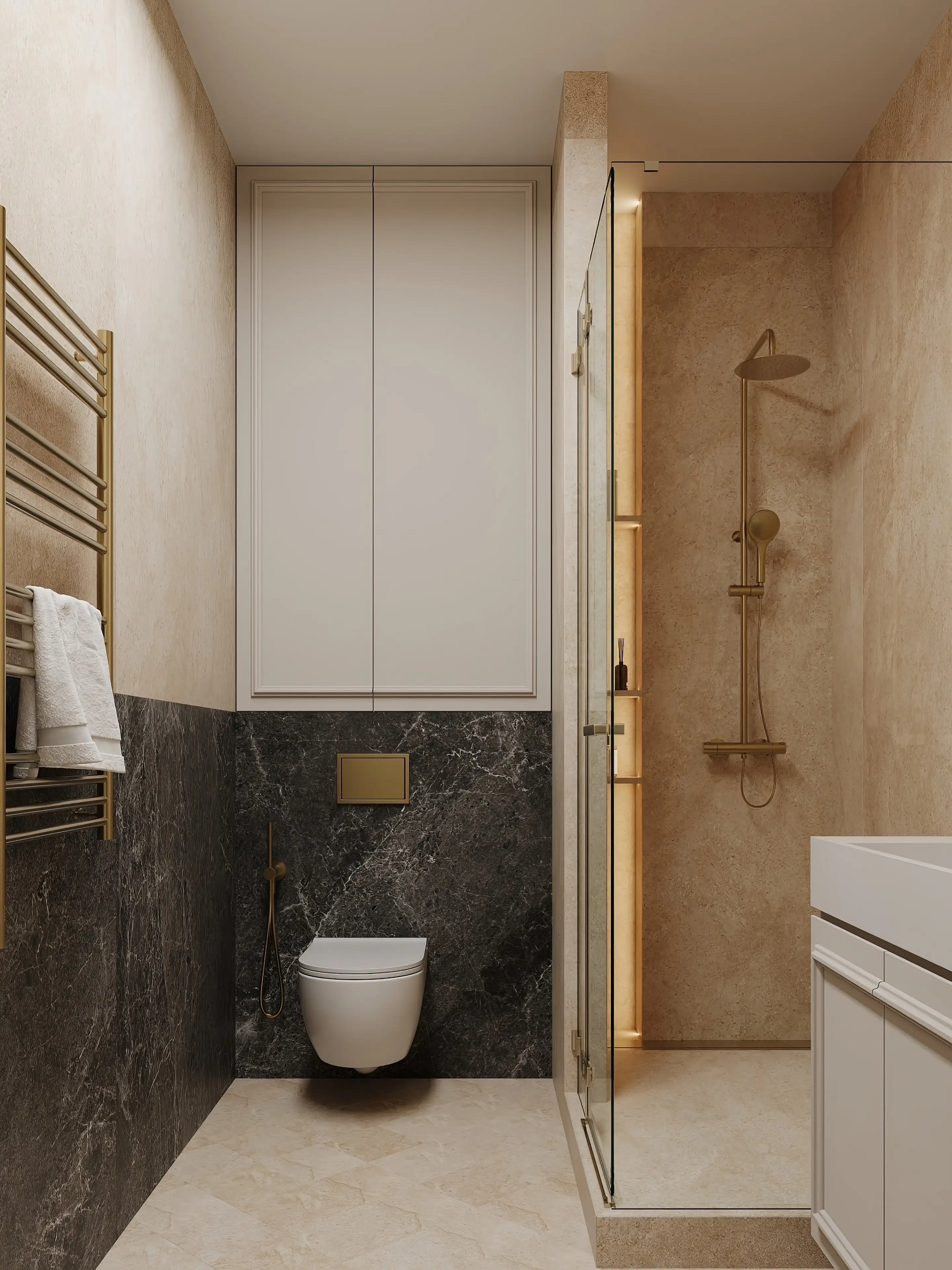 Ключевая особенность — скрытая постирочная: техника спрятана за дверцами, что сохраняет чистоту линий и избавляет пространство от визуального шума. Контраст белых раковины и унитаза с тёплым керамогранитом подчёркивает свежесть интерьера, а латунные элементы (сантехника и полотенцесушитель) вносят благородные металлические отблески.