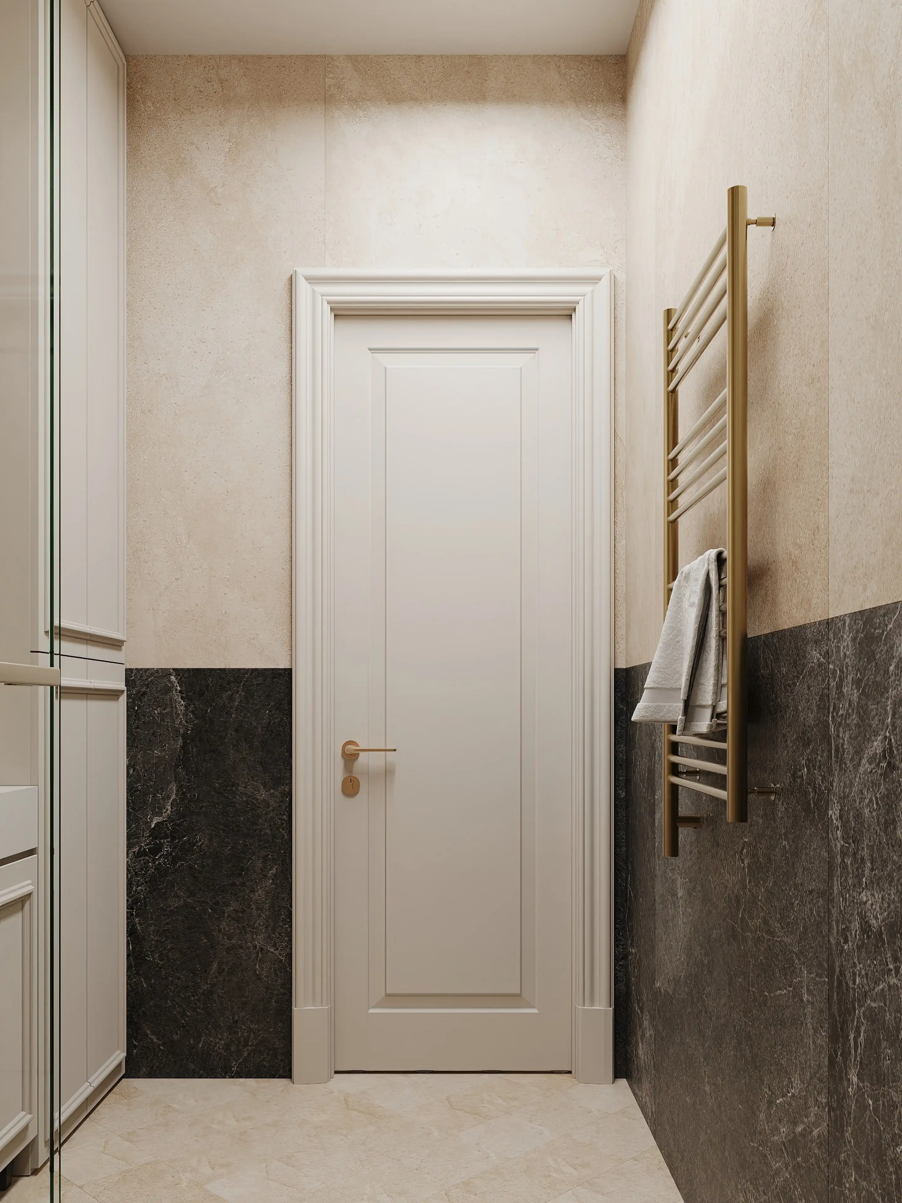 Справ от входной двери находится санузел, совмещённый с постирочной зоной. Это помещение гармонично сочетает функциональность и эстетику. Стены и пол облицованы бежевым керамогранитом с мраморной текстурой — его мерцающие прожилки создают ощущение тепла натурального камня.