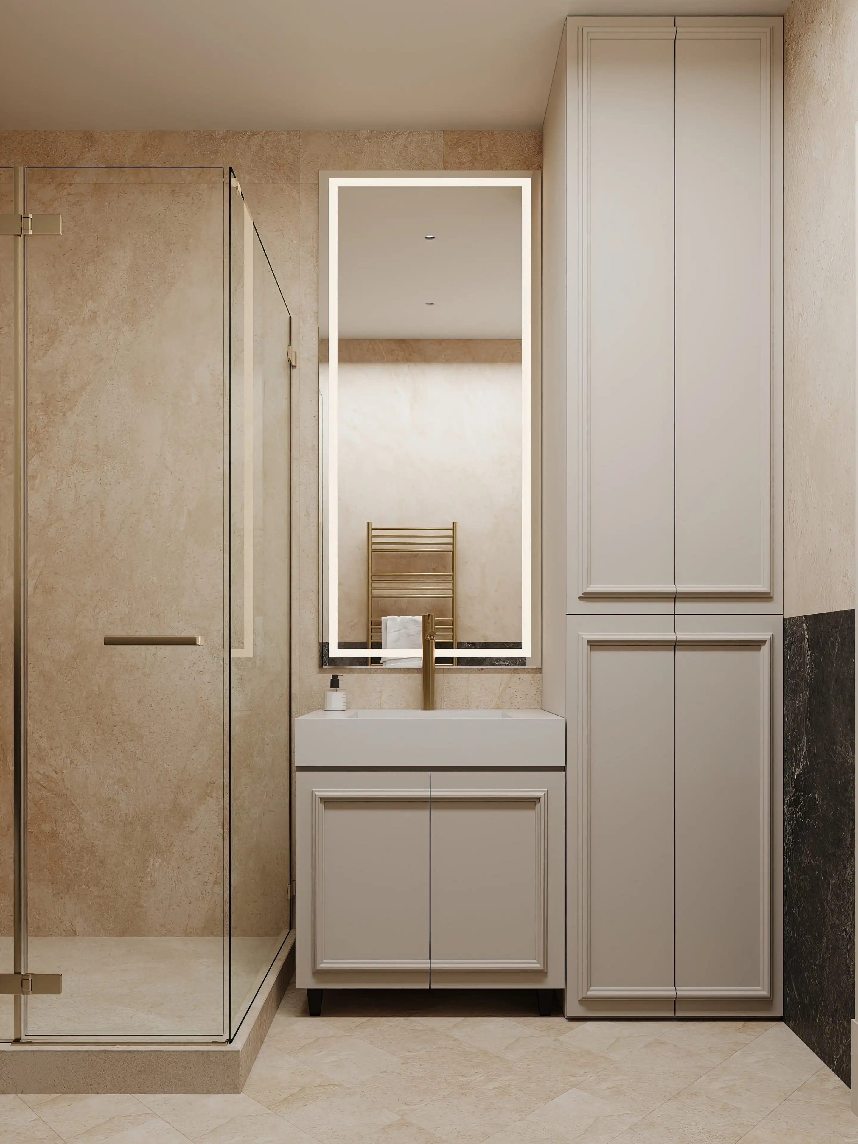 Функциональные детали продуманы до мелочей: встроенная ниша в душевой с подсветкой, закрытые шкафы молочного цвета, высокая тумба под раковиной и зеркало с контурной подсветкой. Точечное потолочное освещение равномерно заполняет пространство мягким светом. В итоге получился сбалансированный интерьер, где каждая деталь работает на удобство и красоту.